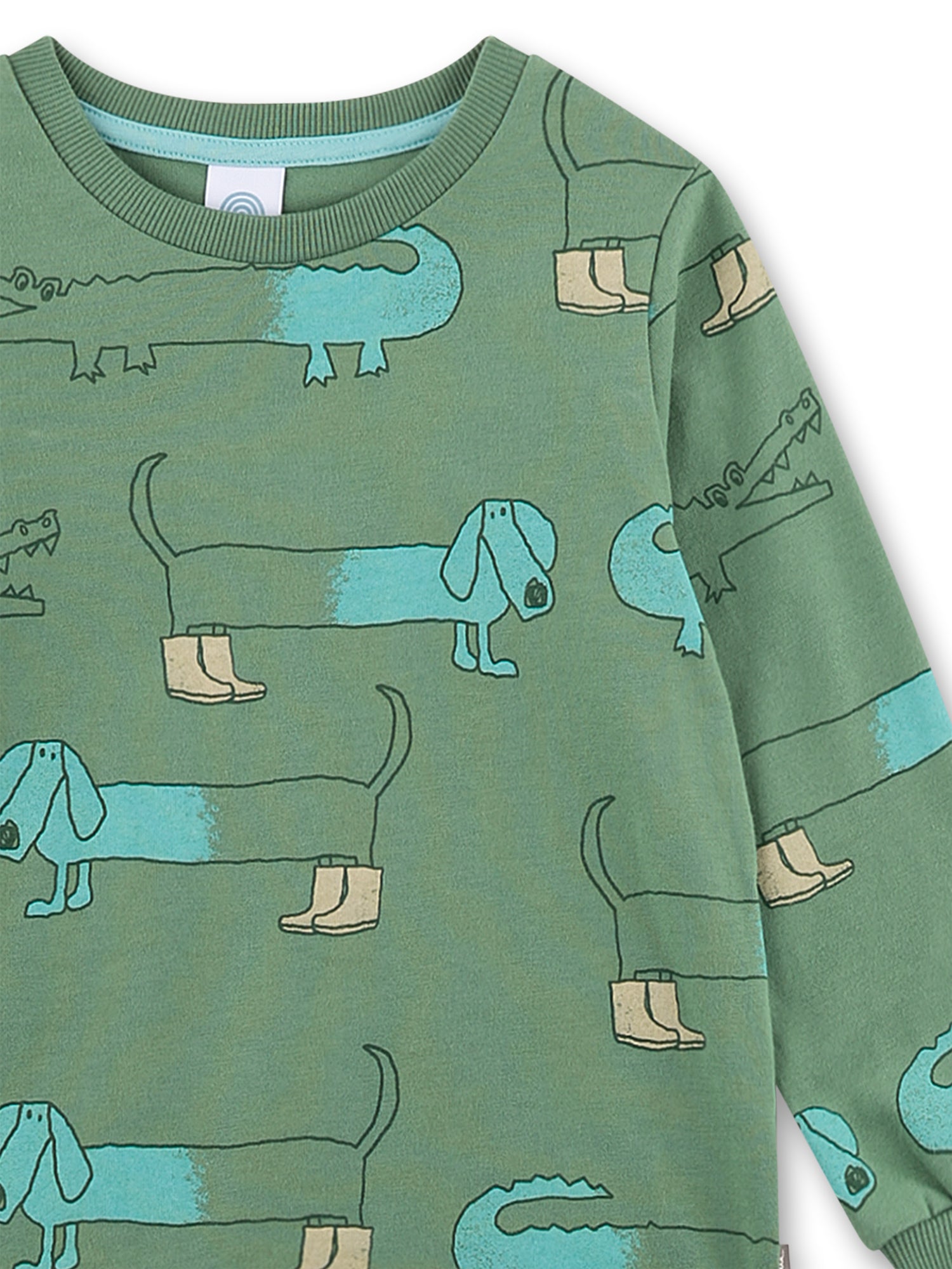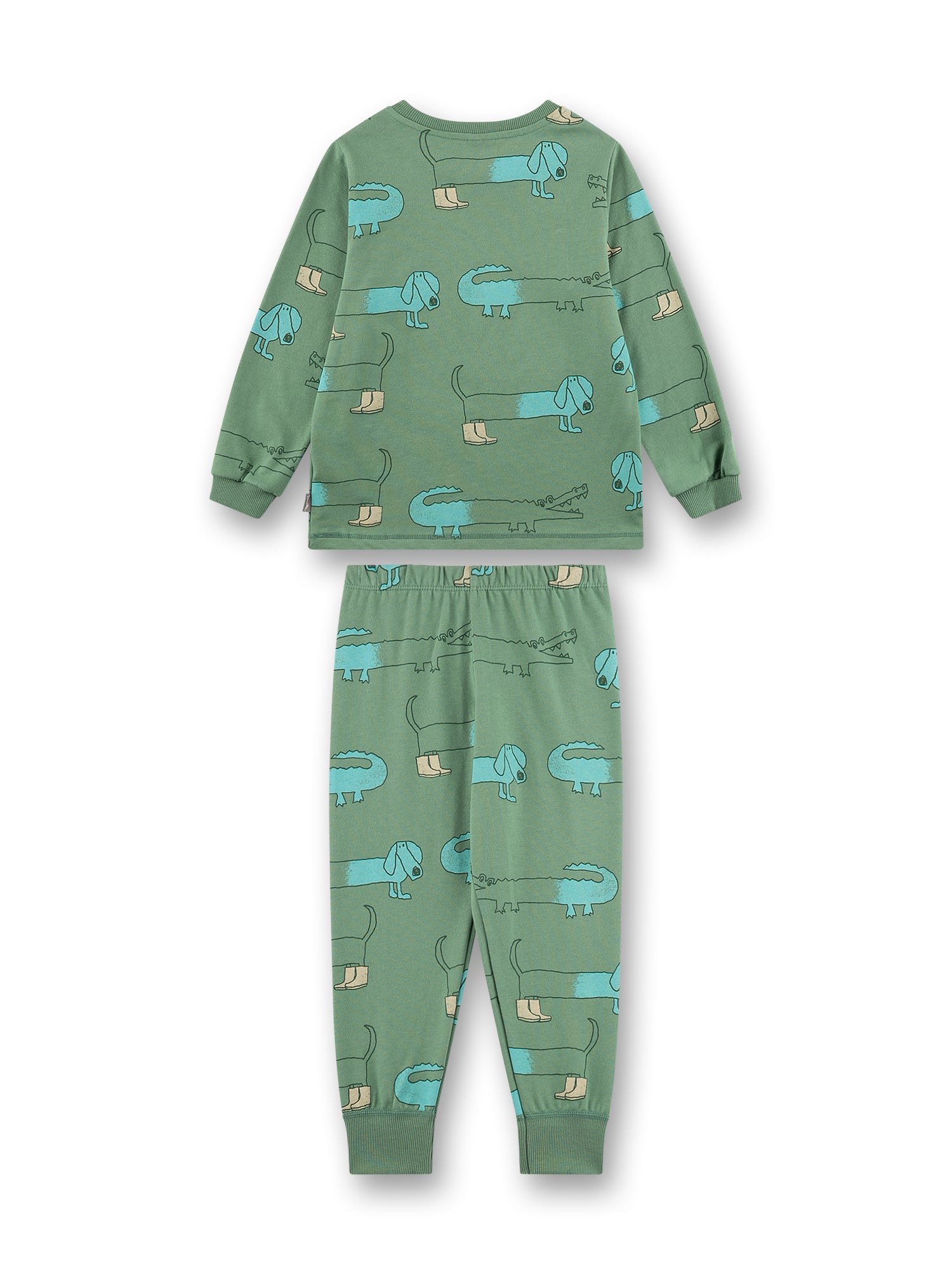 Dieser Schlafanzug von Sanetta bringt mit seinem witzigen Allover-Print jede Menge Spaß ins Kinderzimmer. Auf dem sanften Grünton tummeln sich fröhliche Krokodile und Dackel mit Stiefelchen – ein liebevoll gestaltetes Design, das garantiert für gute Laune sorgt.
