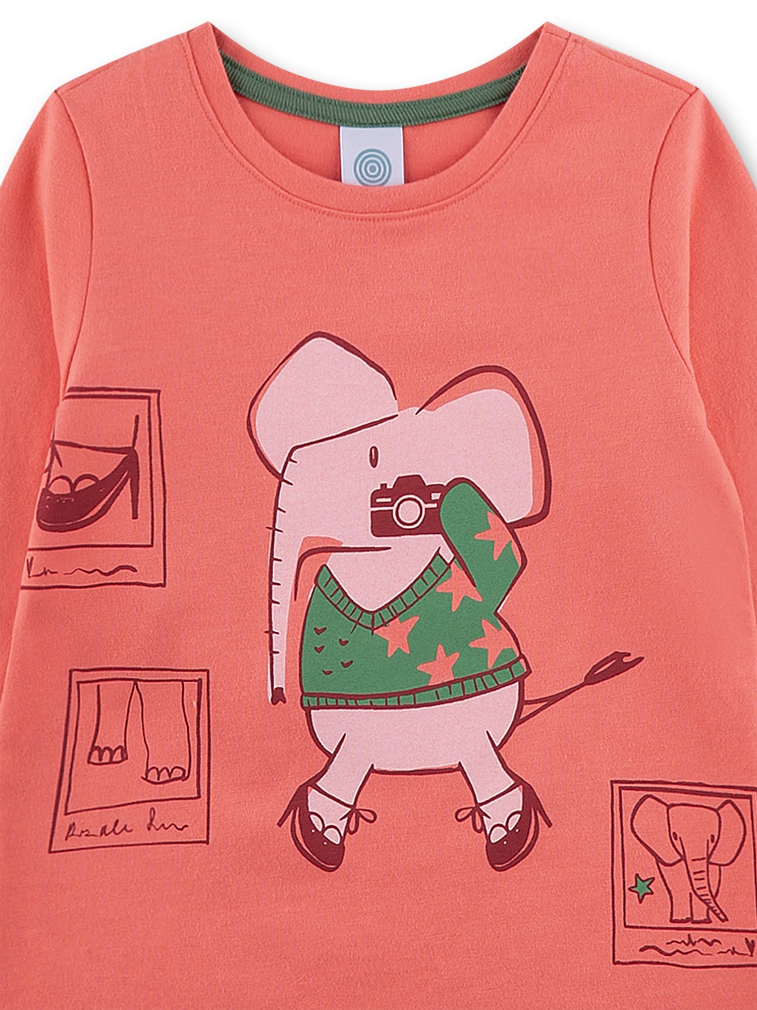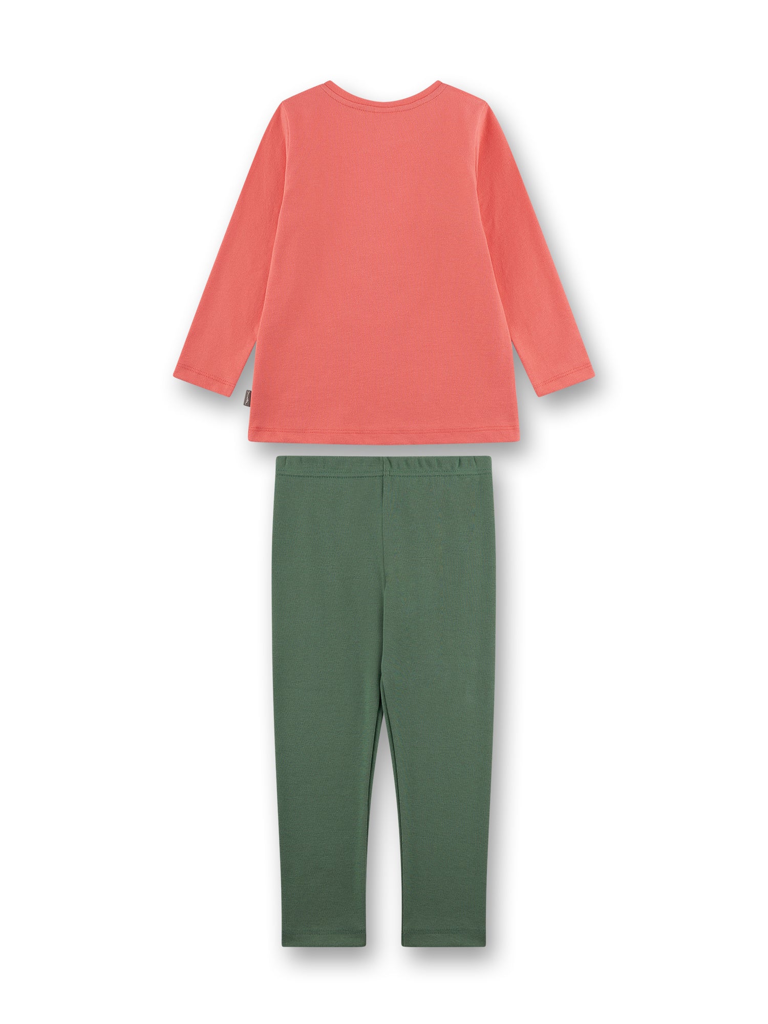 Mit diesem liebevoll gestalteten Schlafanzug von Sanetta wird das Zubettgehen zum Vergnügen. Das Oberteil in warmem Korallton zeigt einen fröhlichen Elefanten mit Kamera – ein detailverliebter Print, der kleine Tierfreunde begeistert. Die passende Hose in dunklem Grün ergänzt das Set harmonisch.