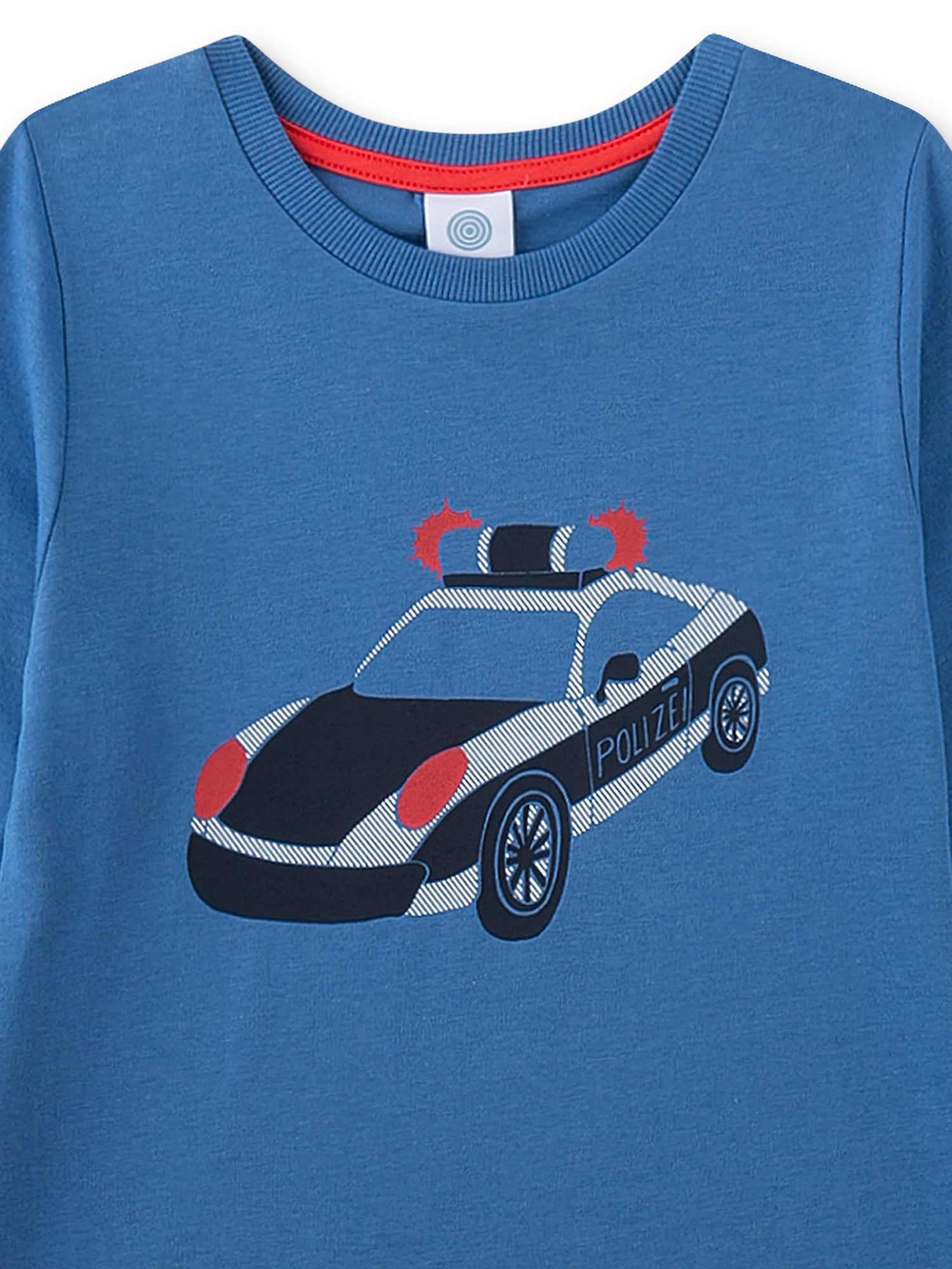 In kräftigem, freundlichem Blau zeigt es einen coolen Polizeiwagen mit leuchtenden Blaulichtern – ein Motiv, das Kinderaugen strahlen lässt und zum Träumen von spannenden Einsätzen einlädt. Der weiche Stoff und die bequeme Passform sorgen für angenehmen Tragekomfort die ganze Nacht über.