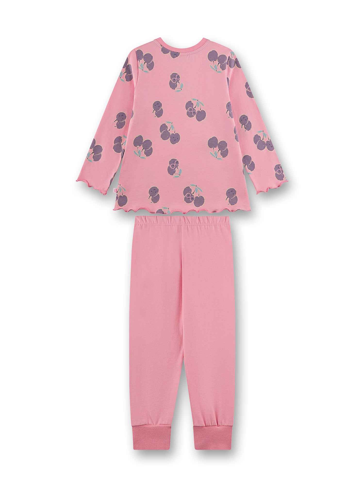 Dieser fröhliche Schlafanzug in Rosa sorgt für süße Träume und gemütliche Stunden. Das langärmelige Oberteil ist rundum mit einem niedlichen Kirschen-Motiv bedruckt – mit kleinen, fröhlichen Gesichtern, die einfach gute Laune machen. Verspielte gewellte Abschlüsse an Ärmeln und Saum setzen liebevolle Akzente.