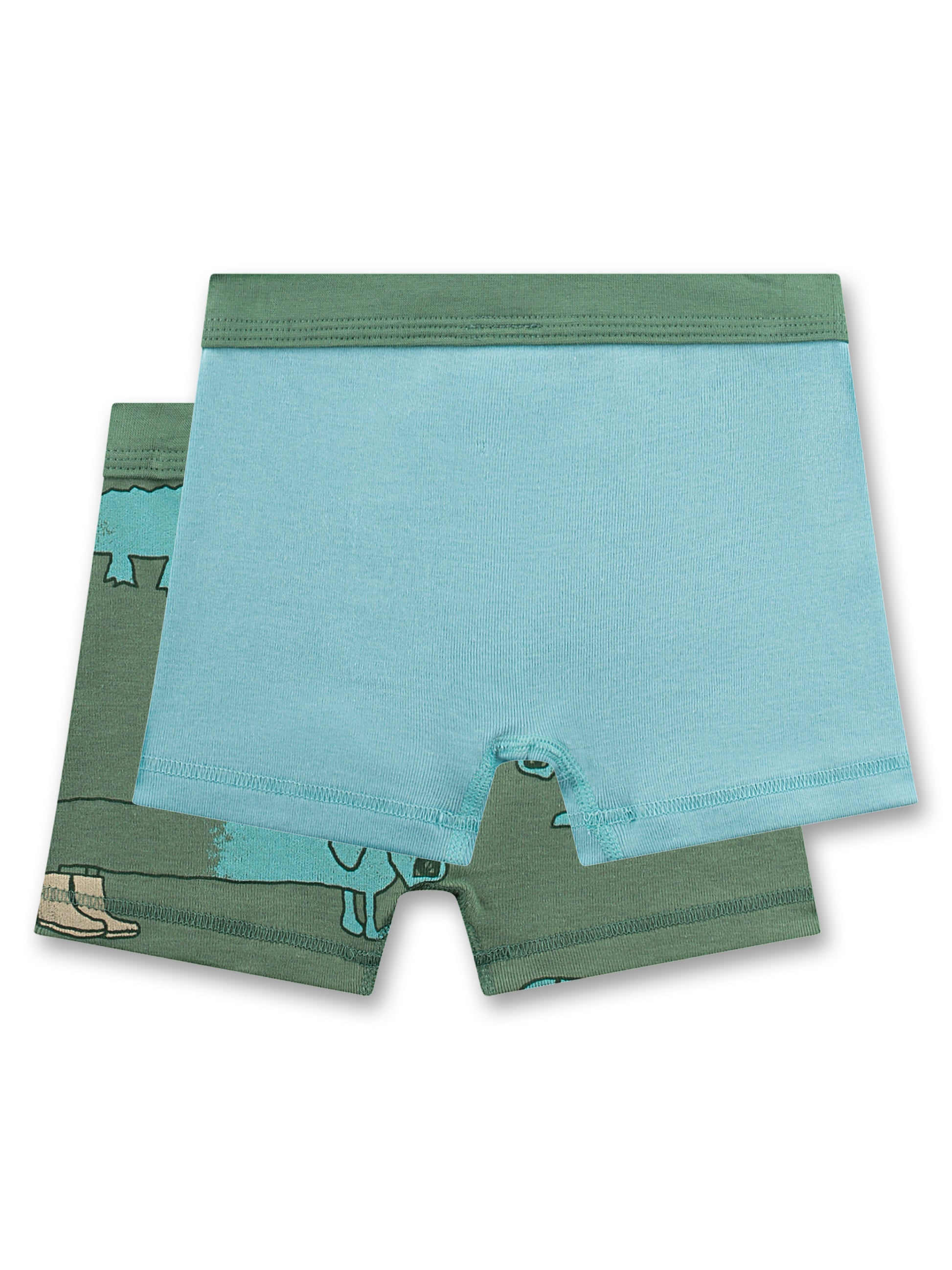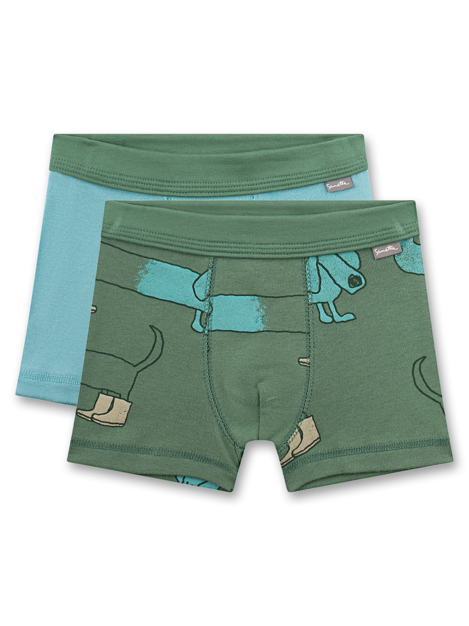 Dieses Boxershorts-Duo von Sanetta begeistert mit kindgerechtem Design und hohem Tragekomfort. Eine Shorts zeigt einen witzigen Dackel-Print auf dunklem Grün, die andere kommt in schlichtem Türkis – beide farblich aufeinander abgestimmt und mit viel Liebe zum Detail gestaltet.