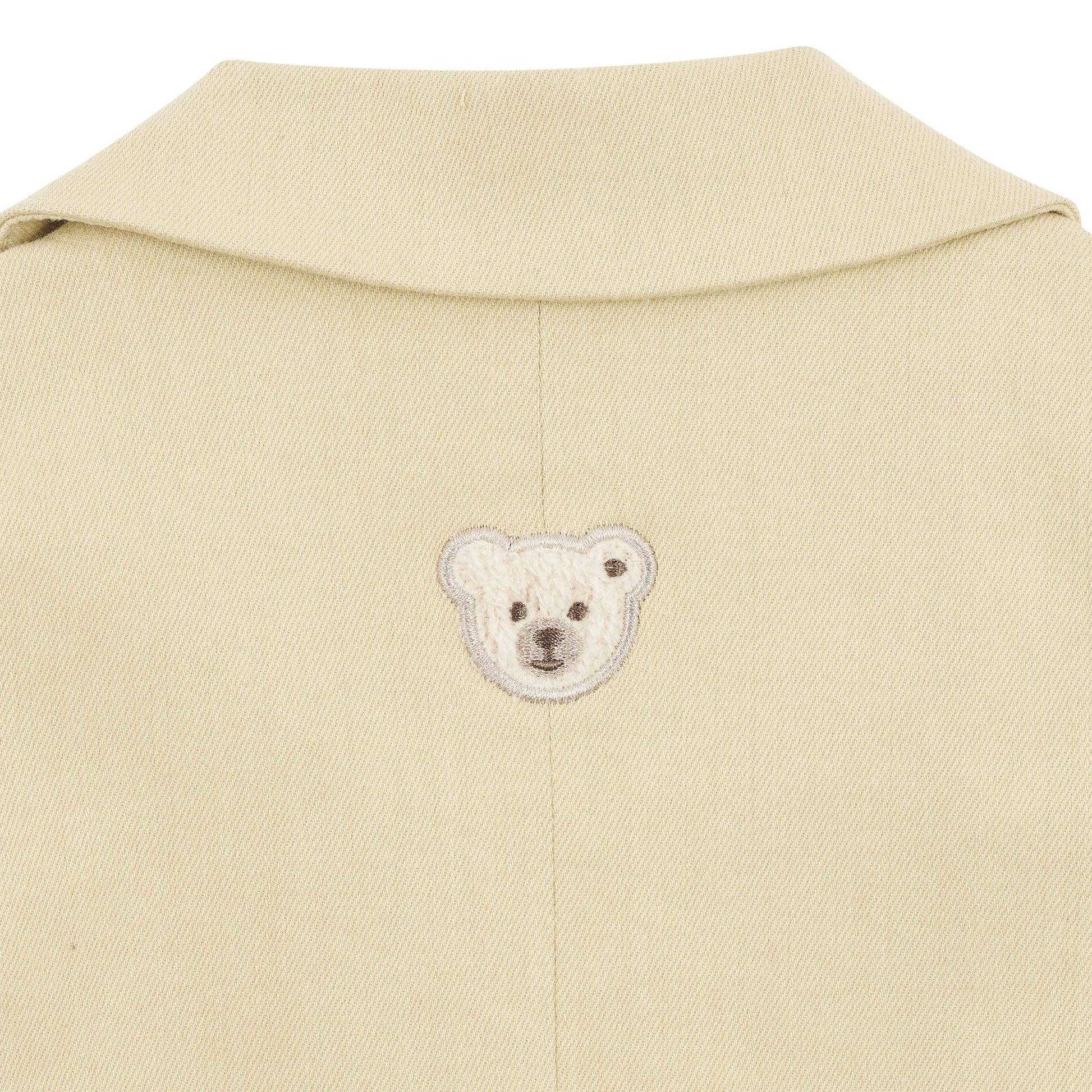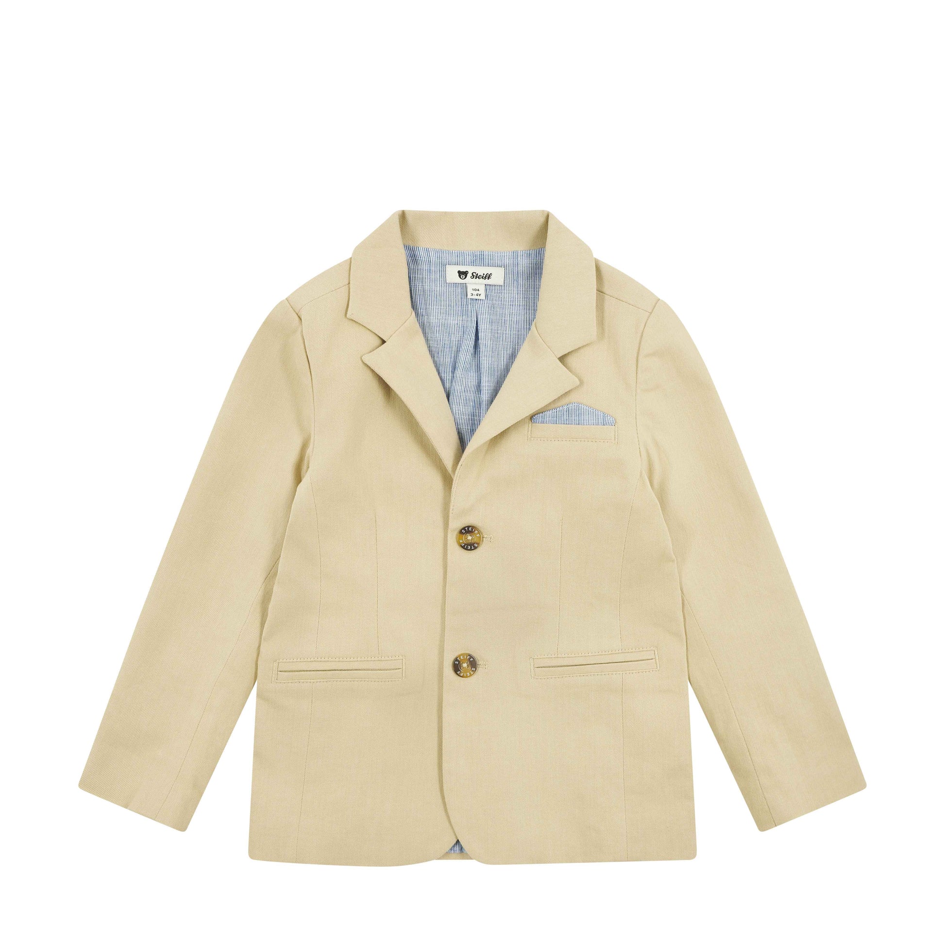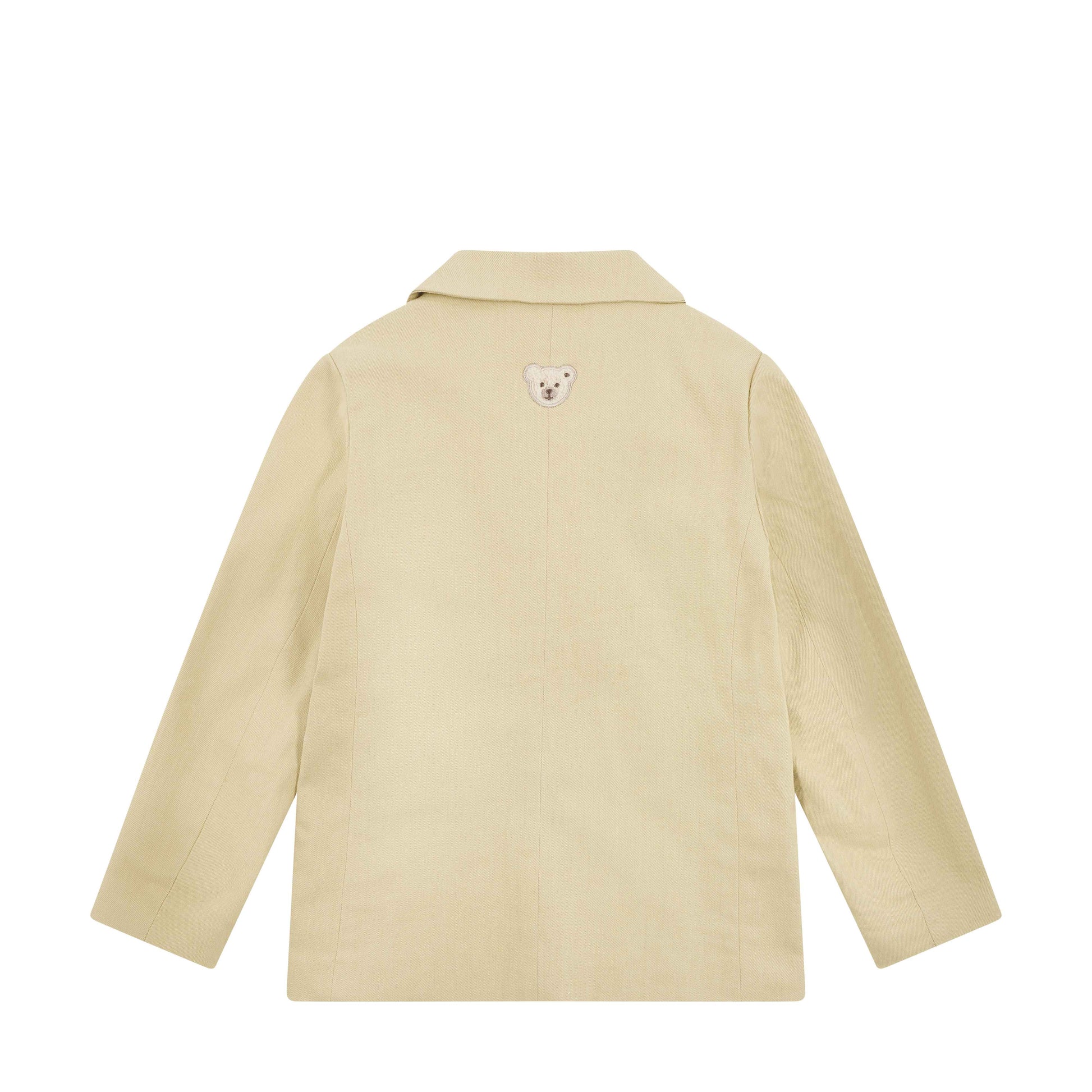 Dieser wunderschöne Blazer in sanftem Beige macht kleine Jungs im Handumdrehen bereit für festliche Anlässe. Das weiche Material liegt angenehm auf der Haut, während das kontrastfarbige, blau-gestreifte Innenfutter dem Blazer einen besonders stilvollen Akzent verleiht. Ein niedliches Detail ist das angedeutete Einstecktuch auf der Brust, das den edlen Look unterstreicht. Zwei dezente Ziertaschen und das liebenswerte Steiff Teddybärmotiv runden das Design harmonisch ab. Ein elegantes Lieblingsstück für die kleinen Gentleman!