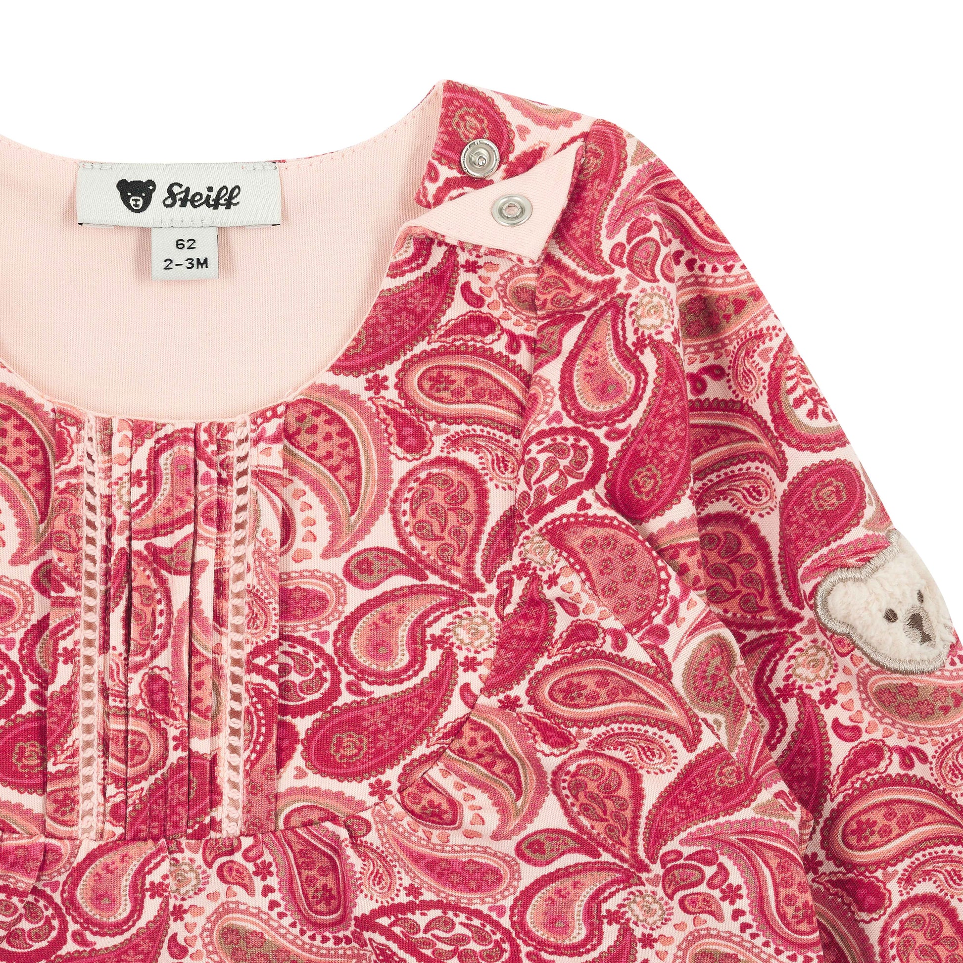 Diese langärmelige Bluse aus weichem Single Jersey begleitet kleine Romantikerinnen mit Leichtigkeit durch den Tag. Der zarte Paisley-Print in Rosatönen verleiht ihr eine verspielte Note, während feine Raffungen an den Schultern und am Saum sowie Falten im Brustbereich für eine schöne Silhouette sorgen. Elastische Ärmelabschlüsse mit leichten Rüschen bieten angenehmen Tragekomfort. Praktische Druckknöpfe erleichtern das An- und Ausziehen. Das klassische Steiff Teddybärmotiv ziert dezent den Ärmel – ein liebevoller Begleiter für stilbewusste Weltentdeckerinnen.