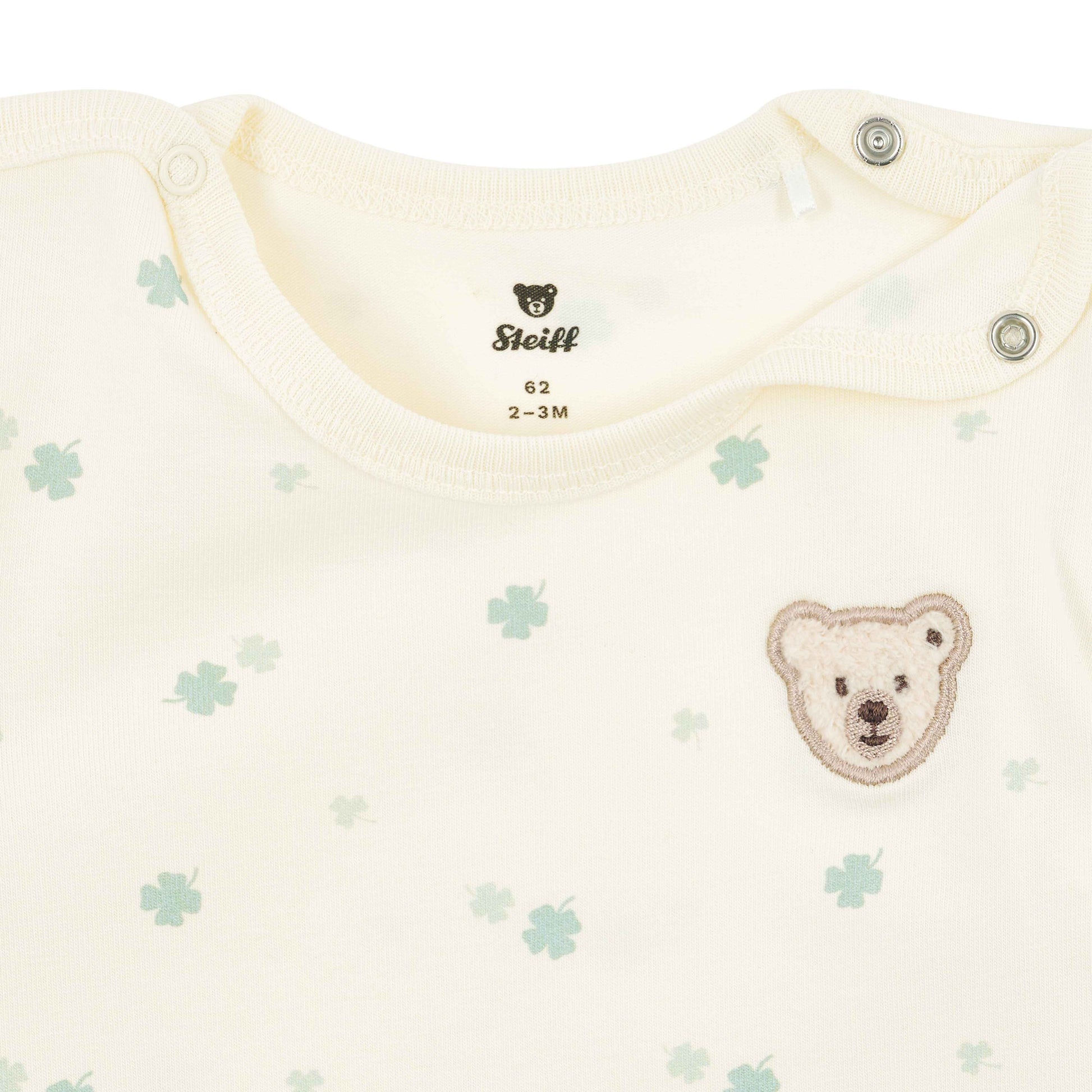 Dank der durchdachten Schulterknöpfung und der Druckknöpfe im Schritt gelingt das An- und Ausziehen besonders unkompliziert – ideal für den alltäglichen Babyalltag. Auf der Brust setzt das klassische Steiff Teddybärmotiv einen charmanten Markenakzent 🍀.
