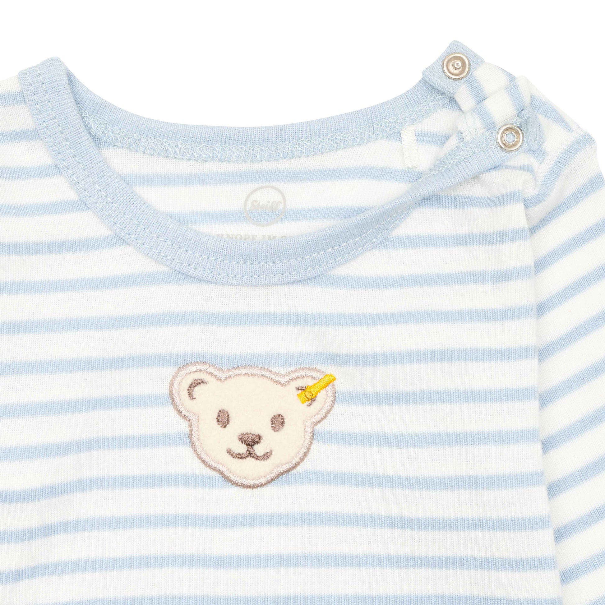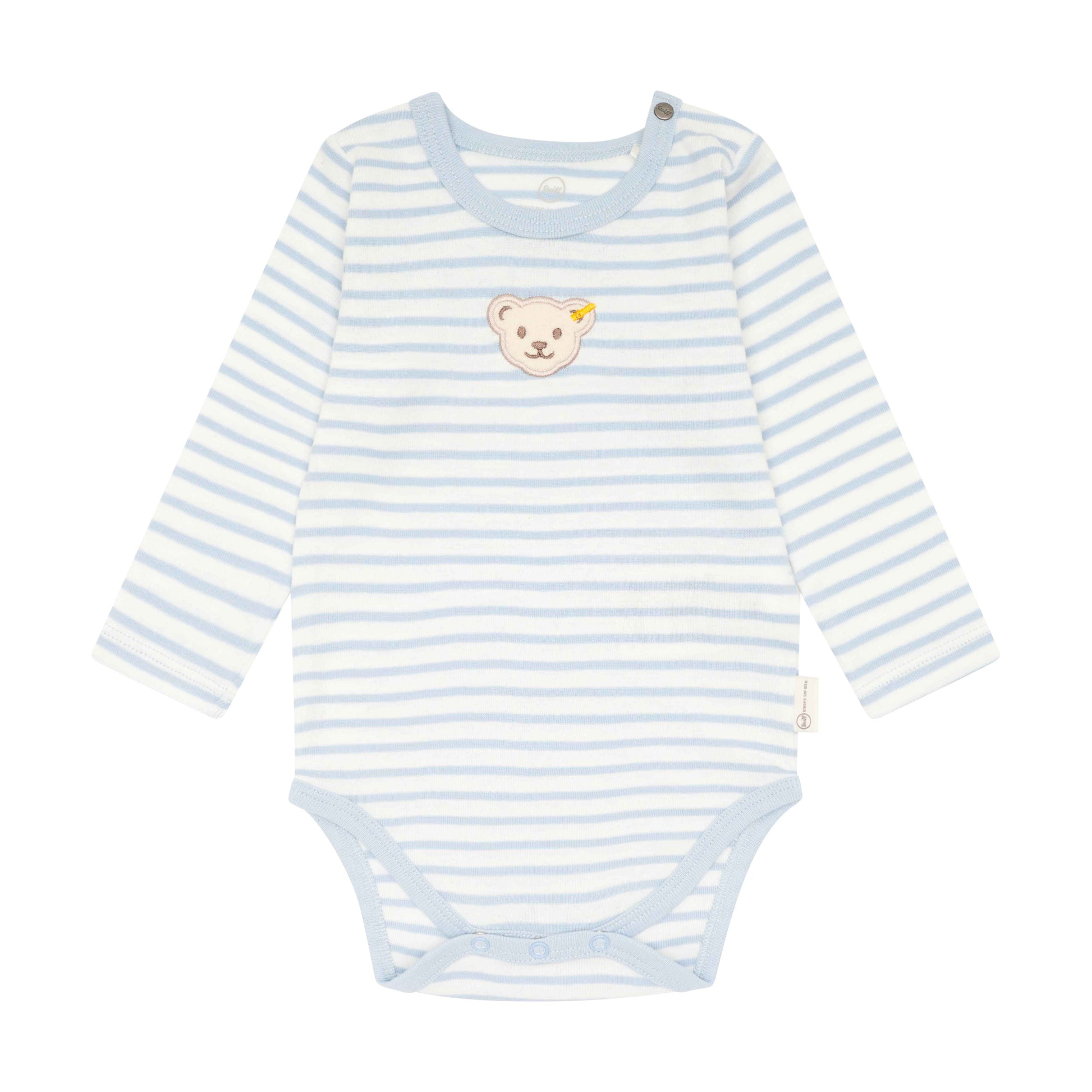 In bequemer Passform und angenehm wärmend ist der langärmlige Body die Grundlage für Kombinationen an kühlen Tagen. Sehr flexibel lässt sich darin auch wunderbar spielen, herumtoben oder gemütlich einschlafen. Schlupfkragen und Druckknöpfchen sind praktische Helfer beim Anziehen. Weicher Jersey verwöhnt zarte Babyhaut mit einem herrlichen Tragegefühl. Zartes Hellblau ist als Klassiker vielseitig kombinierbar. Als süße Applikation auf der Brustmitte begleitet ein Steiff Teddybärmotiv Ihr Kleines durch den Tag. Perfektes Basic!