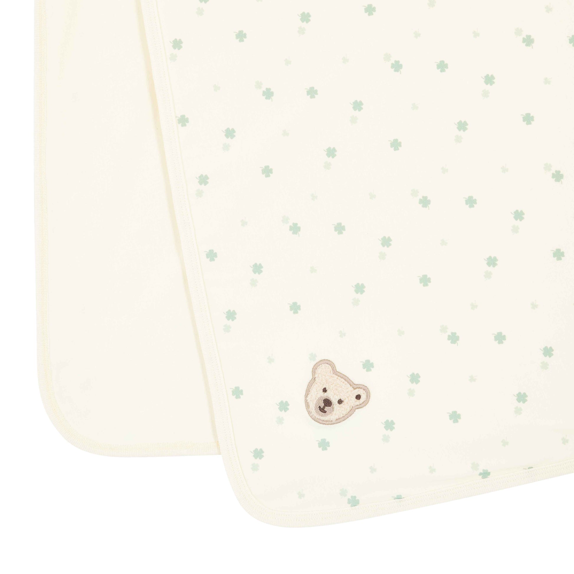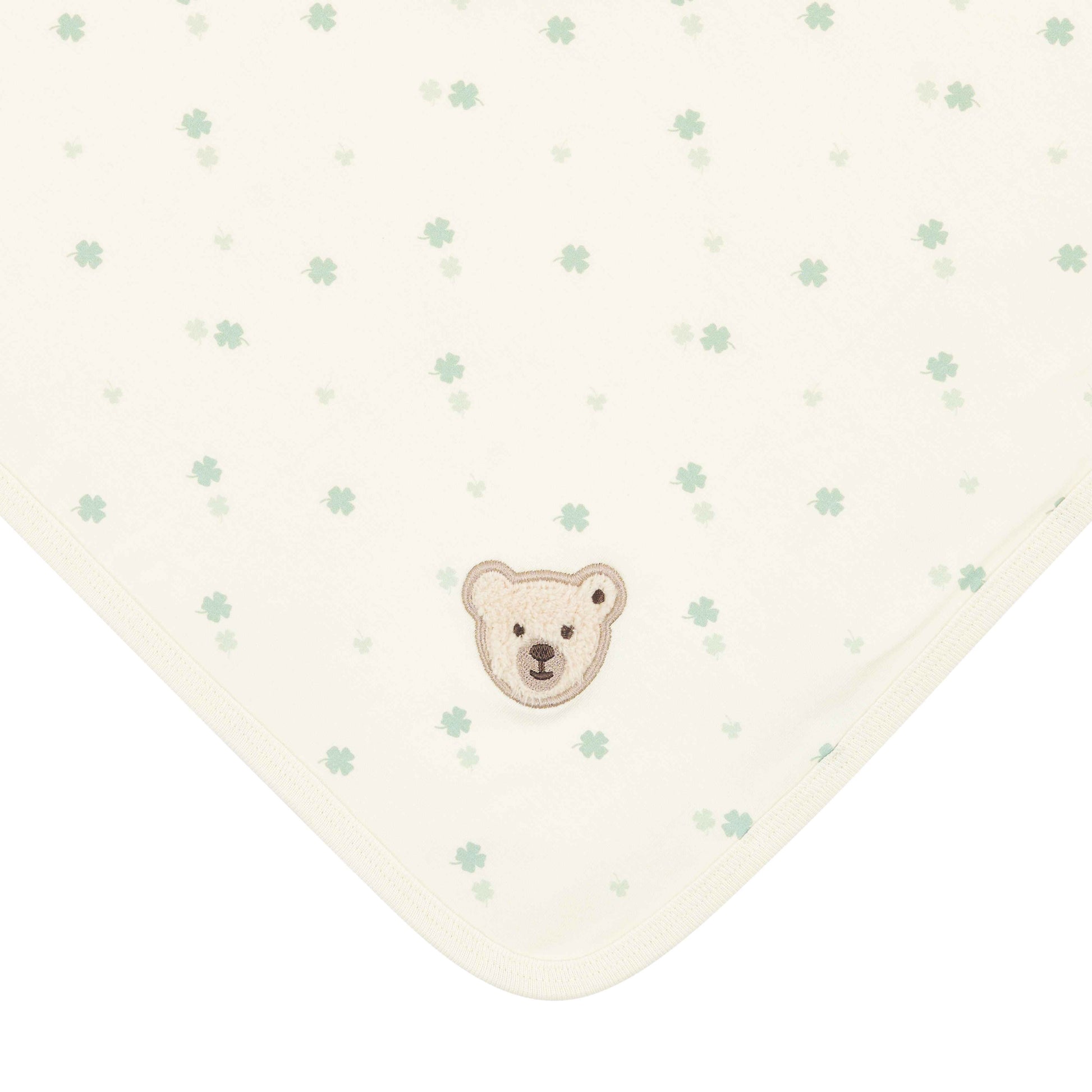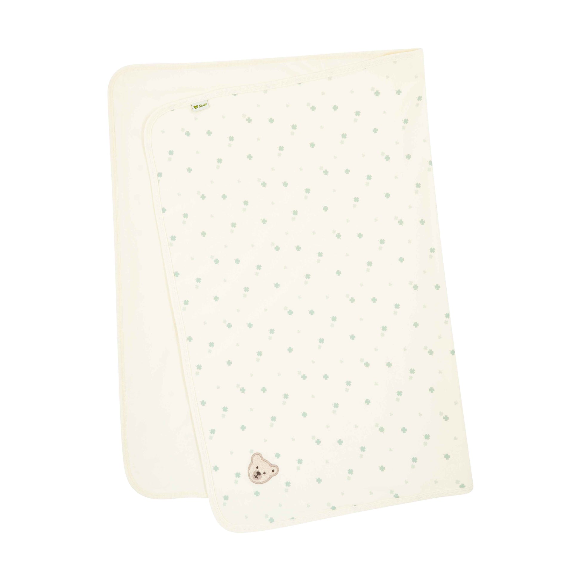 Der feine Allover-Print mit kleinen grünen Kleeblättern verleiht der Decke eine ruhige, verspielte Note. Am Rand setzt das liebevoll applizierte Steiff Teddybärmotiv einen charmanten Akzent und macht die Decke zu einem echten Lieblingsstück. Ob zum Einwickeln, Zudecken oder Kuscheln – ein stilvoller Begleiter für viele schöne Wohlfühlmomente. 💚✨