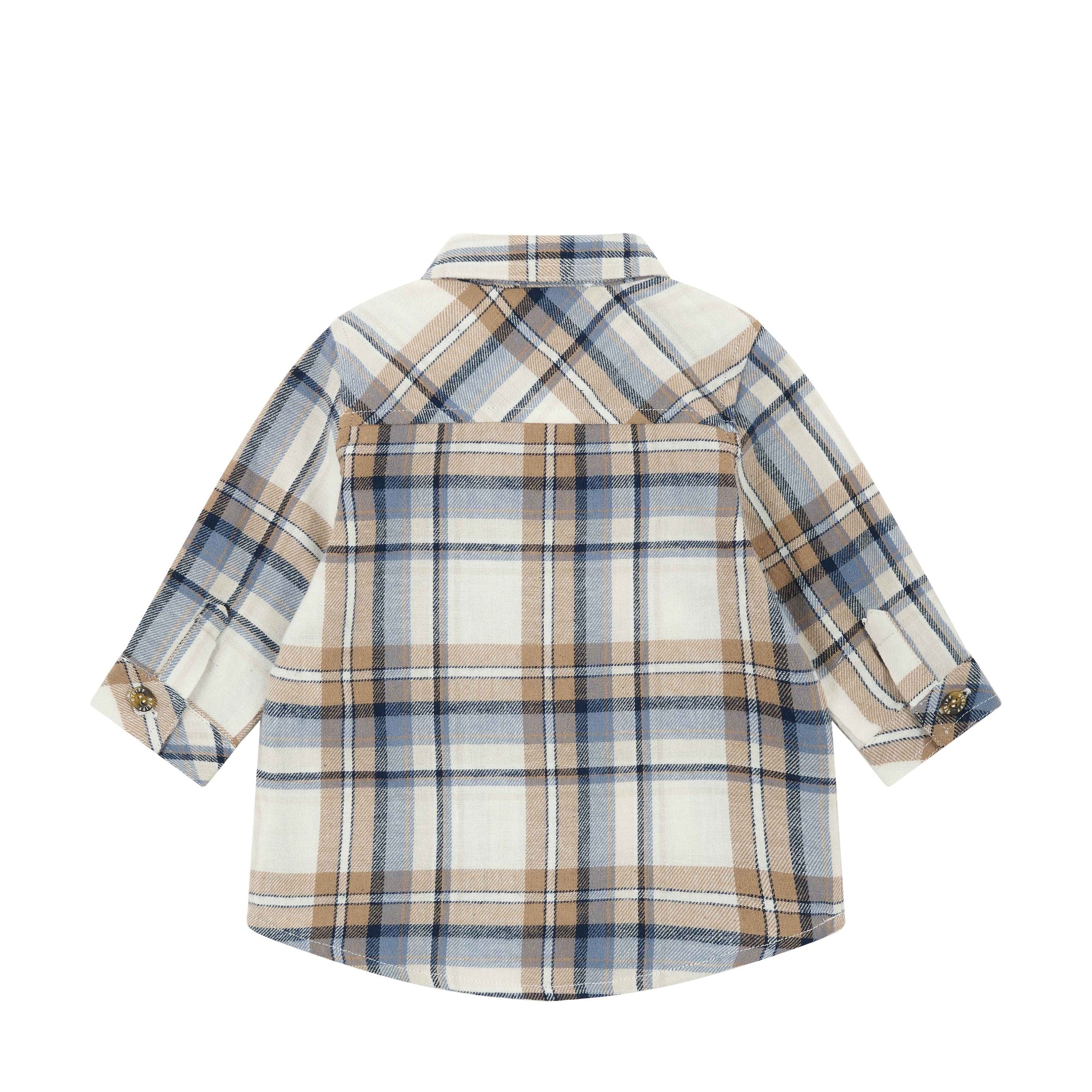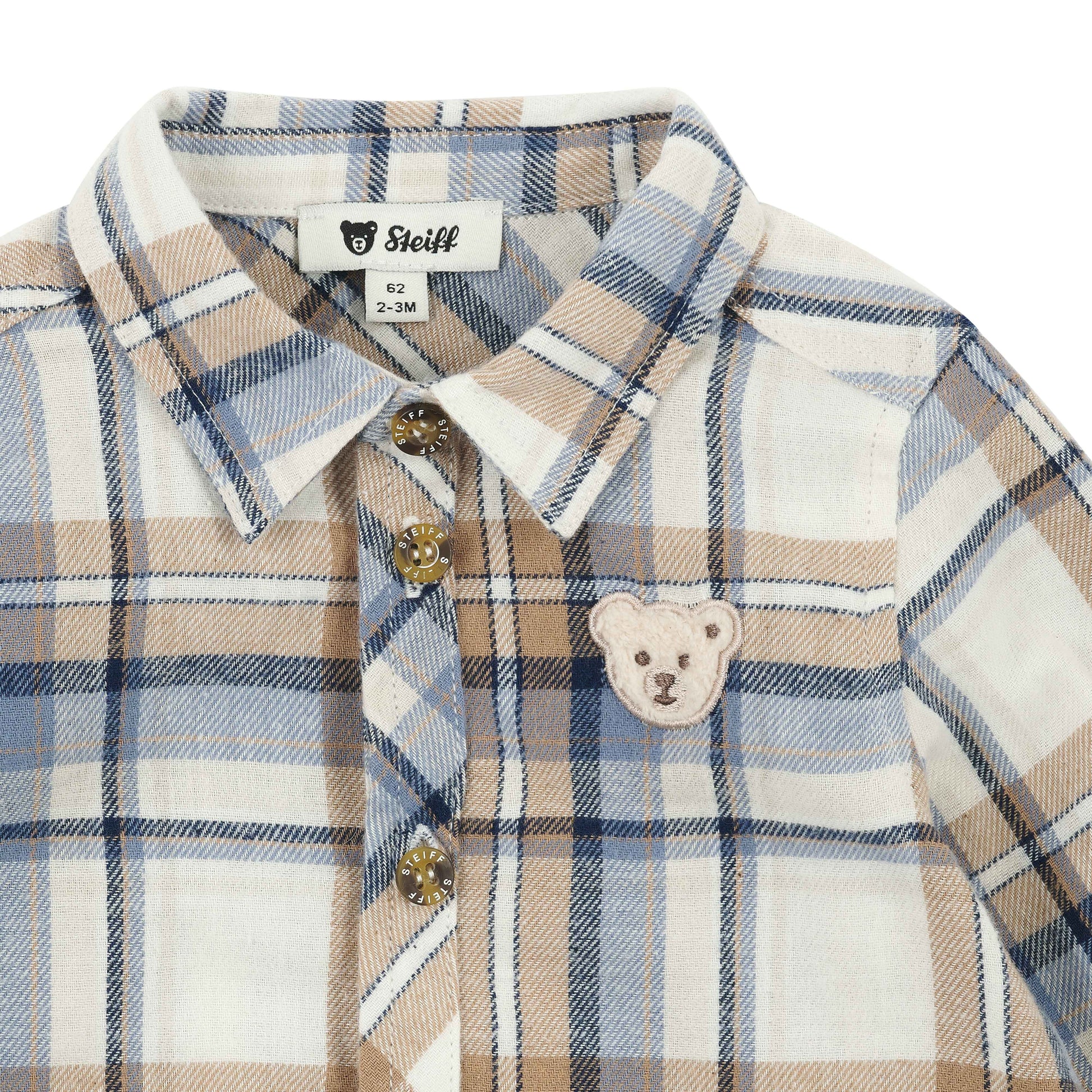 Kleine Charmeure sind in diesem kuscheligen Flanellhemd stilvoll unterwegs. Das klassische Karomuster in Blau und Beige verleiht dem Look eine klassische, gleichzeitig moderne Note. Dank weichem Material und bequemer Passform mit leicht gerundetem Saum ist für höchsten Tragekomfort gesorgt. Der Hemdkragen und durchgehende Knopfleiste machen das Anziehen kinderleicht und sorgen für einen klassischen Auftritt. Auf der Brust setzt das Steiff Teddybärmotiv einen liebevollen Akzent – ein gemütlicher Hingucker für stilbewusste Weltentdecker.