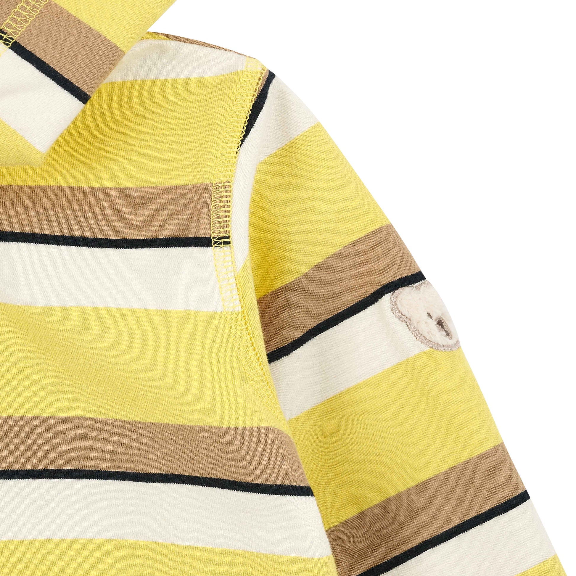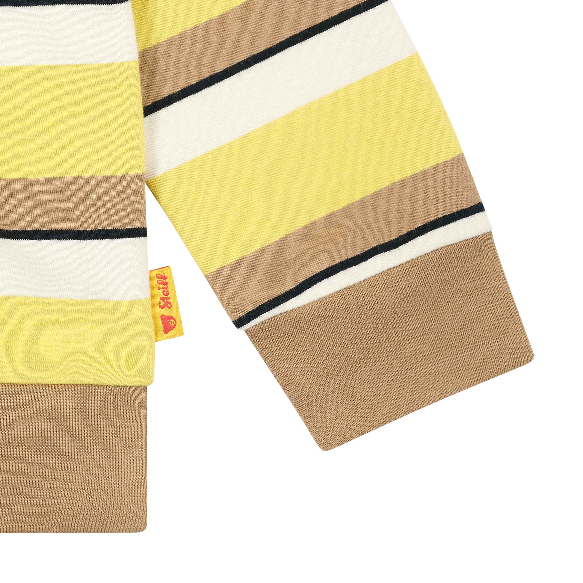 Kleine Entdecker sind in diesem gestreiften Sweatshirt mit Kapuze rundum gemütlich und stylisch unterwegs. Der weiche Sweat Stoff bietet angenehmen Tragekomfort, während der lockere Schnitt viel Bewegungsfreiheit lässt. Gerippte Bündchen an Ärmeln und Saum sorgen für einen bequemen Sitz. Breite Blockstreifen in Gelb und Braun verleihen dem Look eine fröhliche Note mit sportlichem Charakter. Am Ärmel rundet das klassische Steiff Teddybärmotiv das Design liebevoll ab – ein Wohlfühlteil für jeden Tag.