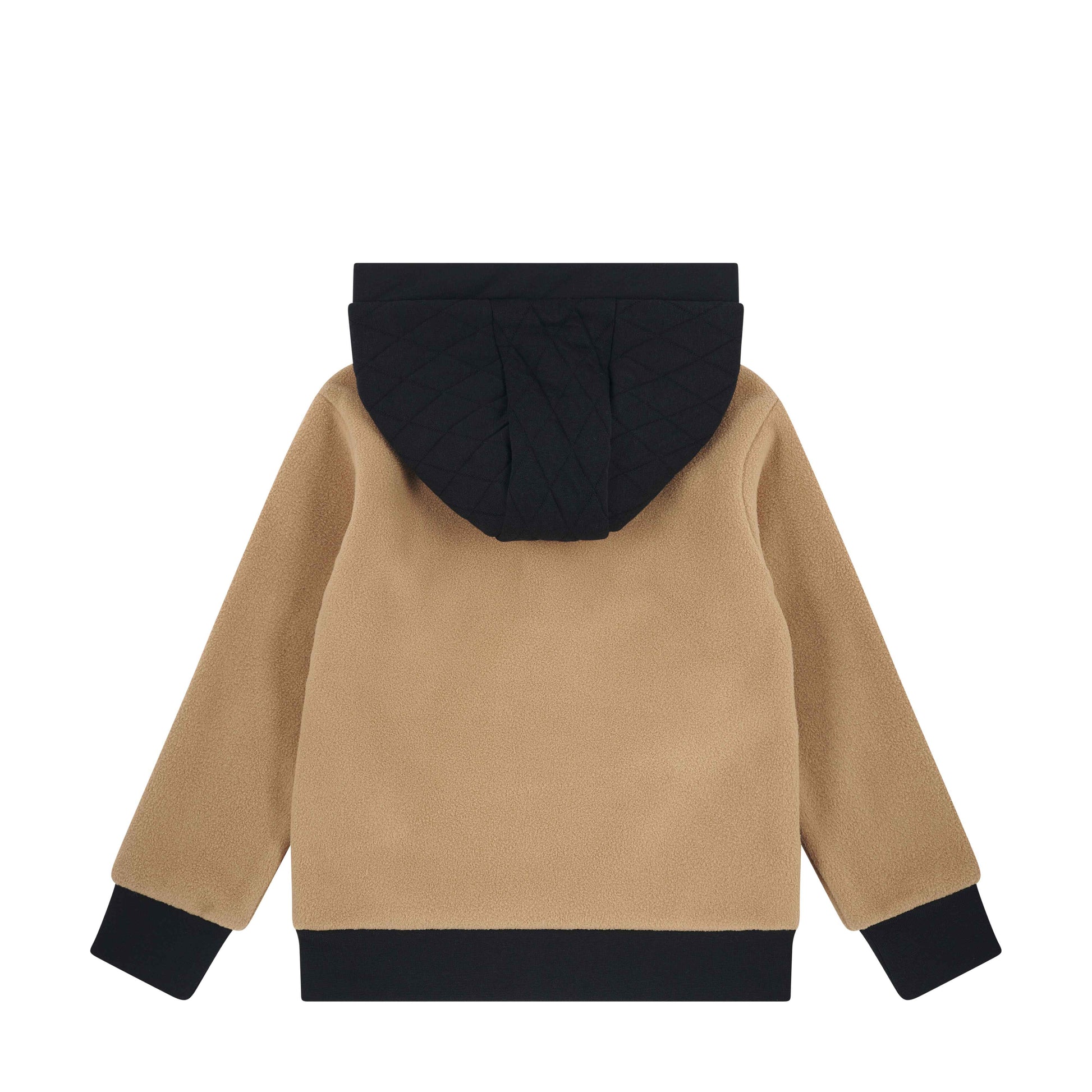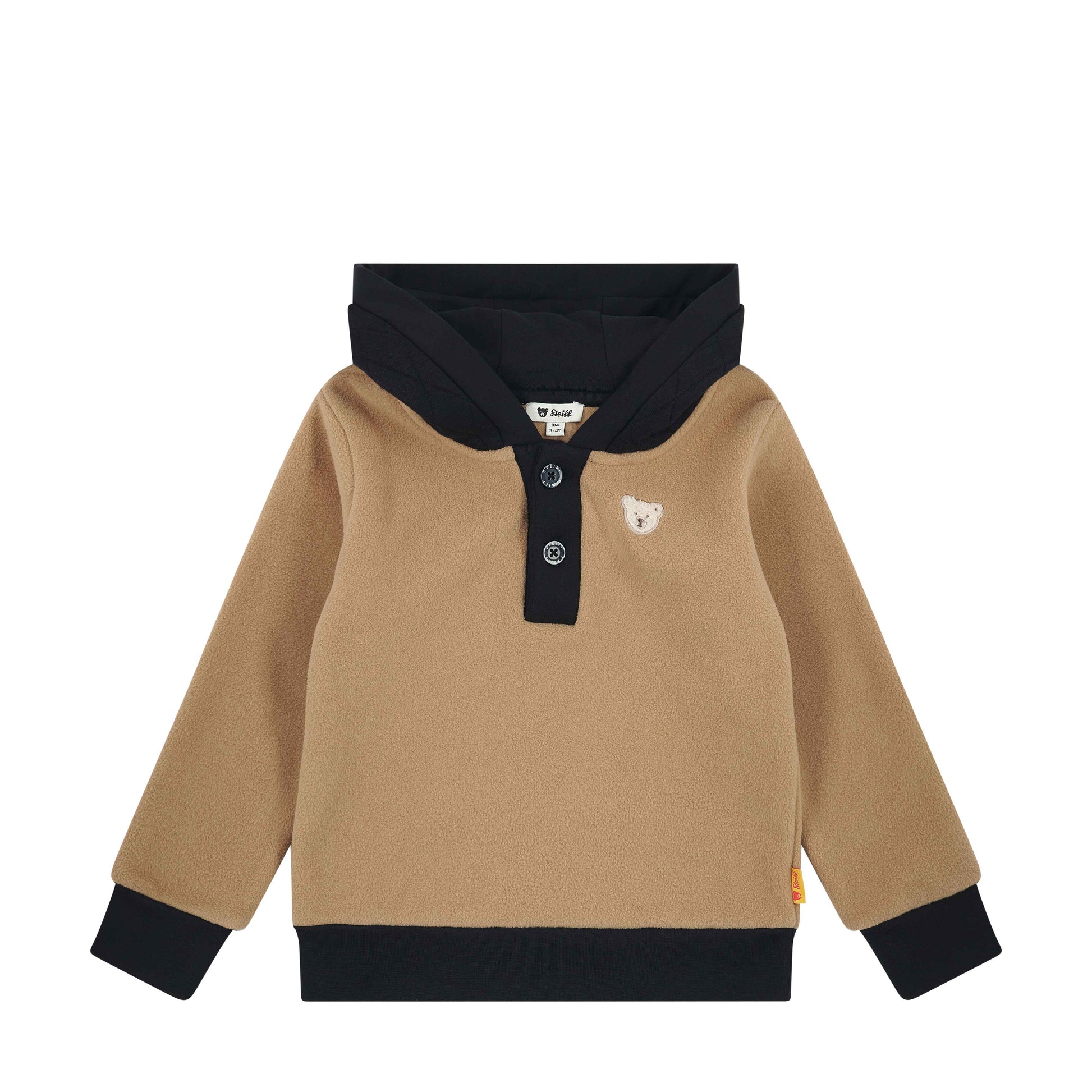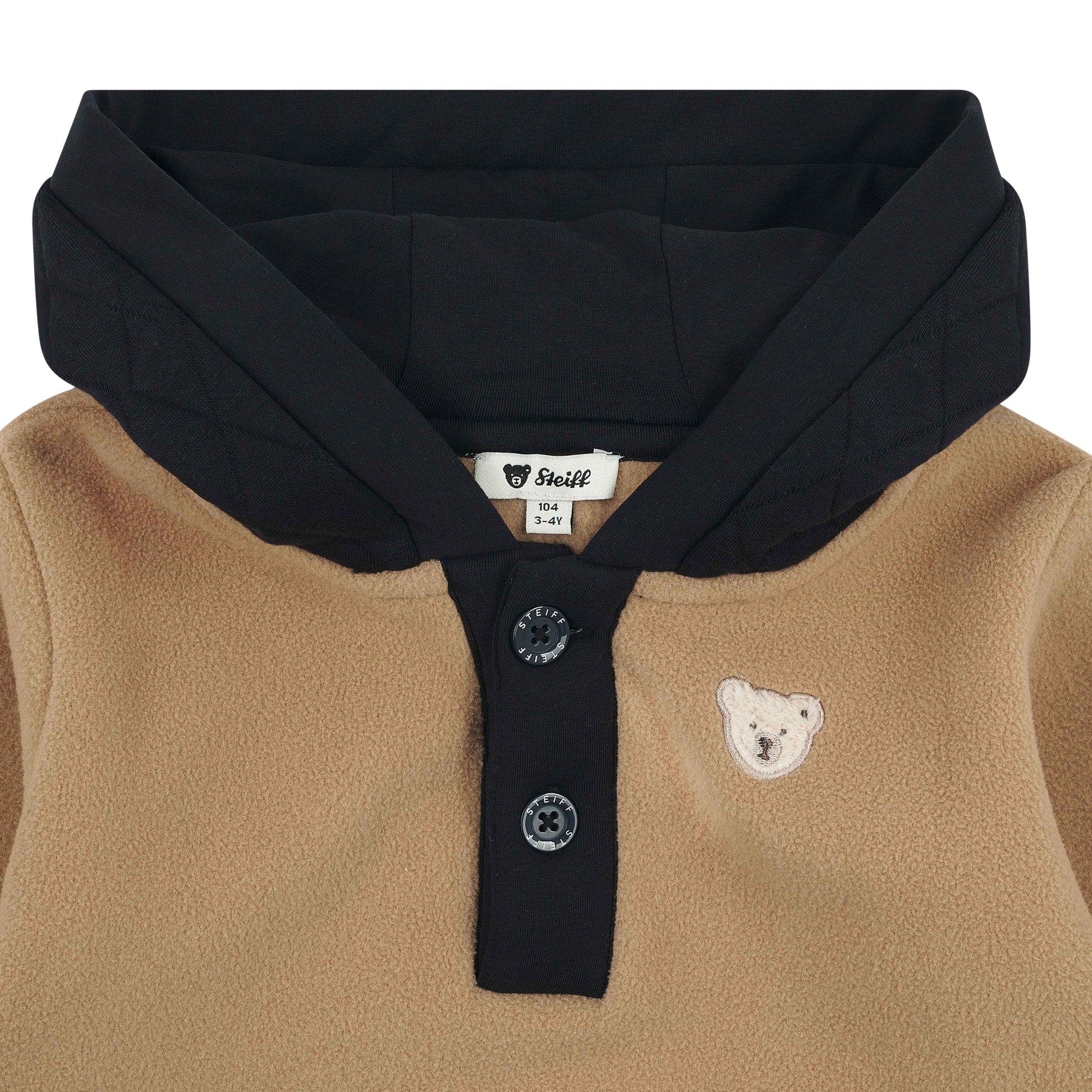 Kleine Entdecker genießen in diesem kuscheligen Kapuzensweatshirt wohlige Wärme und lässigen Stil. Der weiche Fleece sorgt für hohen Tragekomfort, während der gerade Schnitt und gerippte Bündchen viel Bewegungsfreiheit und einen sicheren Sitz bieten. Die dunkelblaue Kapuze und die dazu passende Knopfleiste setzen einen sportlichen Kontrast zum warmen Braunton. Auf der Brust sorgt das klassische Steiff Teddybärmotiv für einen charmanten Hingucker – ein gemütlicher Lieblingsbegleiter für kühle Tage.