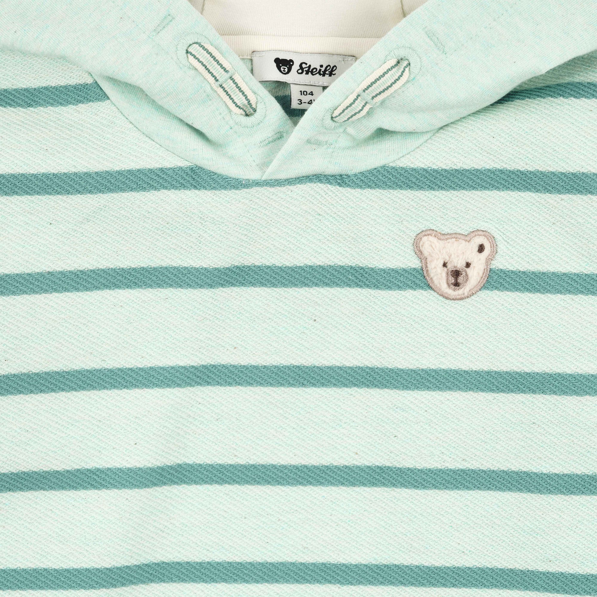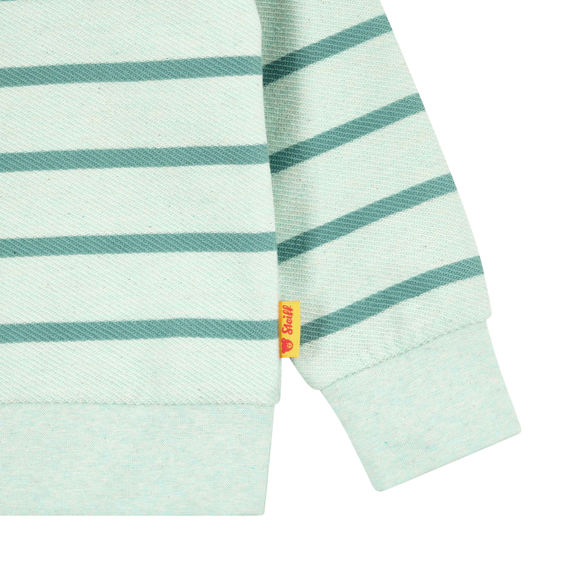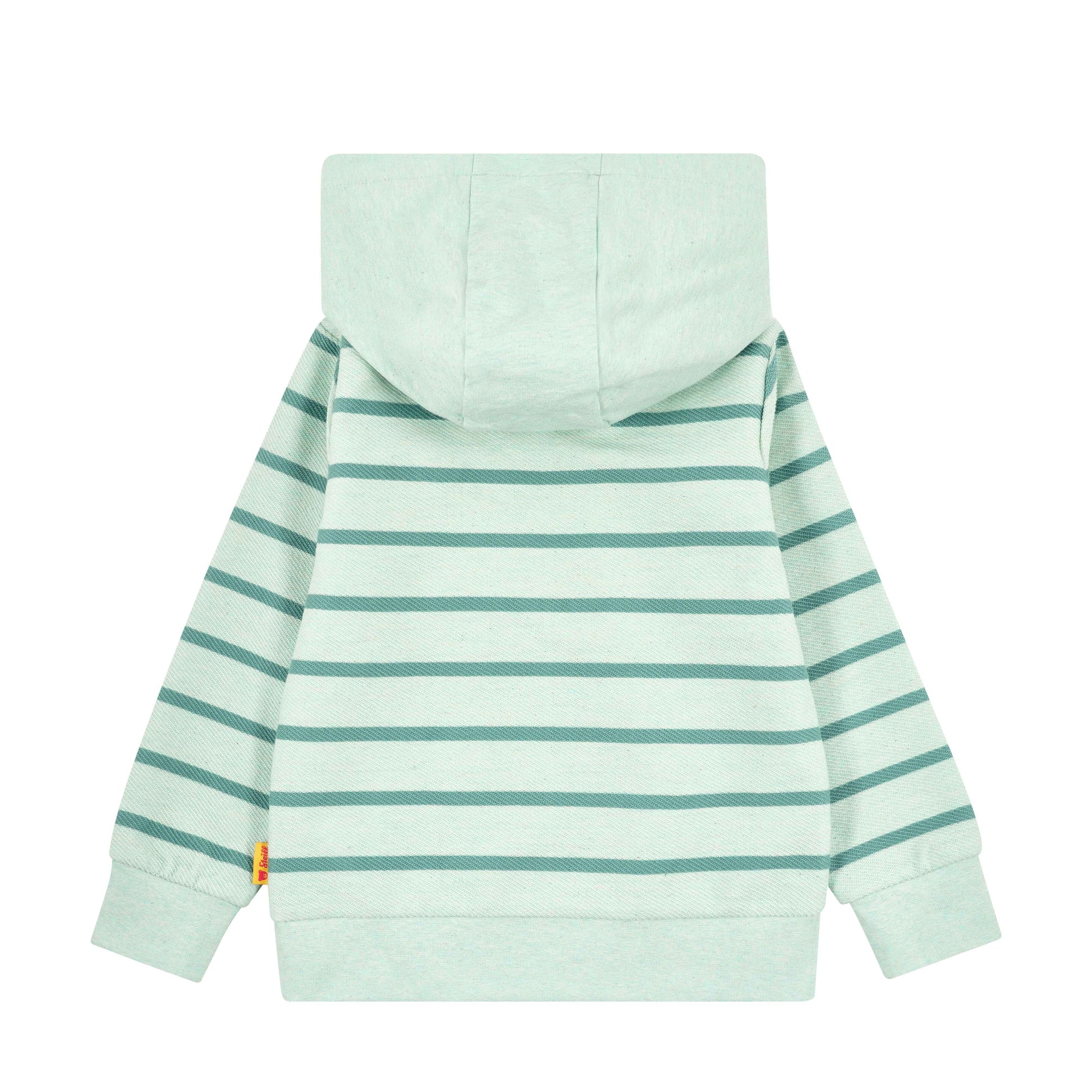 Dank elastischer Rippbündchen an Ärmeln und Saum bleibt alles an Ort und Stelle. Die fein abgestimmten Streifen in Hellgrün und Kontrastfarbe verleihen dem Look eine sportlich-verspielte Note. Als liebevolles Detail begleitet das Steiff Teddybärmotiv auf der Brust kleine Abenteurer durch den Tag. Ein Hoodie zum Wohlfühlen – jeden Tag. ✨💚