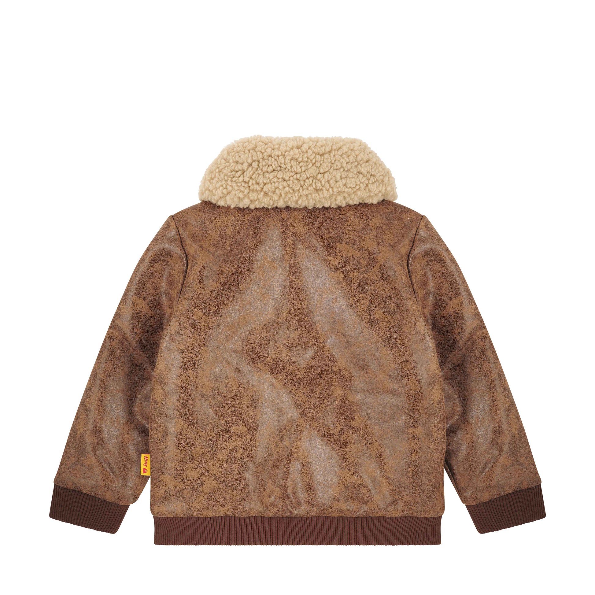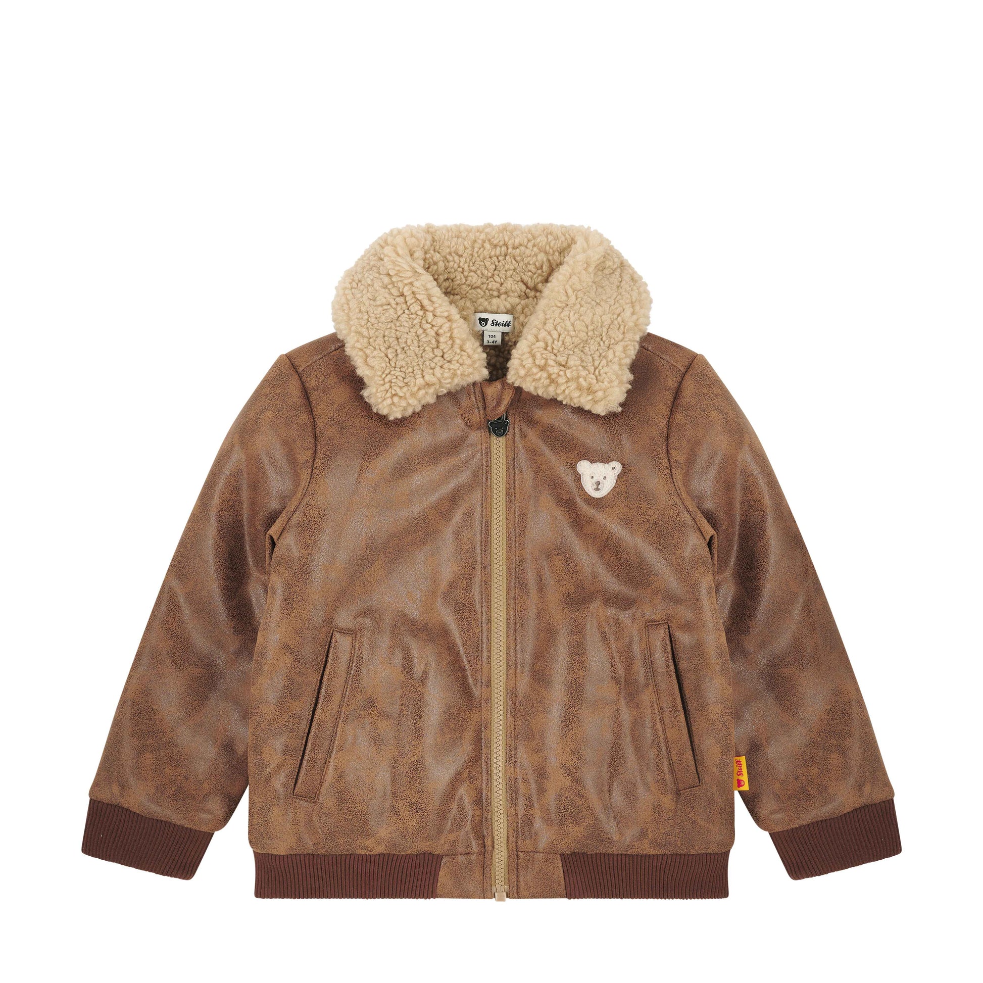 Kleine Gentlemen lieben den coolen Look und kuscheligen Komfort dieser Jacke aus weichem Kunstleder. Der angesagte Vintage-Stil trifft auf ein warmes Teddyplüsch im Kragen, das nicht nur optisch begeistert, sondern auch wunderbar wärmt. Die Jacke ist gefüttert und wattiert und bietet so extra Wärme an kühlen Tagen. Der Schnitt mit gerippten Abschlüssen an Ärmeln und Saum sorgt für einen bequemen Sitz und viel Bewegungsfreiheit. Seitliche Eingrifftaschen und ein durchgehender Reißverschluss machen die Jacke besonders alltagstauglich. Auf der Brust setzt das klassische Steiff Teddybärmotiv einen stilvollen Akzent – ein markanter Lieblingsbegleiter für kühle Tage.