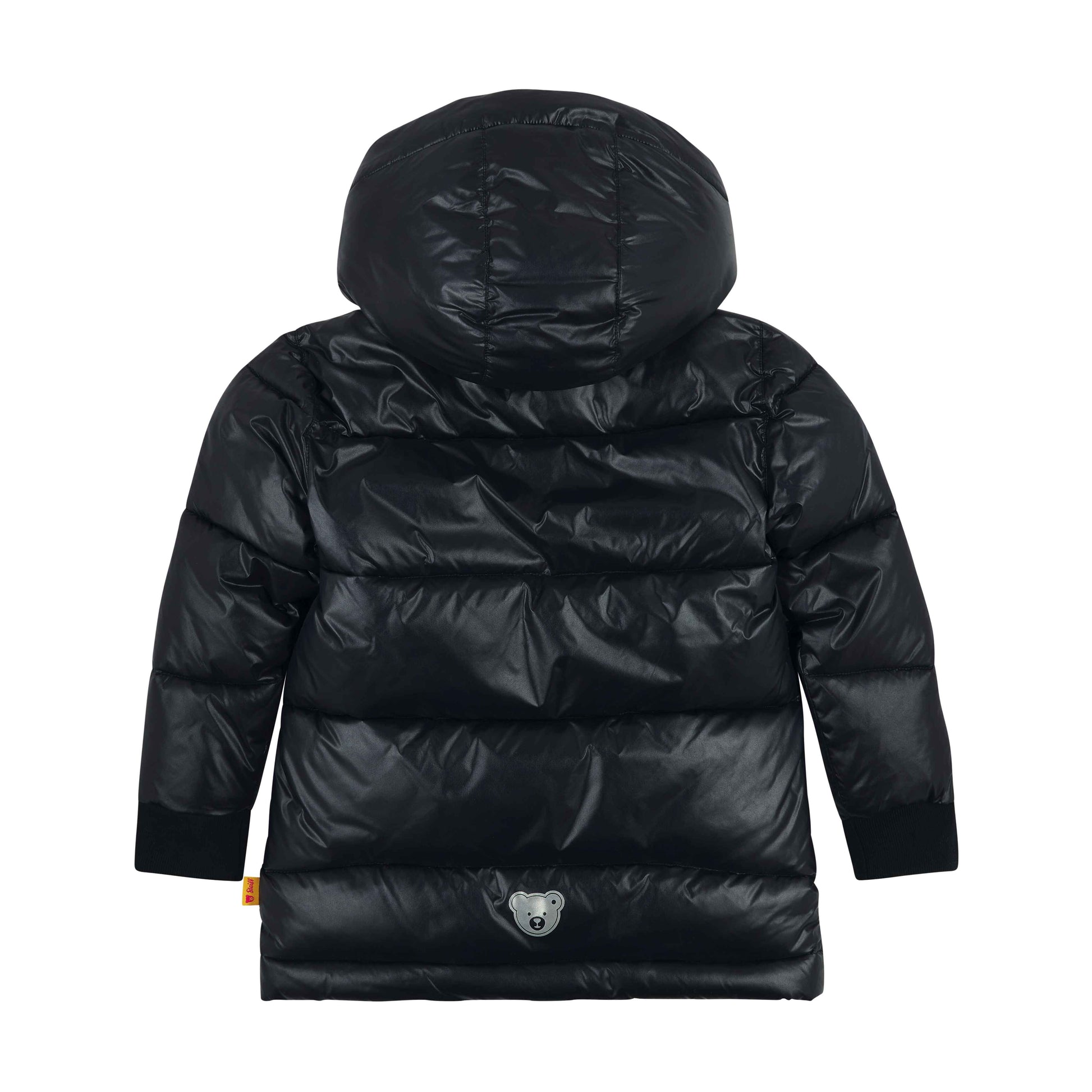 Für stilbewusste kleine Abenteurer ist diese wattierte Jacke ein echtes Highlight für kühle Tage. Dank einer ökologischen BIONIC-FINISH®ECO Imprägnierung ohne Weichmacher, ist das Obermaterial wind- und wasserabweisend sowie atmungsaktiv. Eine abnehmbare Kapuze, ein hoher Stehkragen sowie Rippbündchen an Ärmeln und Kragen schützen zusätzlich vor Wind und Kälte. Praktische Taschen – sowohl seitlich als auch aufgesetzte Taschen – bieten Platz für kleine Schätze unterwegs. Auf dem Ärmel setzt das klassische Steiff Teddybärmotiv einen charmanten Akzent. Eine gemütliche Lieblingsjacke für aktive Entdeckungsreisen.