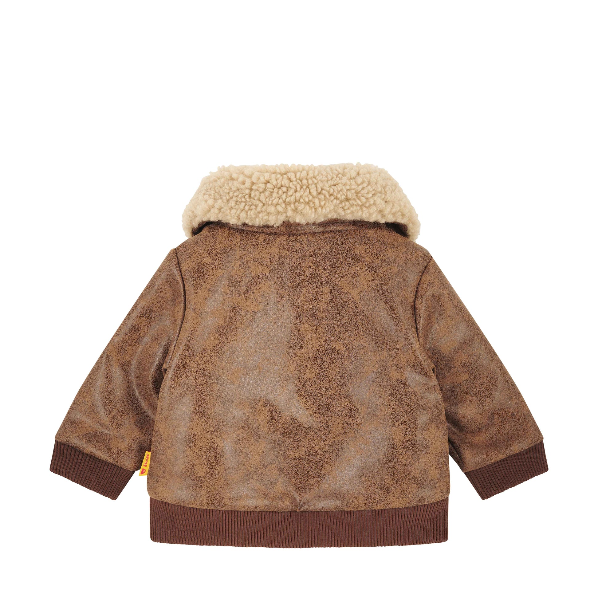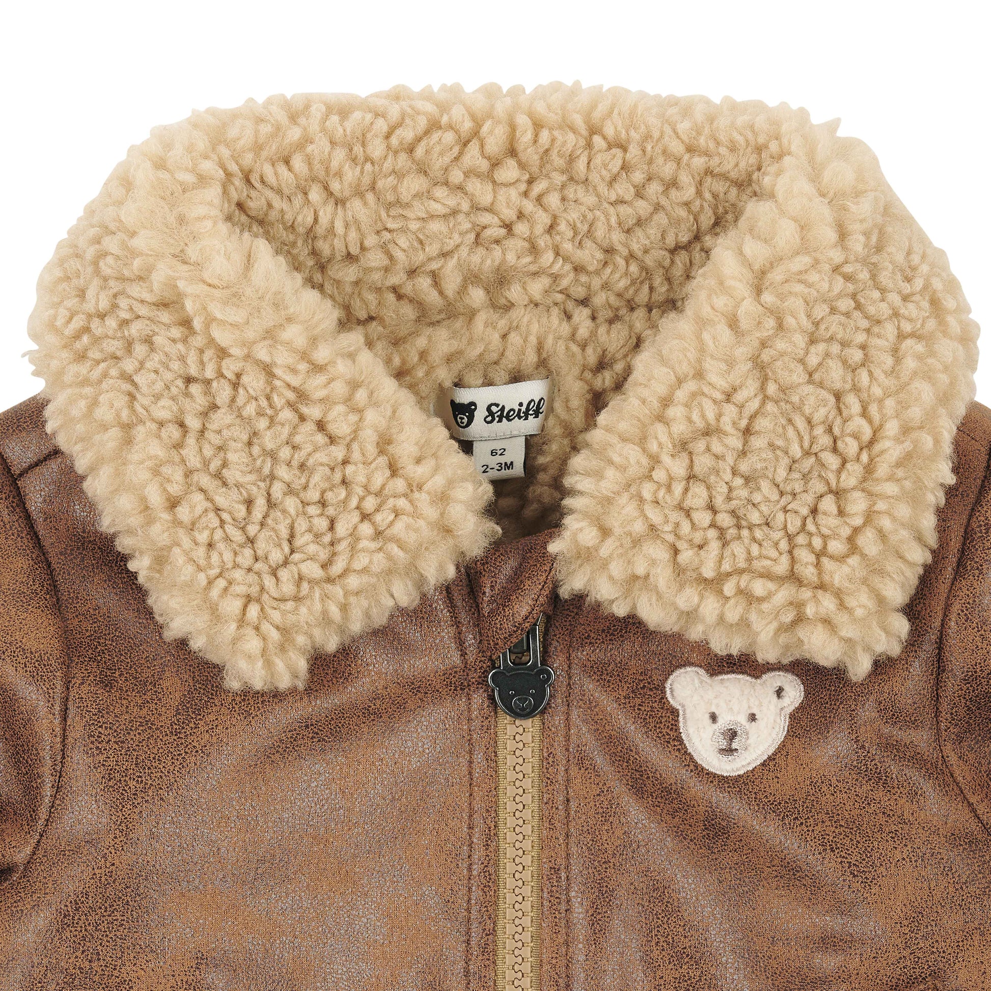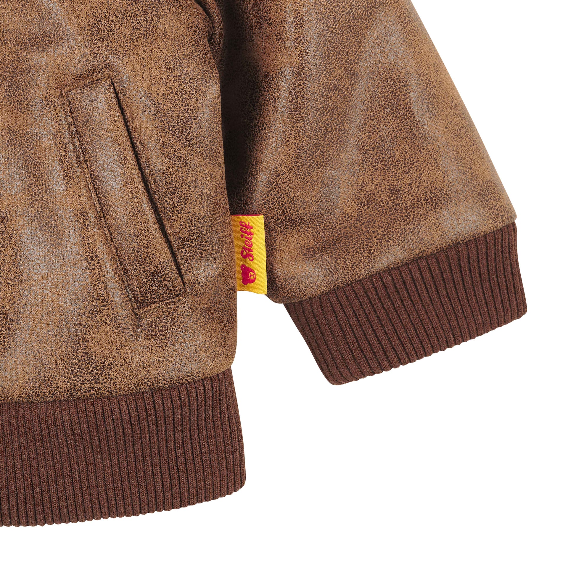 Für stilvolle Weltentdecker ist diese Jacke aus weichem Kunstleder ein echter Hingucker. Der kuschelige Kragen in Plüsch-Optik sorgt für angenehme Wärme an kühleren Tagen, während Rippbündchen und seitliche Eingrifftaschen das Design praktisch und bequem machen. Die Jacke ist gefüttert und wattiert und bietet so extra kuschelige Wärme. Der Reißverschluss in der Mitte ermöglicht unkompliziertes An- und Ausziehen. Auf der linken Brust begleitet das klassische Steiff Teddybärmotiv kleine Entdecker bei jedem Abenteuer – charmant, vertraut und immer mit dabei.