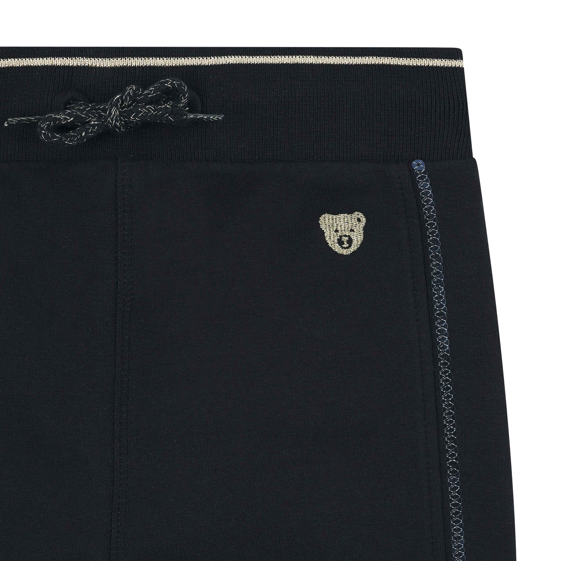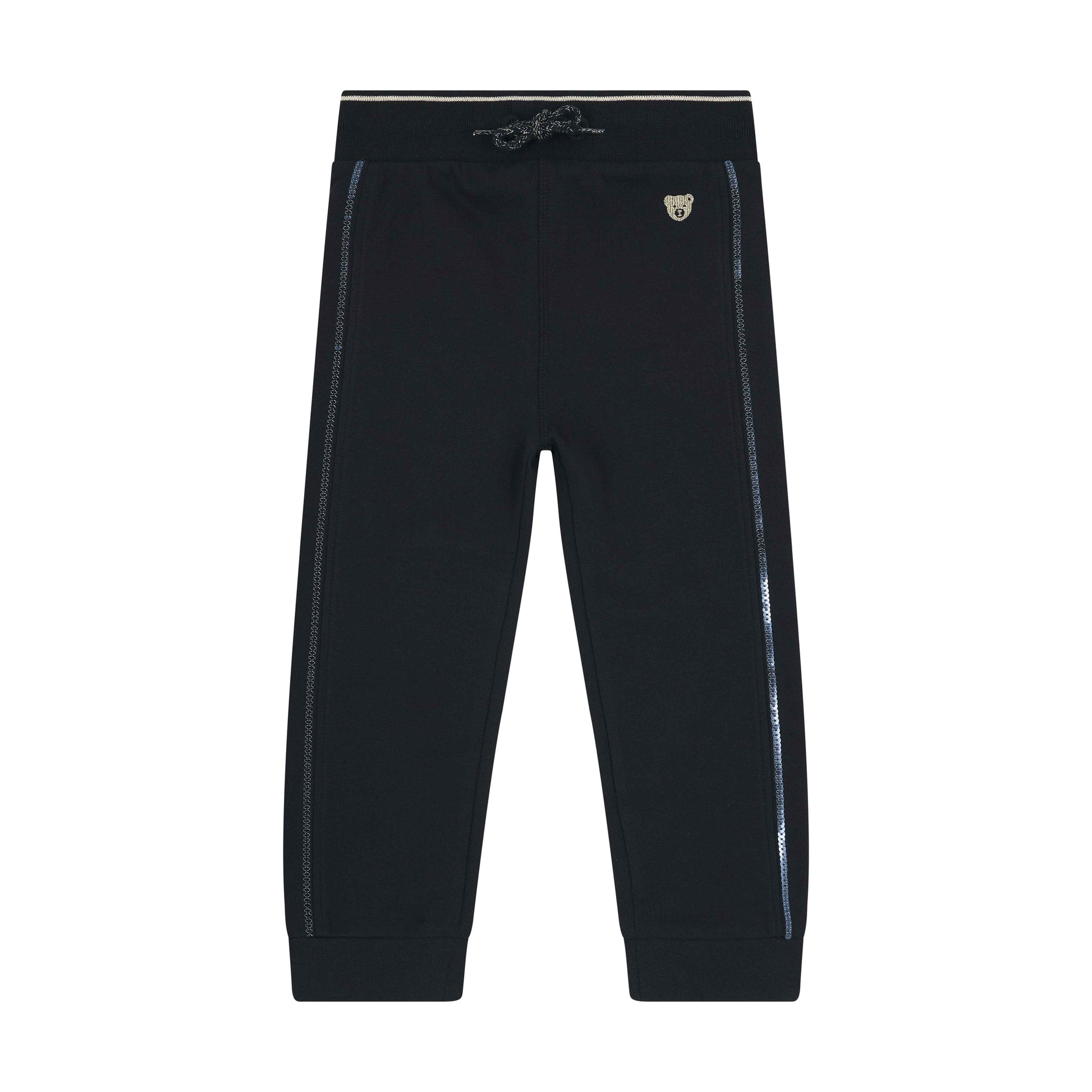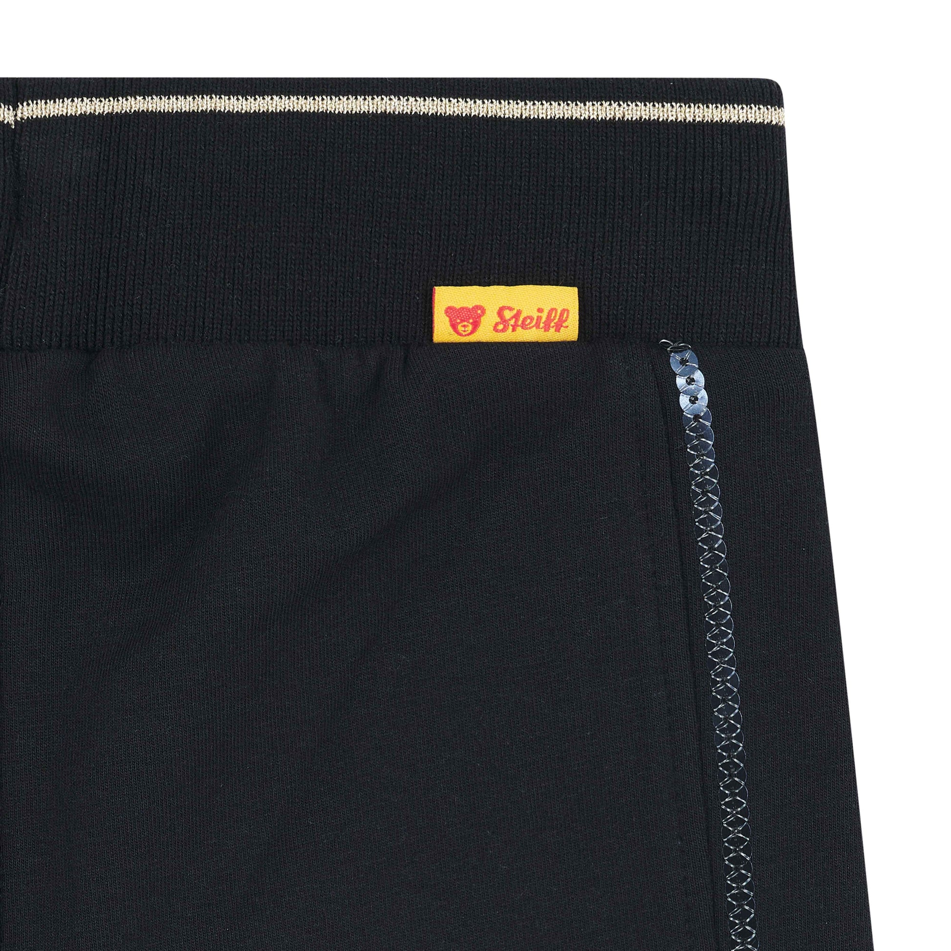 Diese lässige Jogginghose begeistert kleine Stilikonen mit einem tollen Mix aus Komfort und Glamour. Der weiche Sweat Stoff und die lockere Passform mit elastischen Rippbündchen an den Beinabschlüssen bieten maximale Bewegungsfreiheit. Der Softbund mit Bindebändern ist dank goldenen Metallic-Streifen ein echter Hingucker und lässt sich individuell anpassen. Ein besonderes Highlight: seitlich eingesetzte Streifen mit schimmerndem Paillettenband, die den sportlichen Look elegant veredeln. Auf der Vorderseite rundet das klassische Steiff Teddybärmotiv den Style liebevoll ab – ein funkelnder Favorit mit Wohlfühlgarantie.