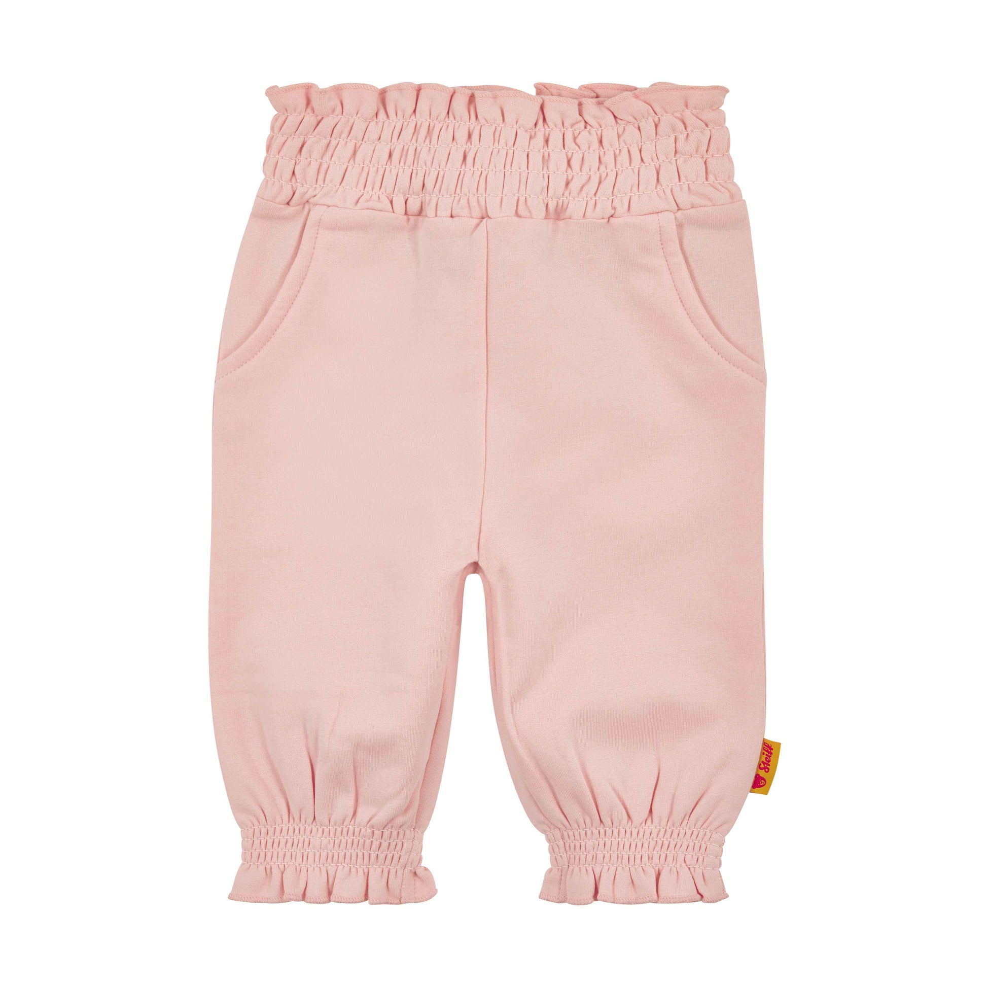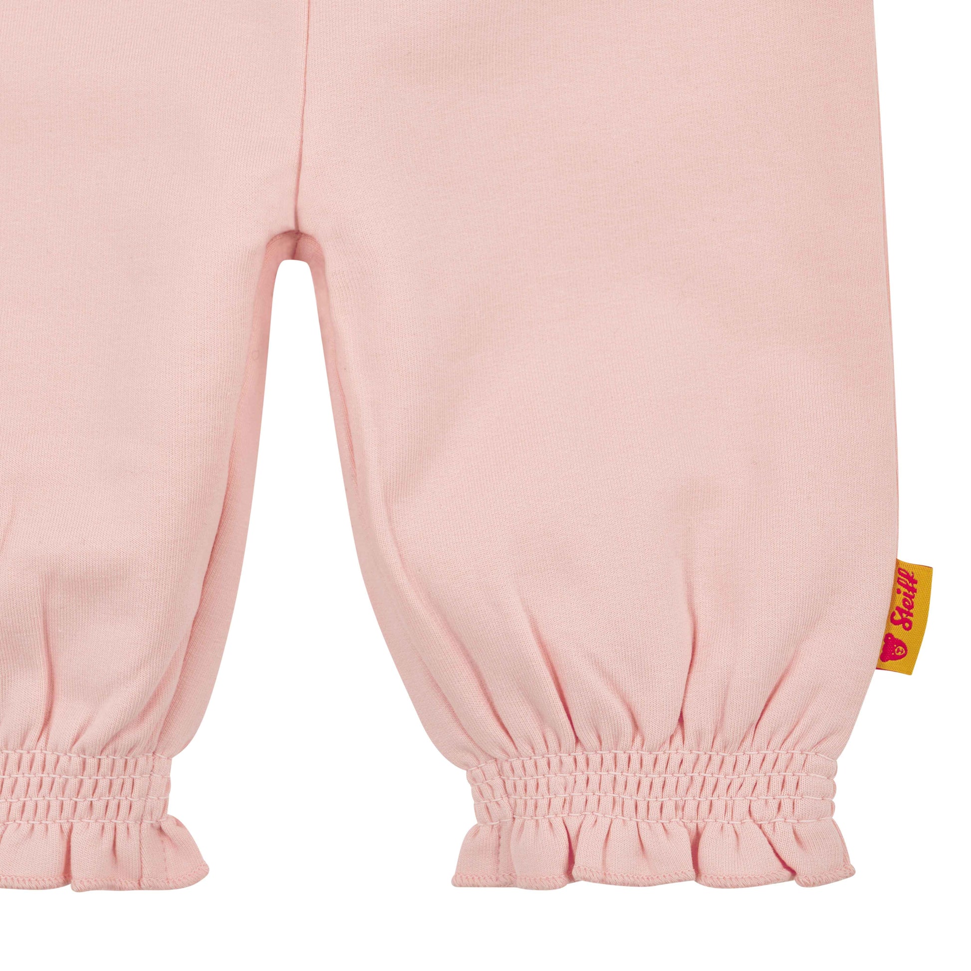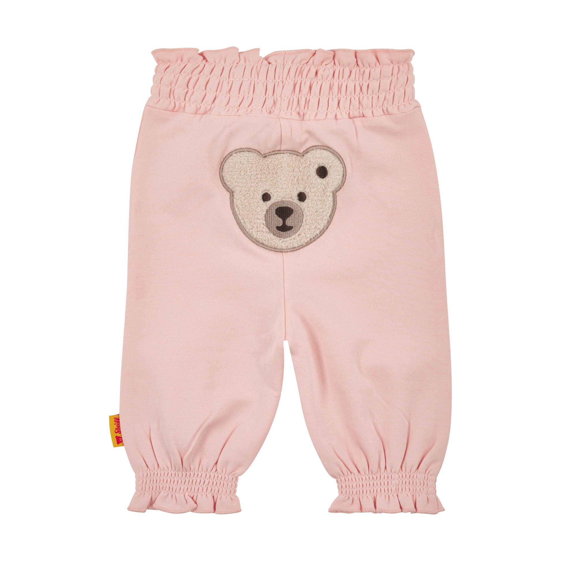 Diese gemütliche Jogginghose aus weichem Sweat begleitet stilbewusste Weltentdeckerinnen mit viel Bewegungsfreiheit durch den Tag. Ein elastischer Bund mit zartem Smokeinsatz und welligem Abschluss sorgt für eine besonders süße Optik und angenehmen Sitz. Dekorative Eingrifftaschen vorn und liebevolle Raffungen an den Beinabschlüssen unterstreichen den verspielten Look. Auf der Rückseite sorgt das klassische Steiff Teddybärmotiv für einen charmanten Hingucker – ein kuscheliges Lieblingsteil für jeden Tag.