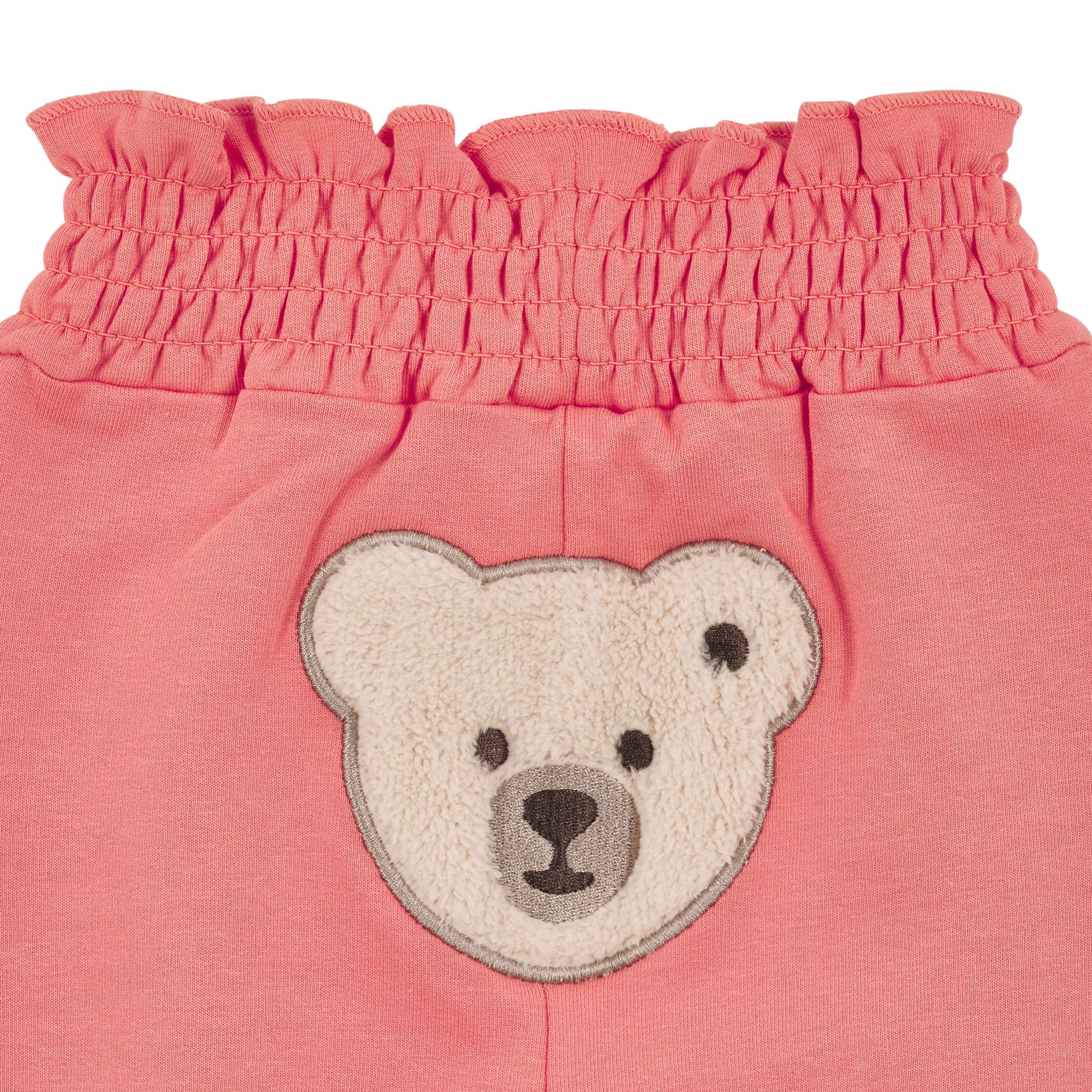 Diese gemütliche Jogginghose aus weichem Sweat begleitet stilbewusste Weltentdeckerinnen mit viel Bewegungsfreiheit durch den Tag. Ein elastischer Bund mit zartem Smokeinsatz und welligem Abschluss sorgt für eine besonders süße Optik und angenehmen Sitz. Dekorative Eingrifftaschen vorn und liebevolle Raffungen an den Beinabschlüssen unterstreichen den verspielten Look. Auf der Rückseite sorgt das klassische Steiff Teddybärmotiv für einen charmanten Hingucker – ein kuscheliges Lieblingsteil für jeden Tag.