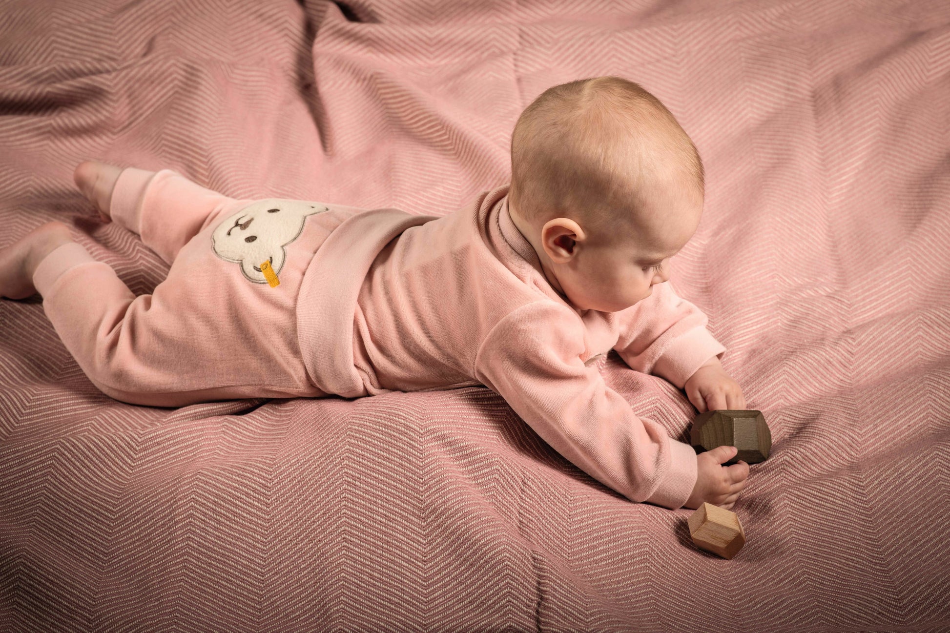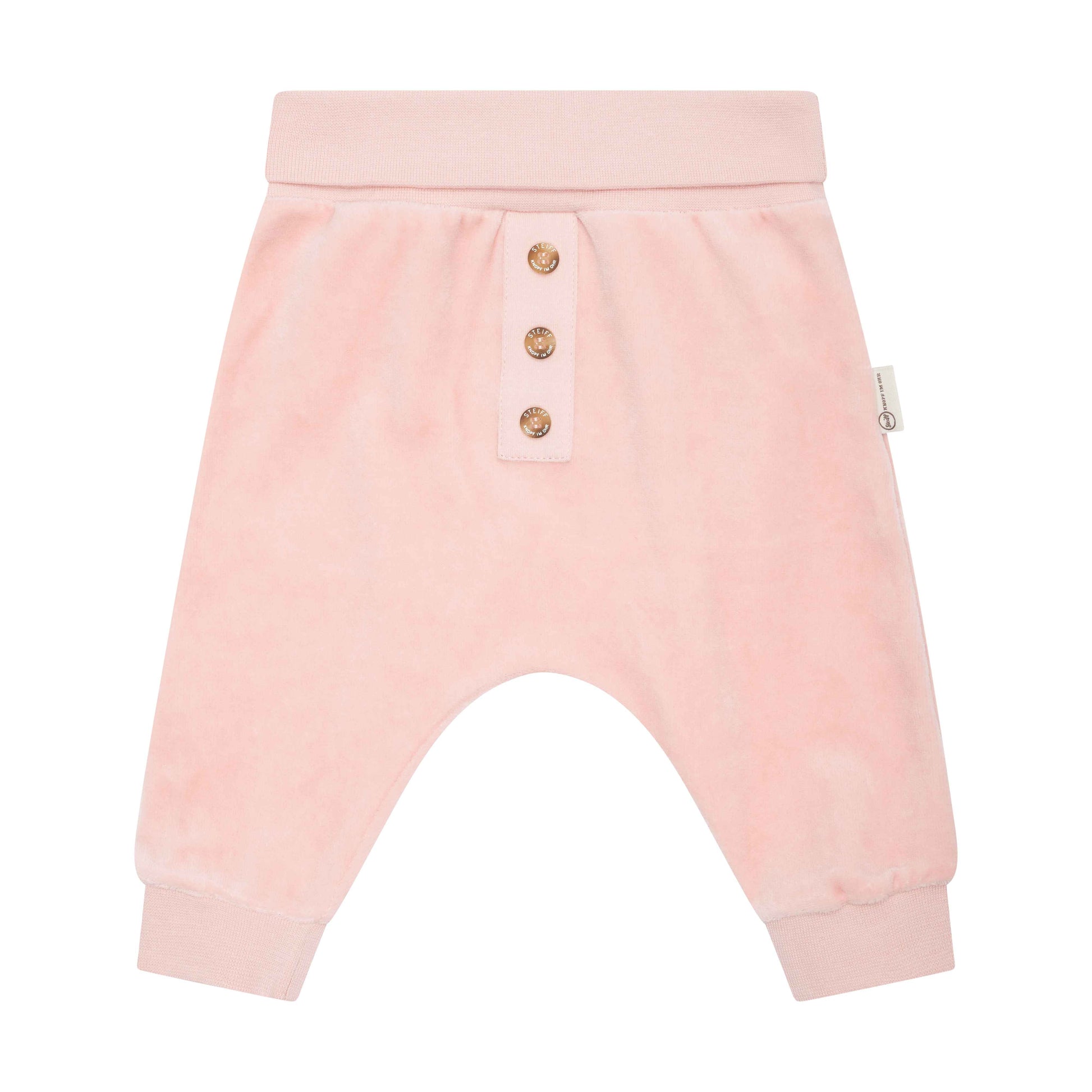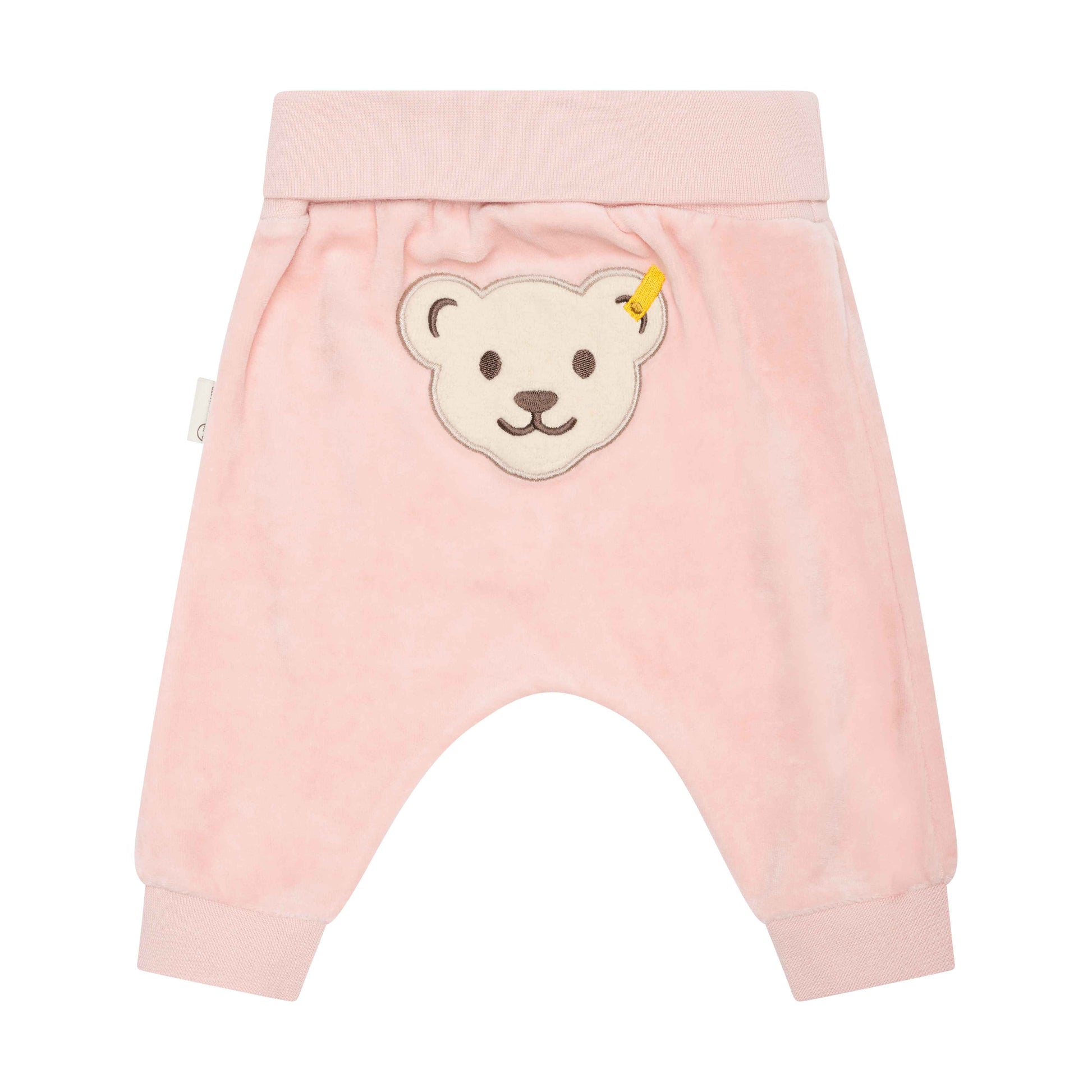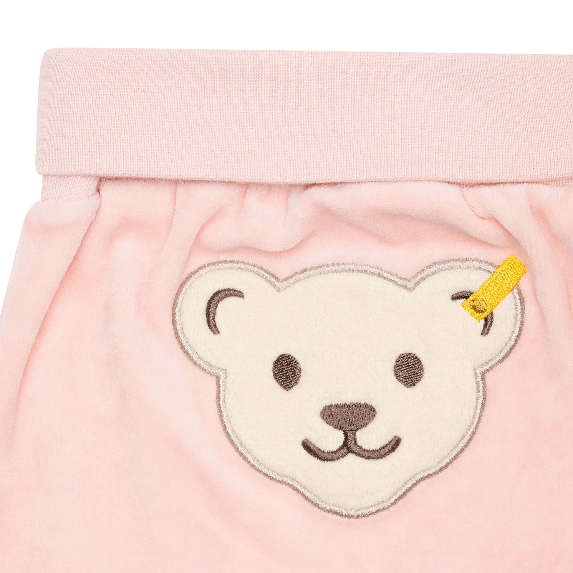 Die Jogginghose aus samtigem Organic Velour ist ein Wärmespender mit Kuschelfaktor. Lockere Passform und Schlupfbund schenken aktiven Kindern viel Bewegungsfreiheit. Ein niedriger Schritt sowie flexible Bündchen am Beinabschluss lassen eine besonders niedliche Silhouette entstehen. Der warme Rosaton wird mit einem gemusterten Body im Handumdrehen zum Wohlfühl-Look gestylt. Mit einem flauschigen Steiff Teddybärmotiv auf dem Rückteil ausgestattet, sind leichte Stürze beim Laufen lernen gar nicht mehr so schlimm. Die Hose ist aus Bio-Baumwolle gefertigt.