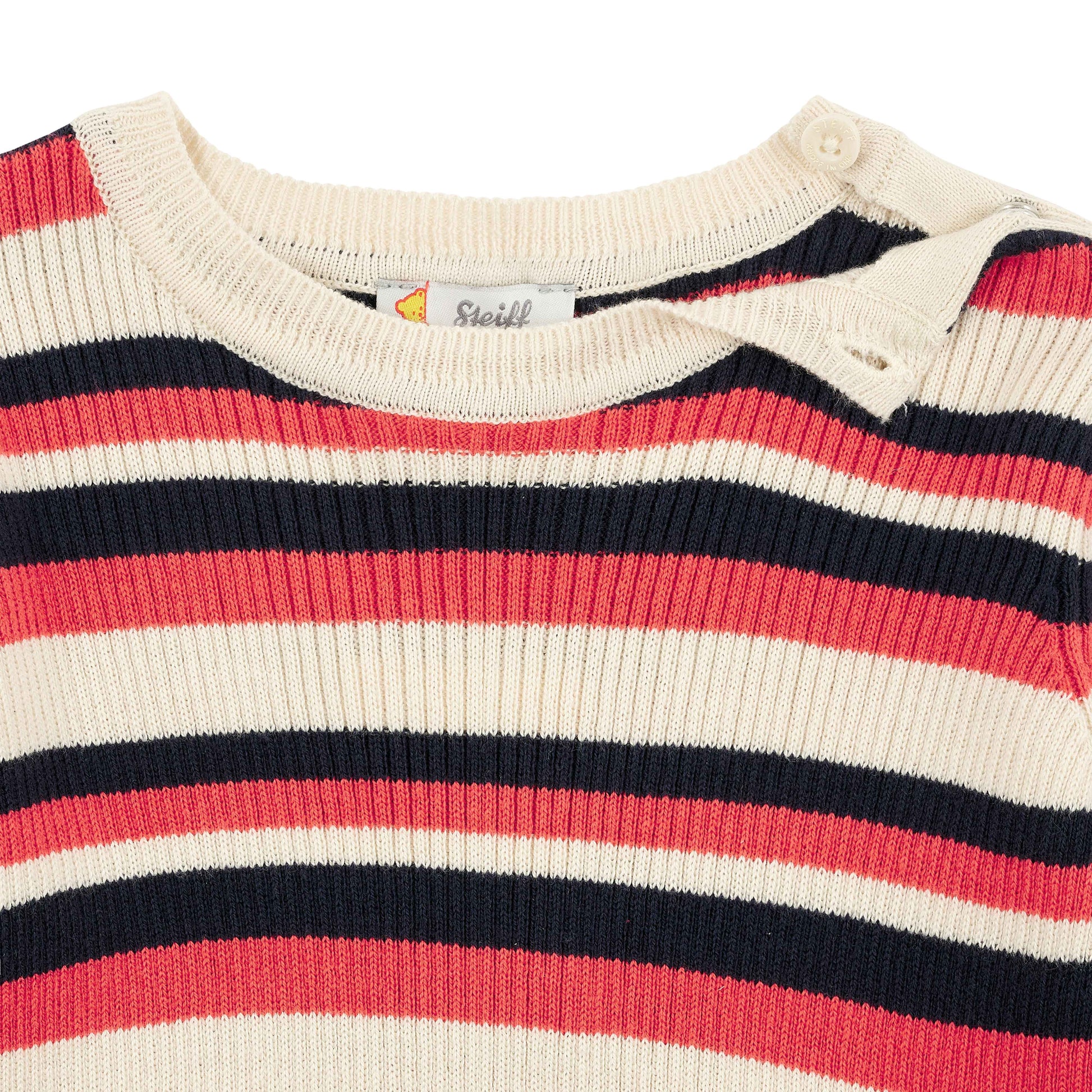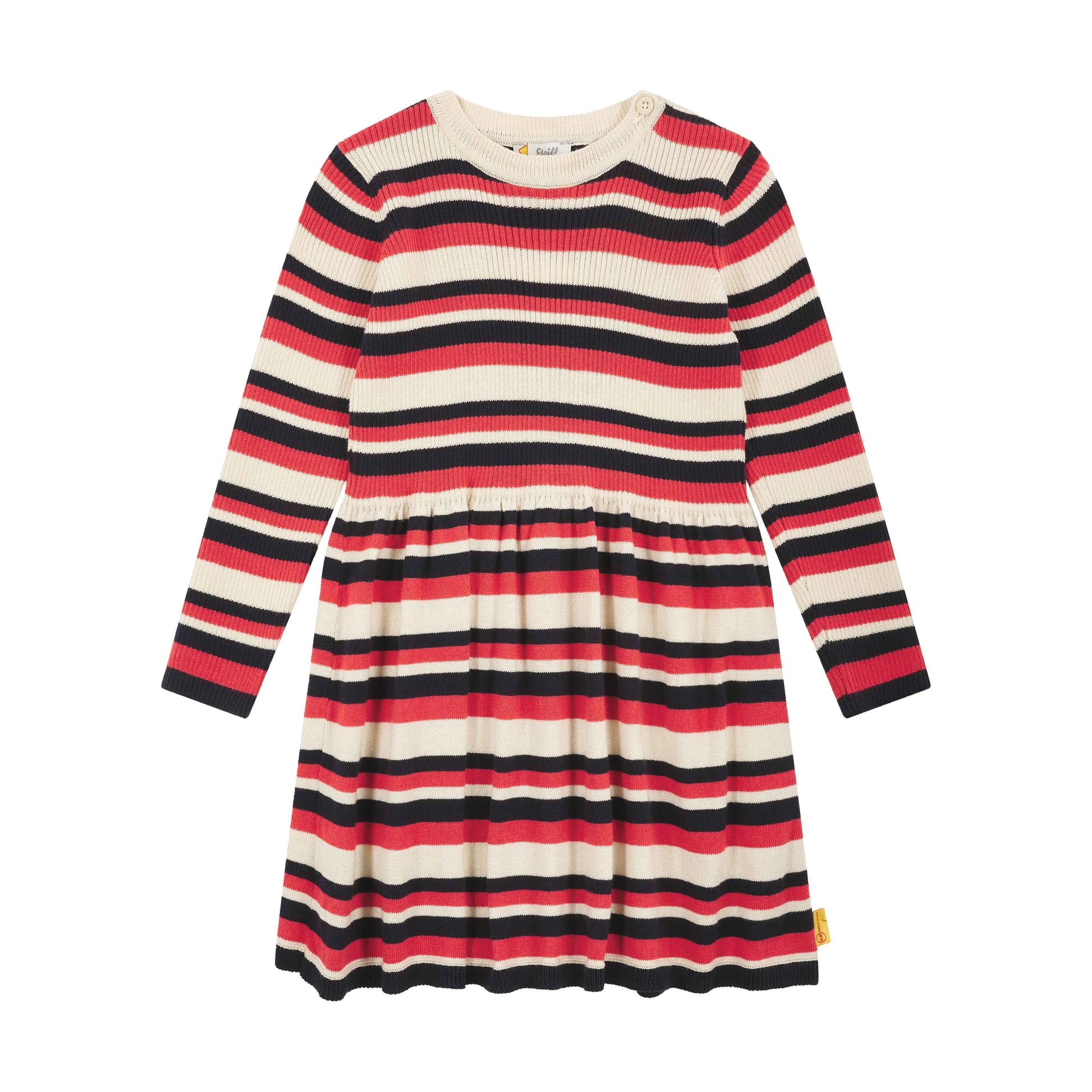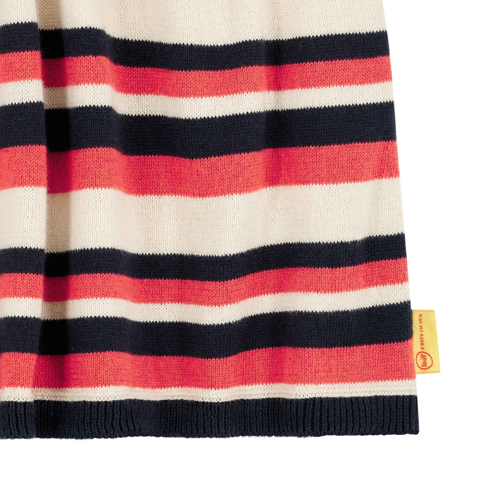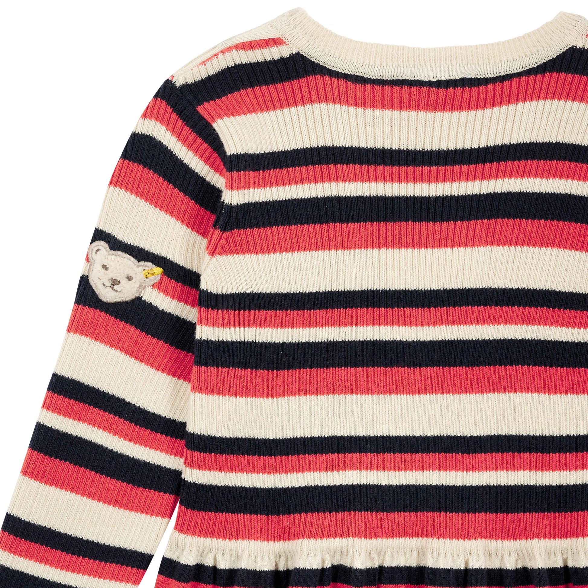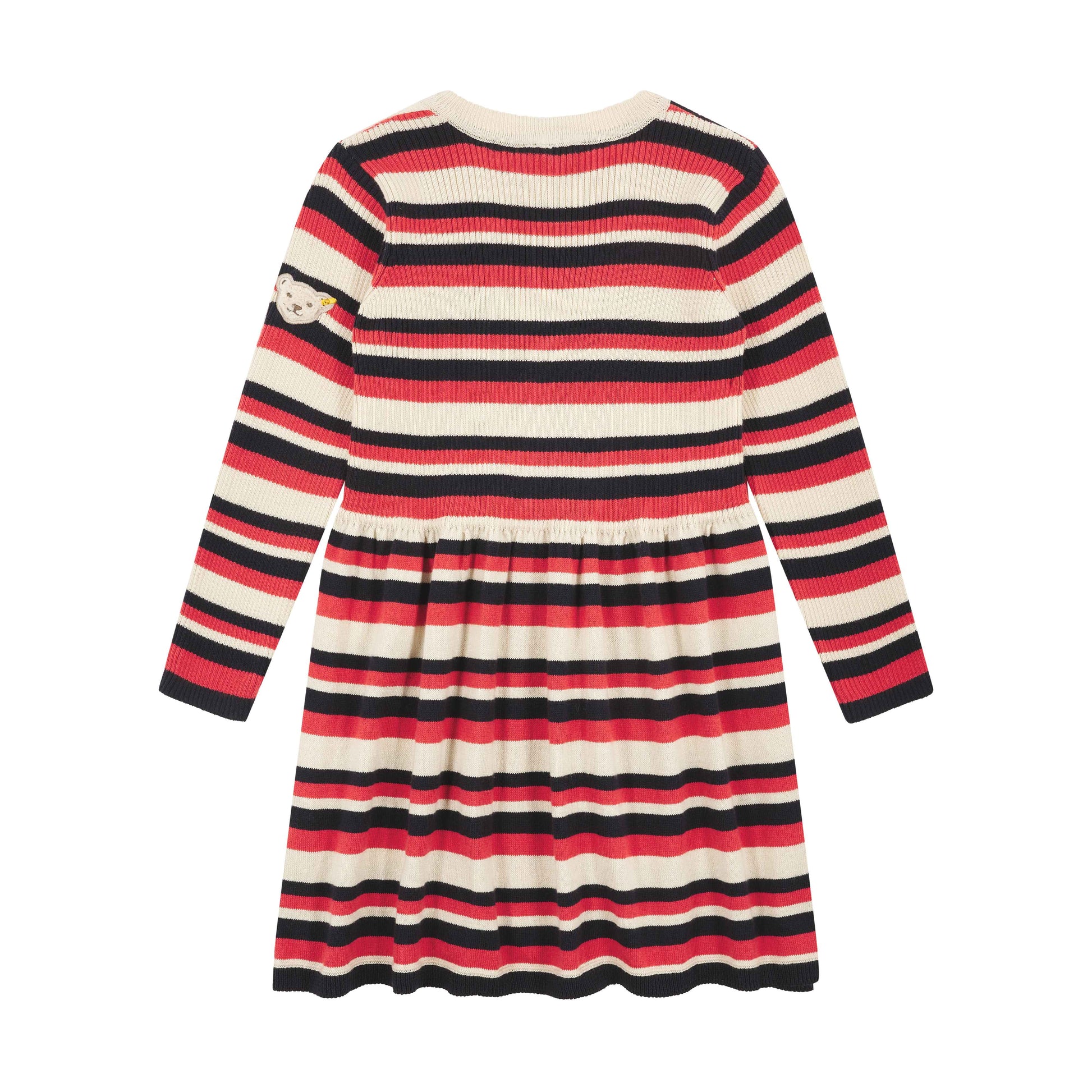 Das langärmlige Ringel-Strickkleid sorgt für niedlichen Chic mit feinem Kuschelfaktor. Pflegeleichter Baumwollstrick wärmt angenehm und bietet ein herrliches Tragegefühl. Flexible Abschlüsse helfen beim Anziehen. Das weite Rockteil mit Falten verleiht eine zauberhafte Silhouette und schenkt aktiven Mädchen unterwegs viel Bewegungsfreiheit. Ein flauschiges Steiff Teddybärmotiv auf dem Arm begleitet Ihre Kleine überallhin. Zum Reinkuscheln!