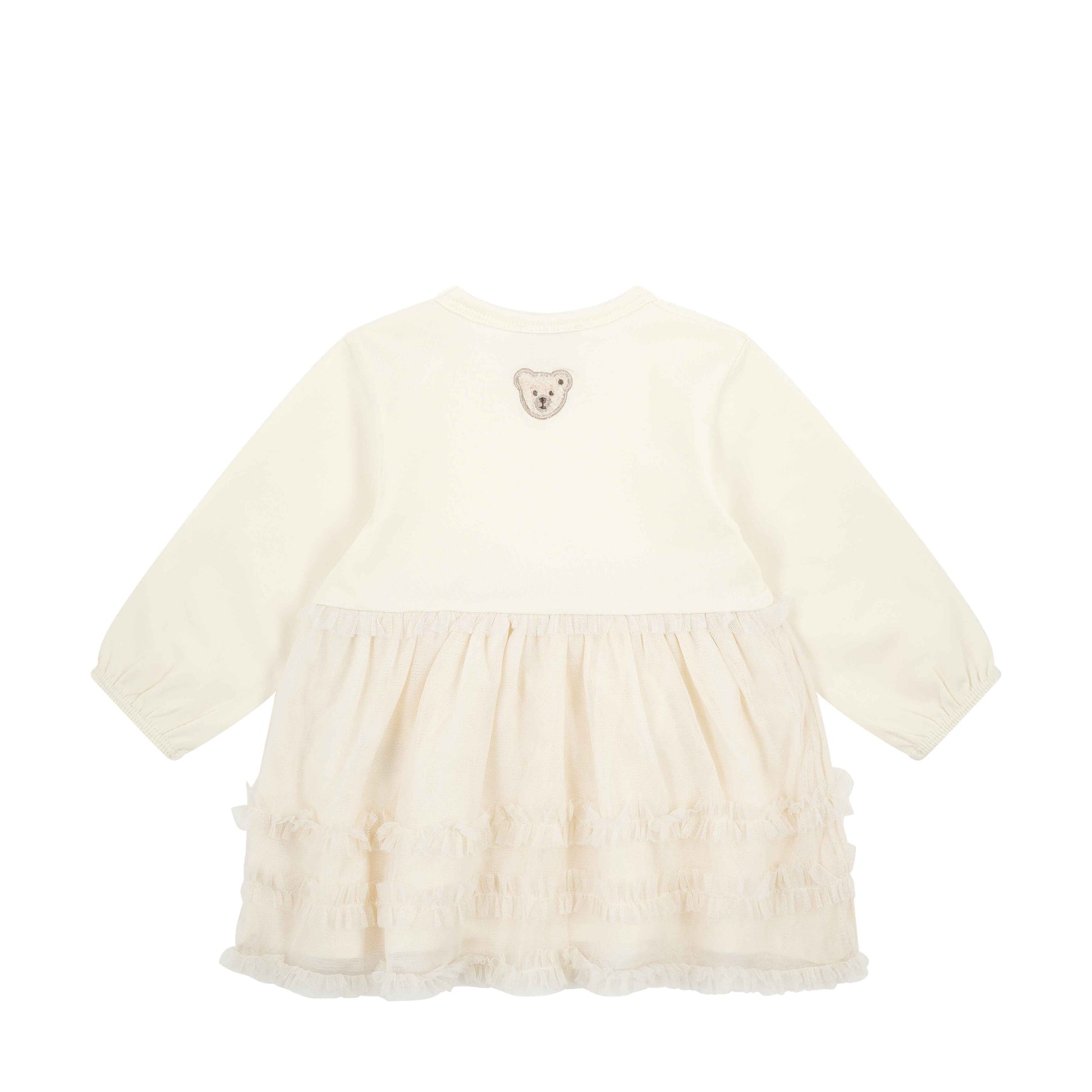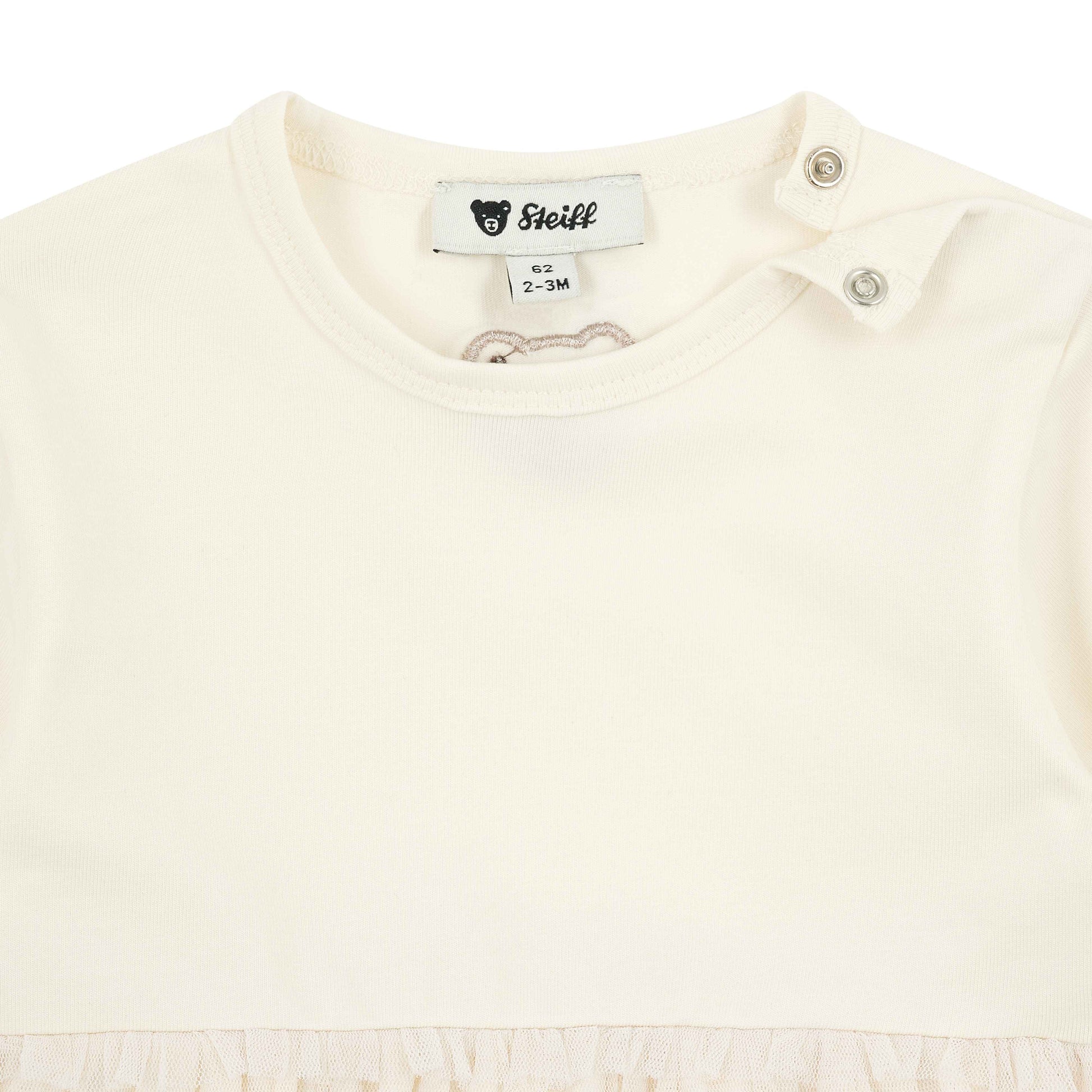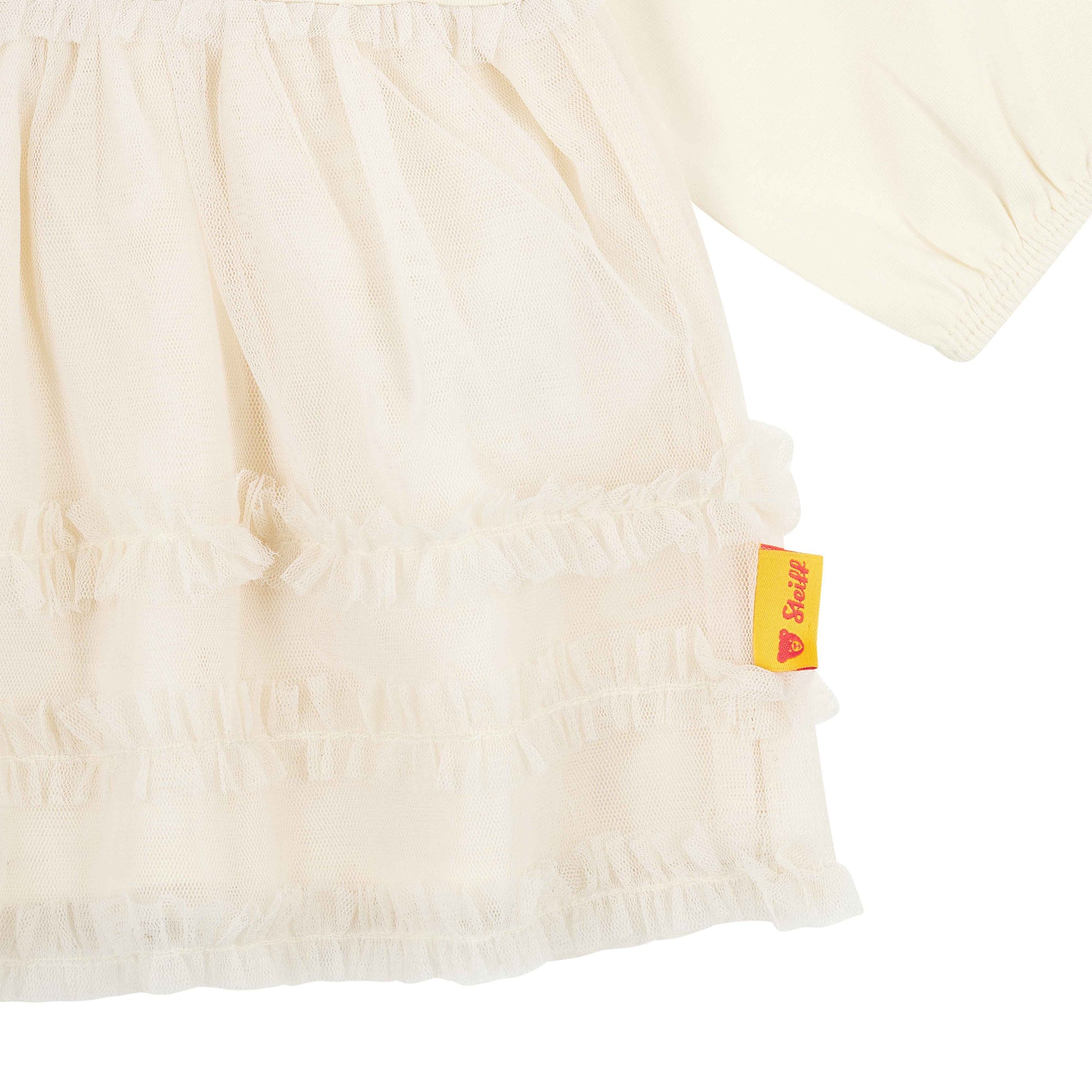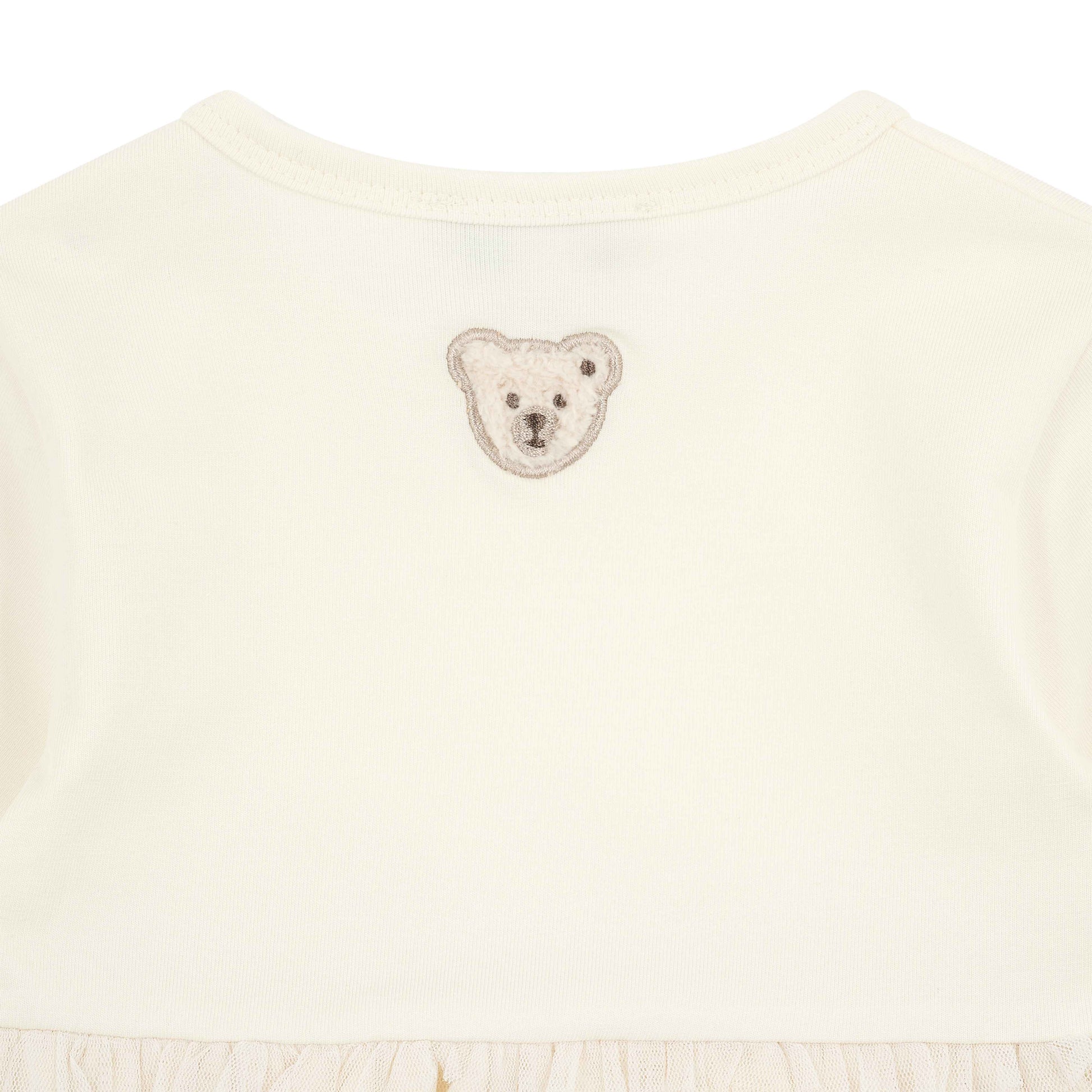 Kleine Romantikerinnen fühlen sich in diesem bezaubernden Kleid rundum wohl. Weicher Single Jersey in zartem Beige sorgt für angenehmen Tragekomfort, während feine Raffungen und verspielte Rüschen am Rockteil dem Look eine mädchenhafte Note verleihen. Der leicht ausgestellte Schnitt lädt zum Spielen und Wohlfühlen ein. Praktische Druckknöpfe an der Schulter erleichtern das An- und Ausziehen. Auf der Rückseite setzt das klassische Steiff Teddybärmotiv einen liebevollen Akzent – ein charmantes Detail, das Geborgenheit schenkt und kleine Stilikonen durch den Tag begleitet.