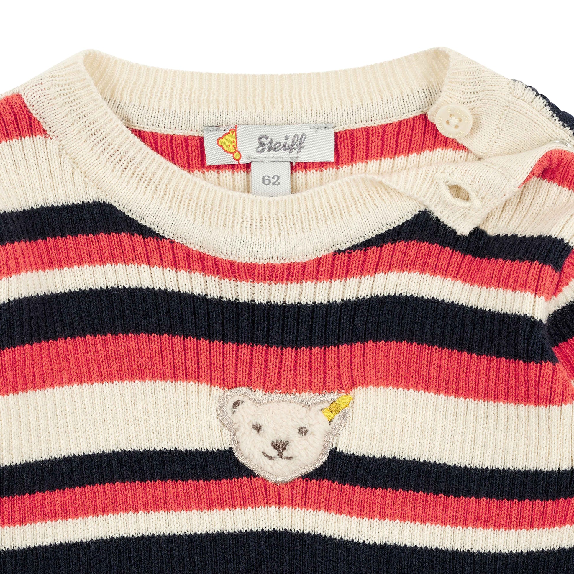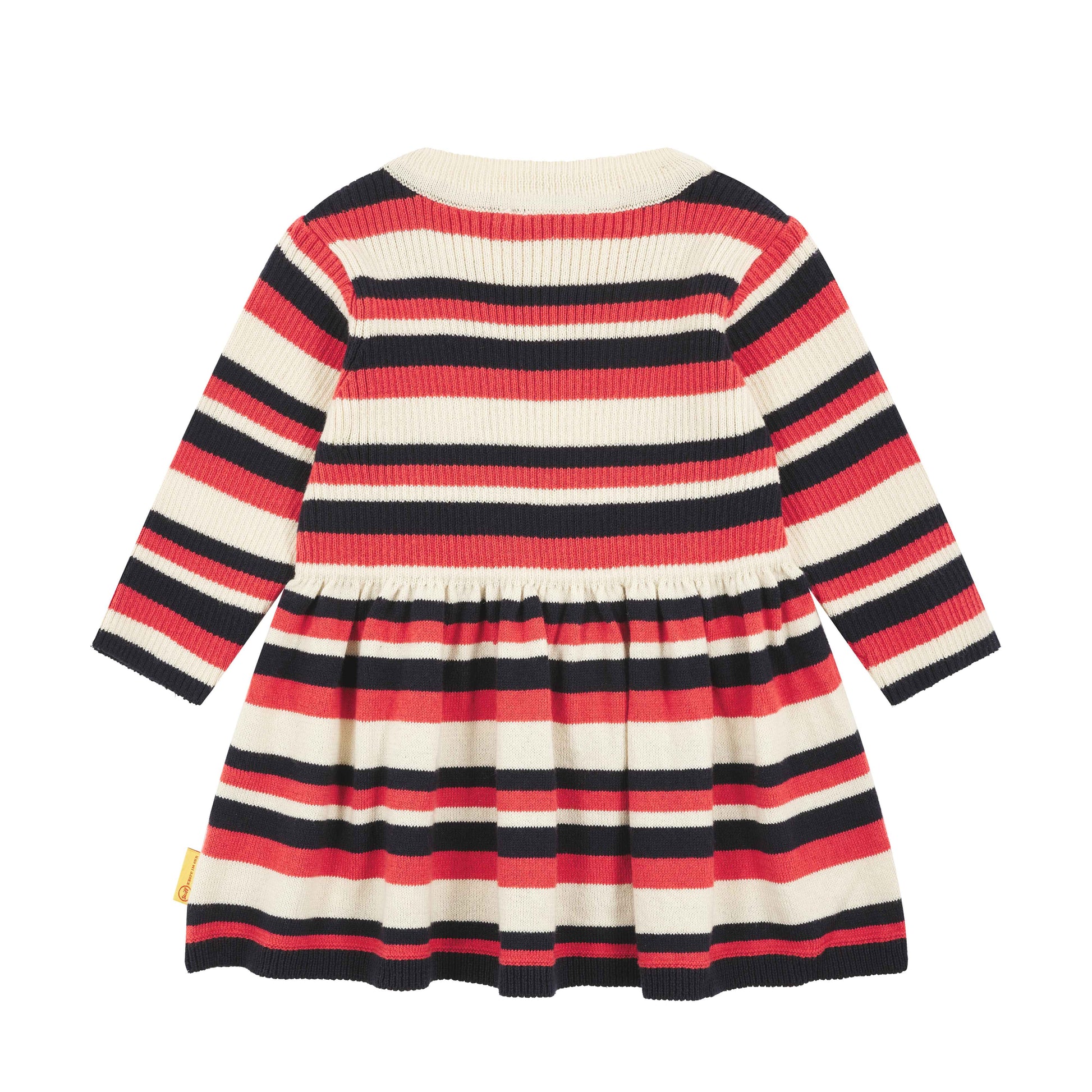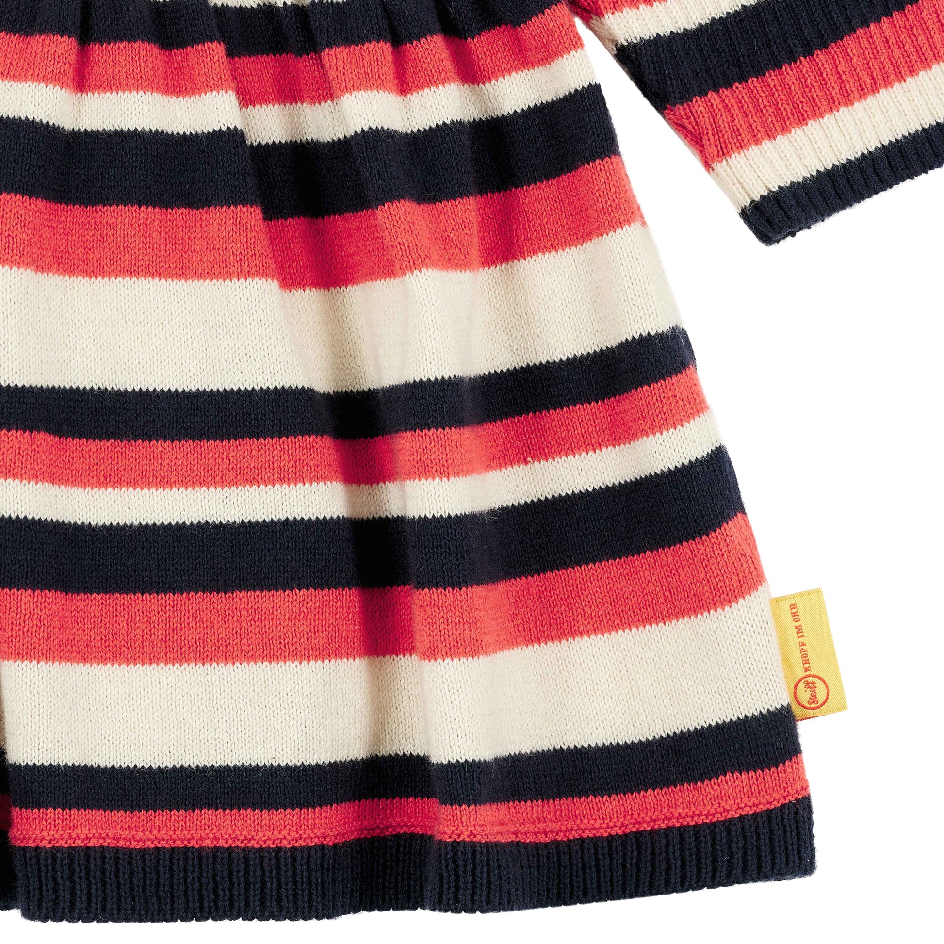 Das langärmlige Ringel-Strickkleid sorgt für niedlichen Chic mit feinem Kuschelfaktor. Pflegeleichter Baumwollstrick wärmt angenehm und bietet ein herrliches Tragegefühl. Flexible Abschlüsse helfen beim Anziehen. Das weite Rockteil mit Falten verleiht eine zauberhafte Silhouette und schenkt aktiven Mädchen unterwegs viel Bewegungsfreiheit. Ein flauschiges Steiff Teddybärmotiv auf dem Vorderteil begleitet Ihre Kleine überallhin. Zum Reinkuscheln!