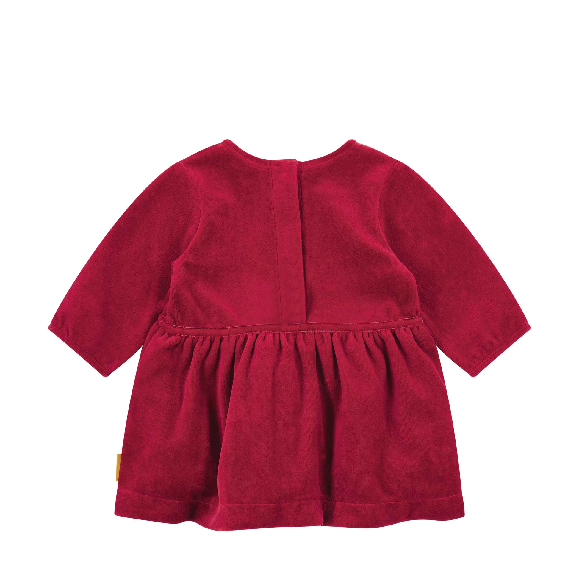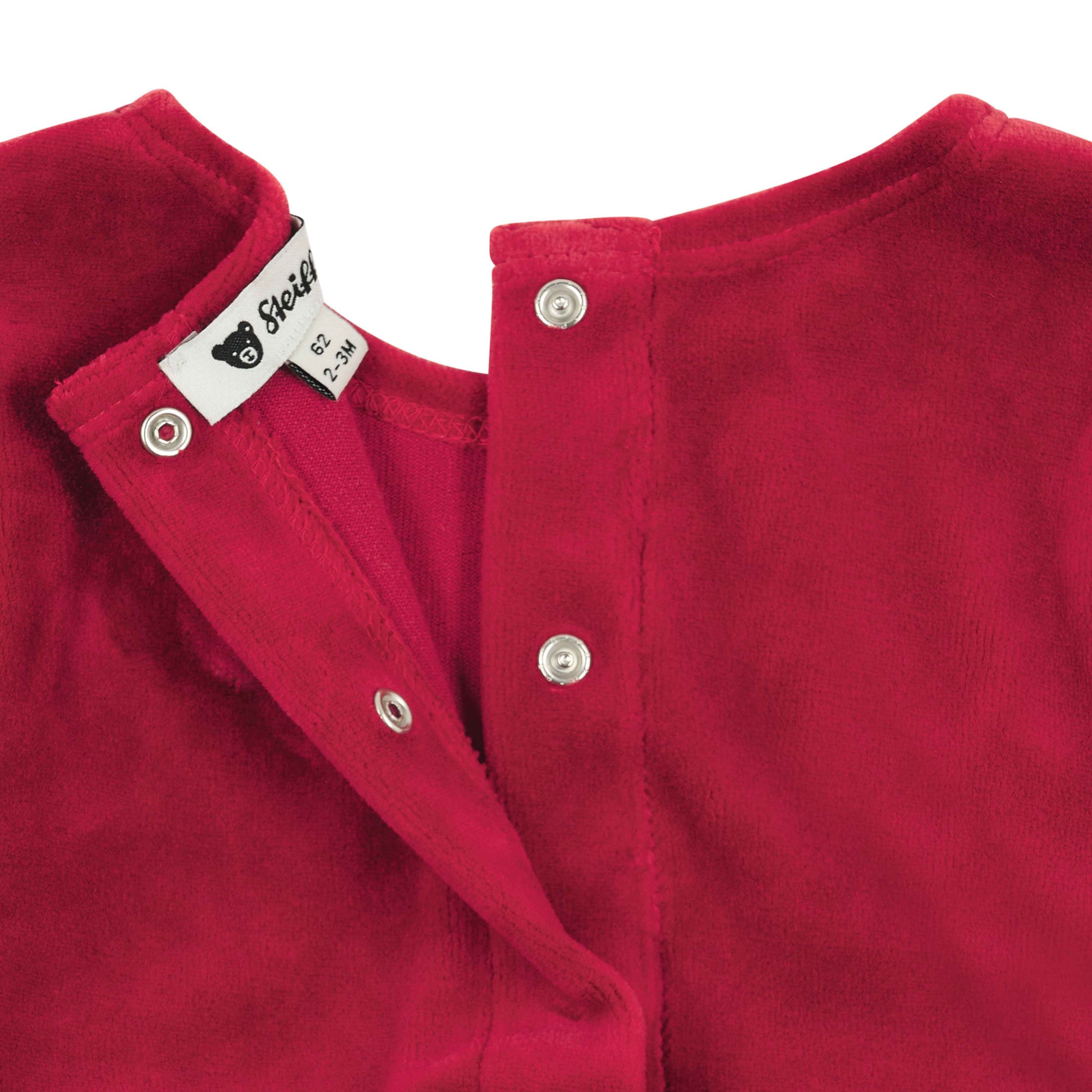 Ein kuscheliges Lieblingskleid für kleine Romantikerinnen: Dieses langärmelige Kleid aus weichem Nicky-Velours begeistert mit herrlich samtigem Griff und satter Farbe. Die weit schwingende Silhouette mit sanften Raffungen in der Taille verleiht dem Design eine verspielte Note und lädt zum Wohlfühlen ein. Eine kleine Schleife auf Taillenhöhe setzt einen süßen Akzent. Dank praktischer Druckknöpfe auf der Rückseite gelingt das An- und Ausziehen im Handumdrehen. Auf der Brust rundet das klassische Steiff Teddybärmotiv das Design charmant ab – ein festlicher Wohlfühllook mit Stil und Kuschelfaktor.