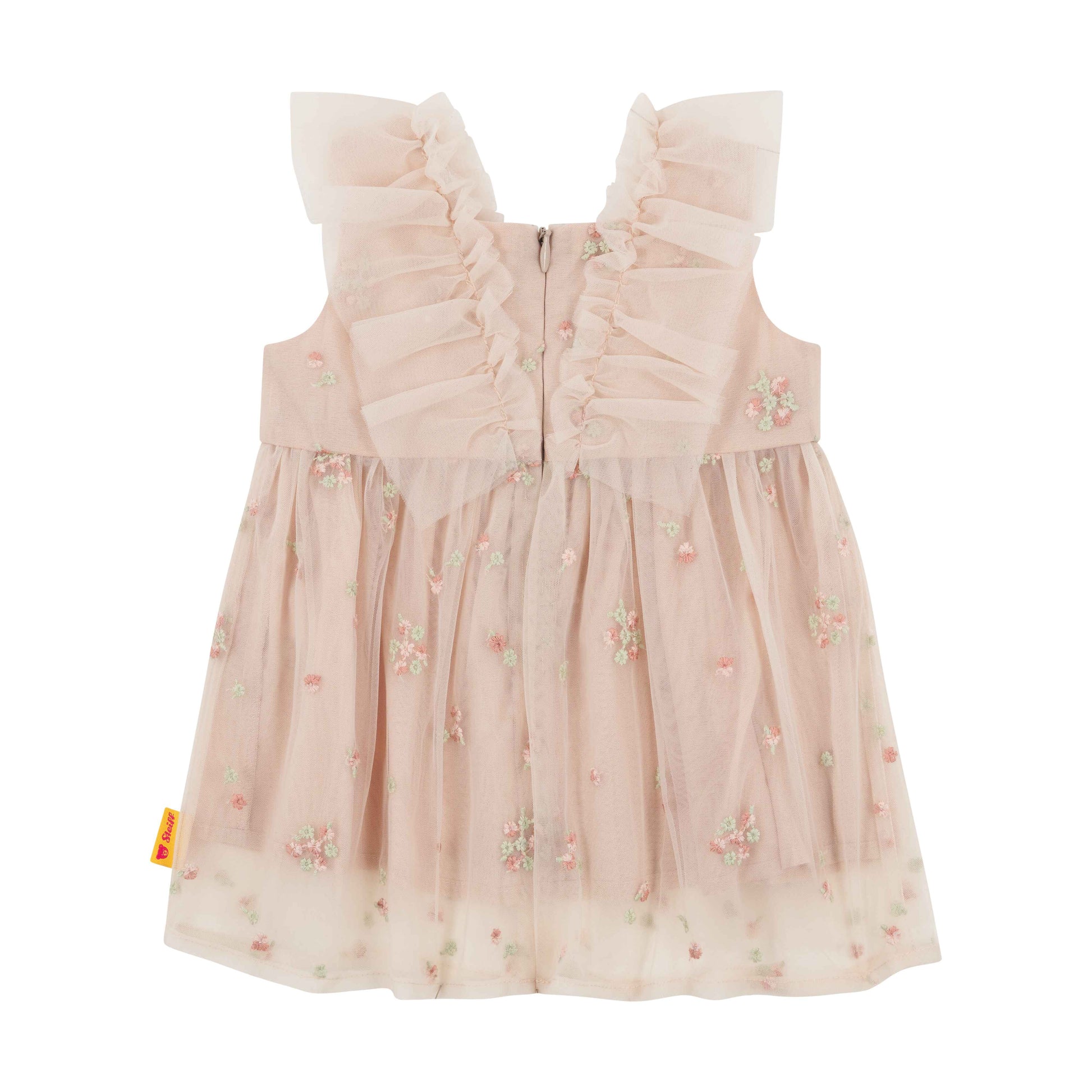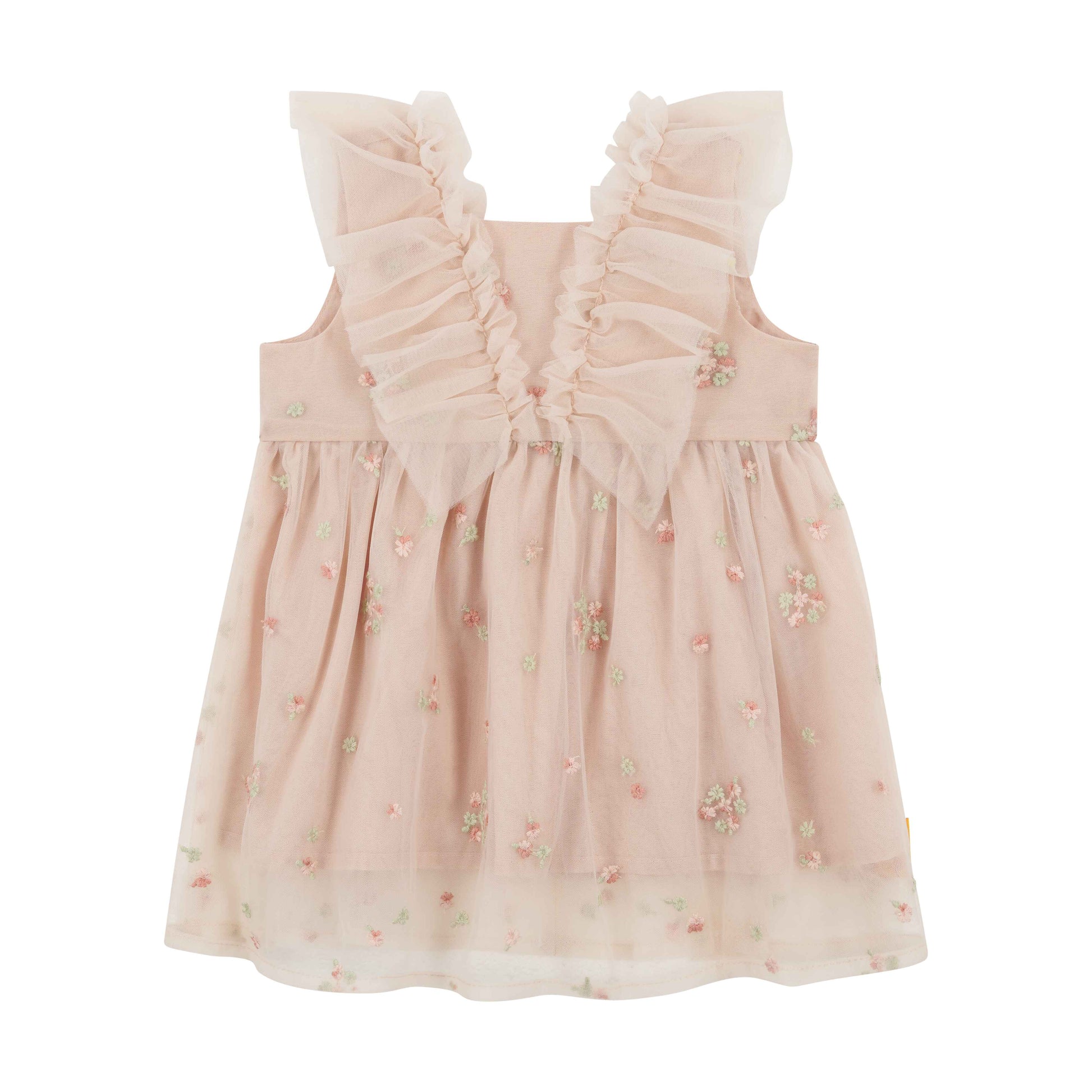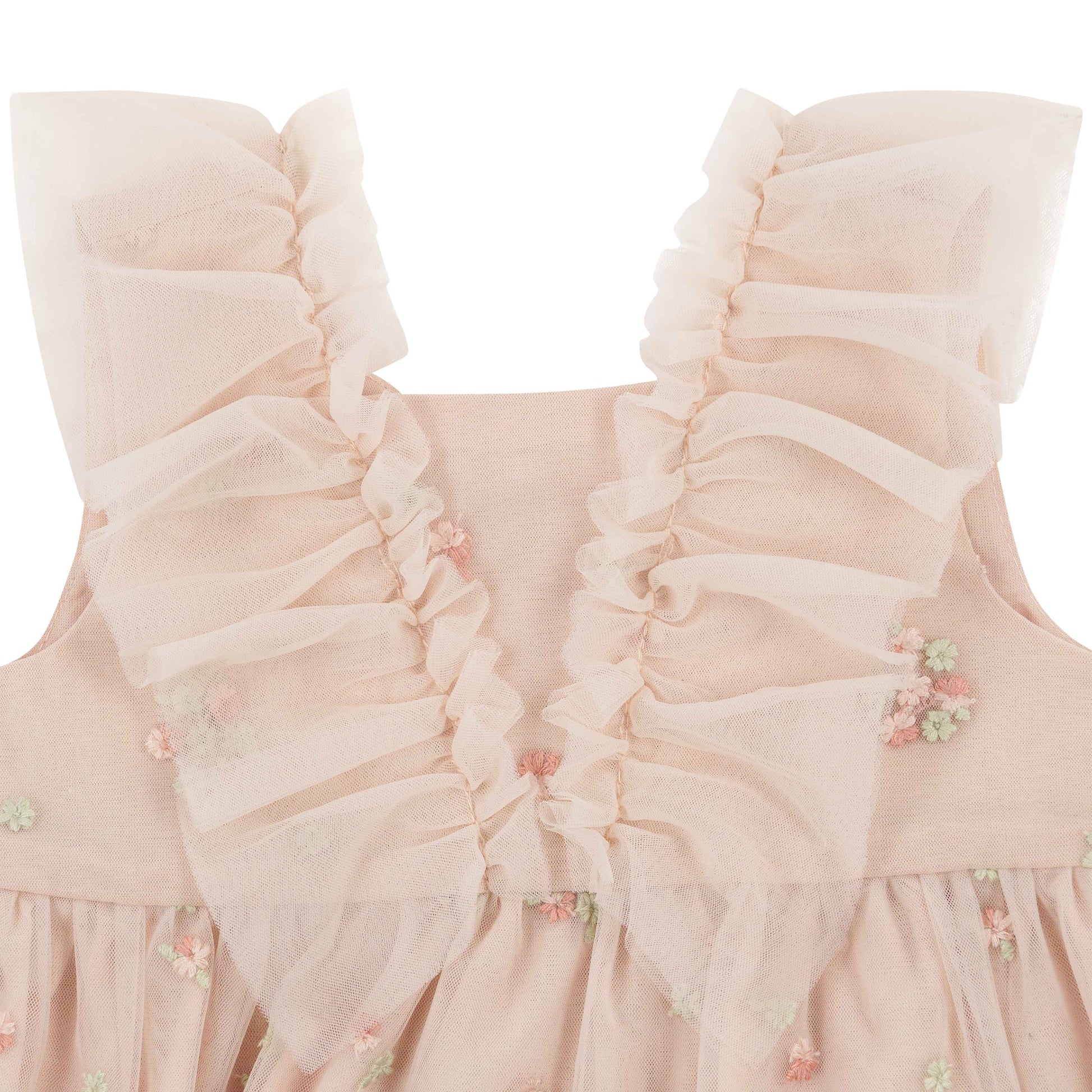 Zart wie ein Sommertraum begleitet dieses bezaubernde Kleid kleine Weltentdeckerinnen durch festliche Momente. Der feine Tüll mit seiner zarten floralen Stickerei verleiht dem Look eine romantische Leichtigkeit, während sanfte Rüschen am Vorderteil und an den Schultern einen Hauch von Verspieltheit hinzufügen. ✨