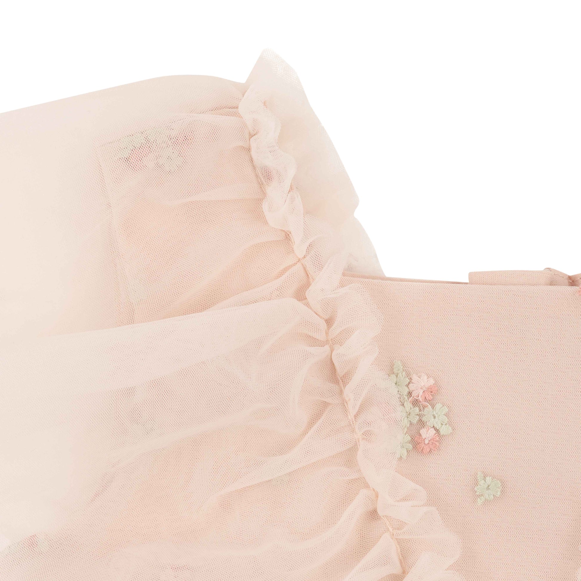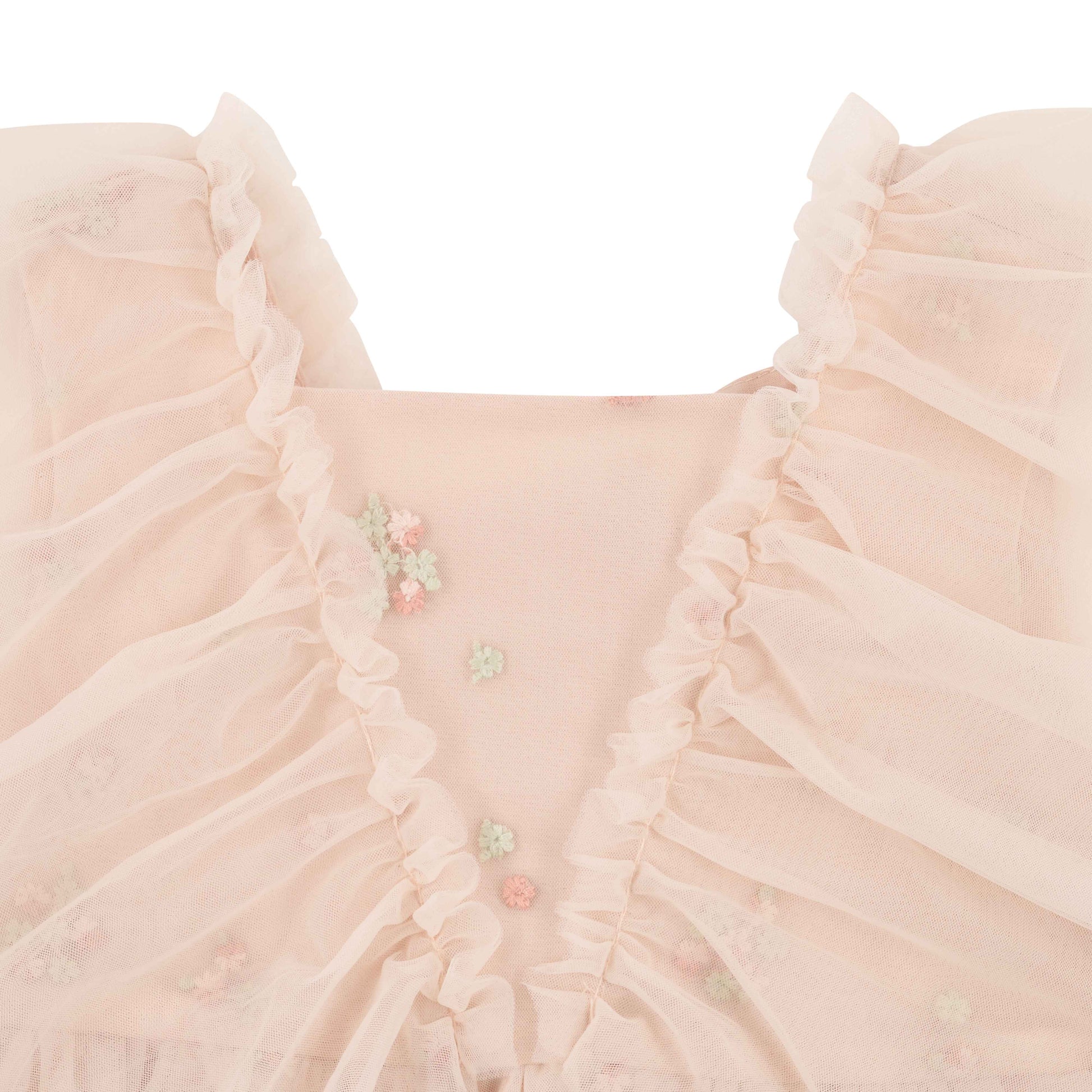 Der feine Tüll mit seiner zarten floralen Stickerei verleiht dem Kleid einen romantischen, fast märchenhaften Ausdruck. Sanfte Rüschen am Vorderteil und an den Schultern setzen verspielte Akzente und lassen jede Bewegung leicht und fröhlich wirken.