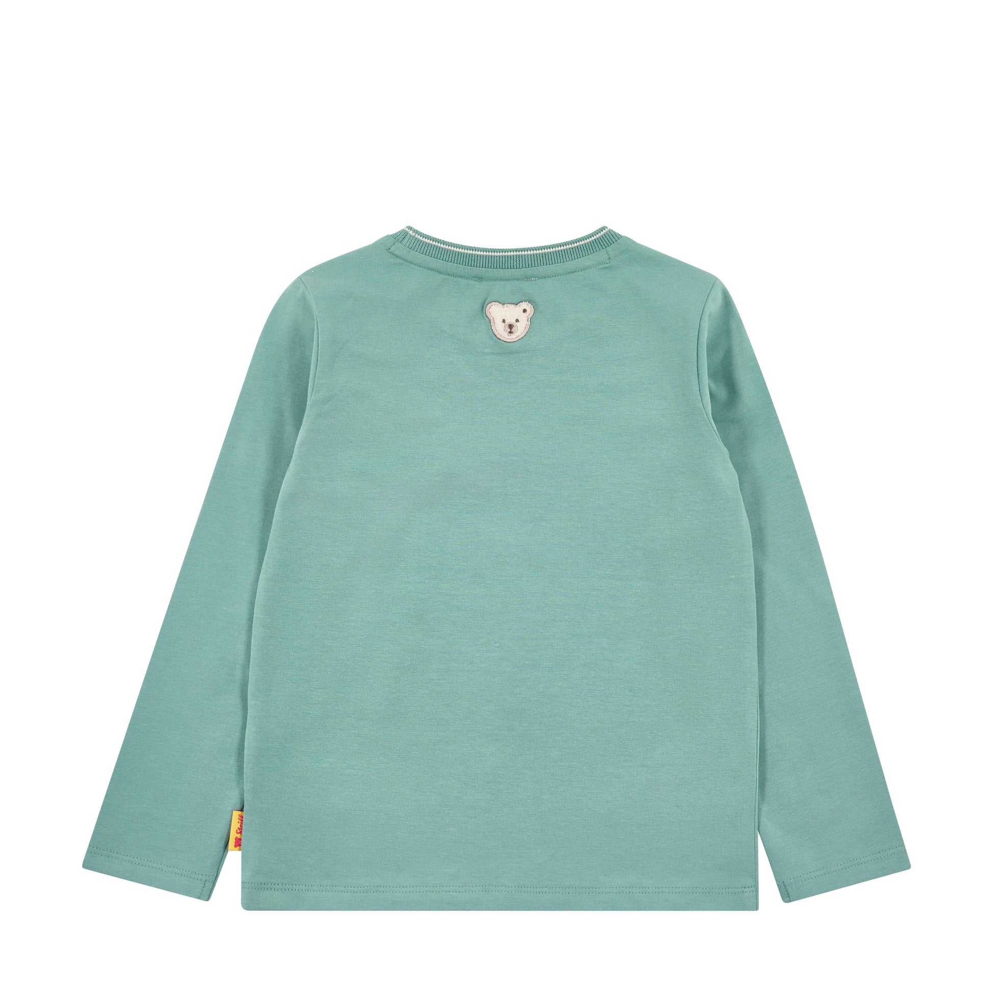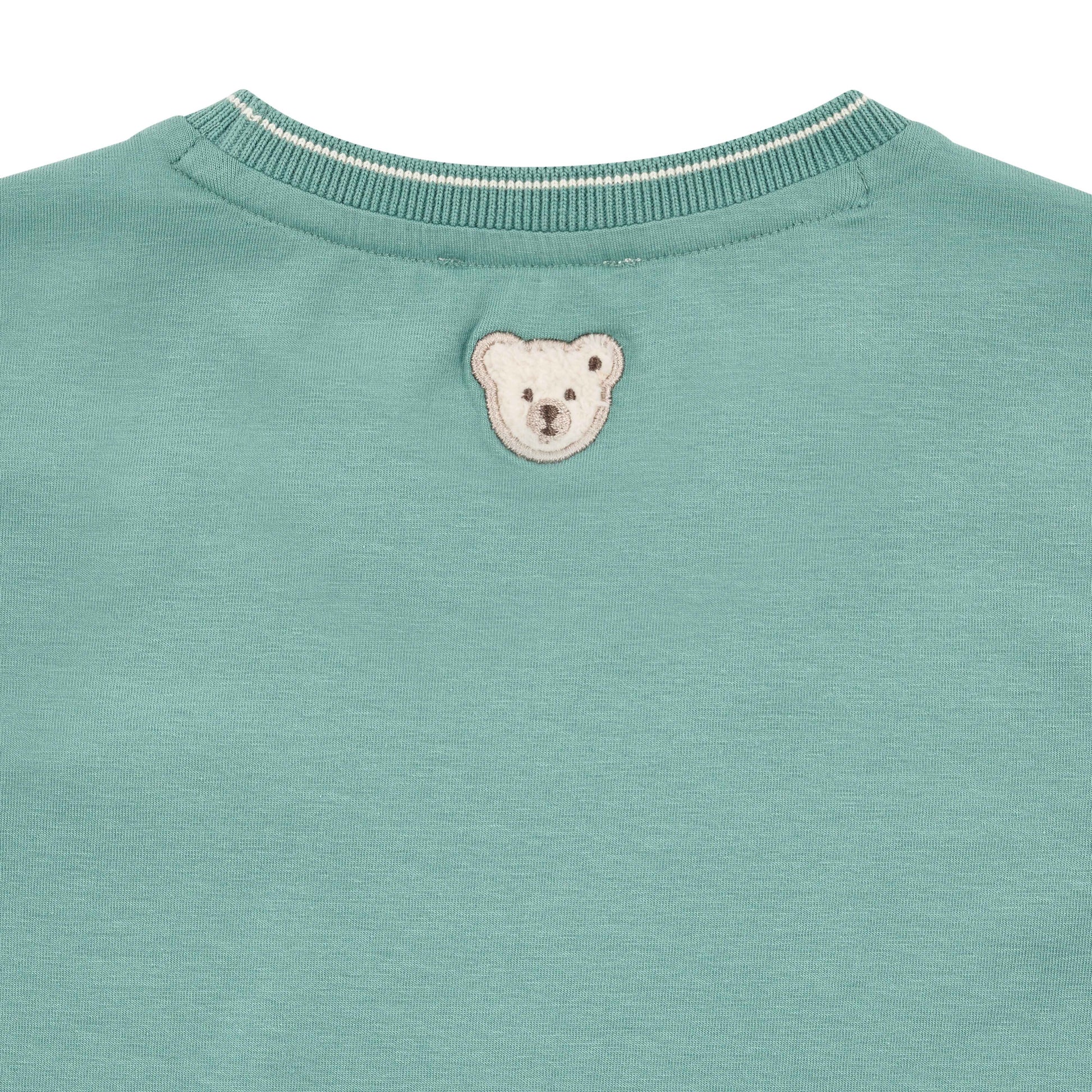 Ein gerippter Halsausschnitt mit feinem Farbkontrast sorgt für optische Abwechslung und rundet das Design sportlich ab. Auf der Rückseite zeigt sich das beliebte Steiff Teddybärmotiv als liebevolles Markenstatement. Ideal für kleine Entdecker mit großem Stilgefühl. 💛✨
