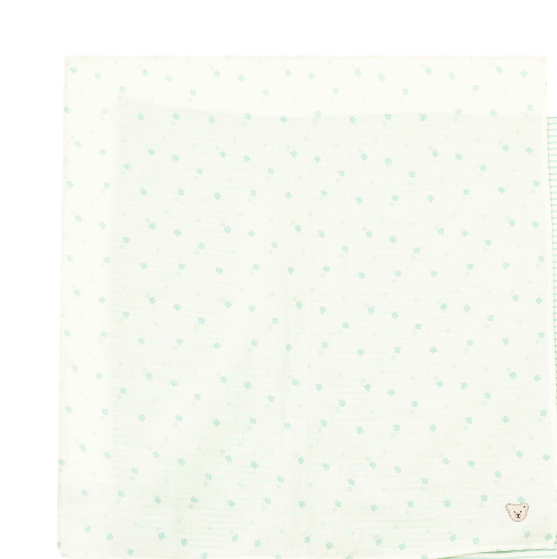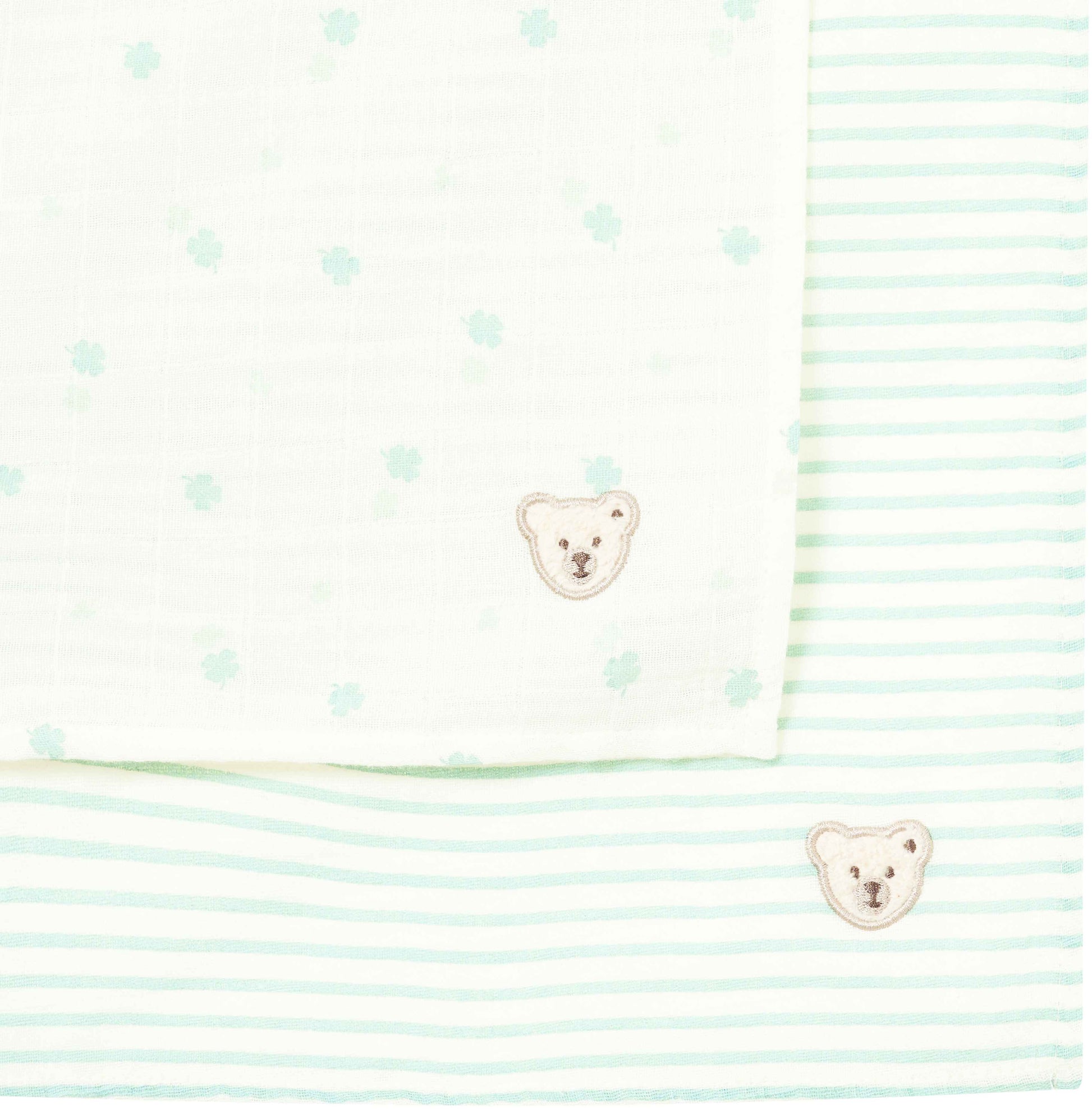 Die beiden Mulltücher kommen mit ganz viel Liebe zum Detail: Ein Tuch zeigt ein zartes Ringel-Design, das andere begeistert mit einem fröhlichen Kleeblattmuster in sanften Grüntönen. Auf beiden ist das klassische Steiff Teddybärmotiv als hochwertige Applikation platziert – und macht die Tücher im Handumdrehen zu kleinen Lieblingsstücken. 🧸