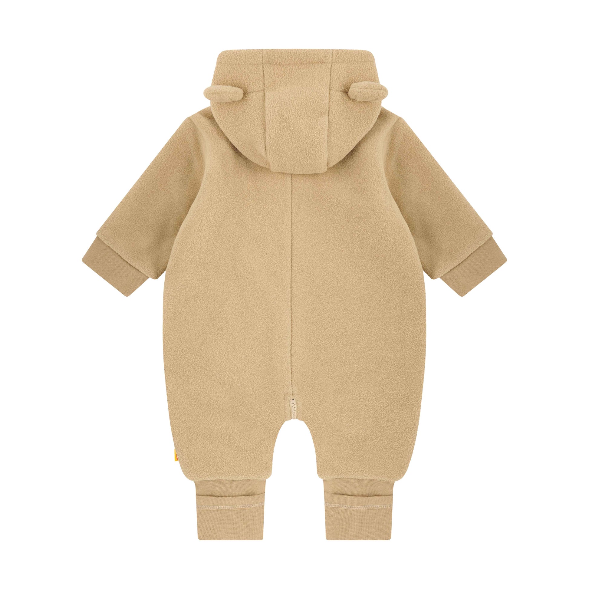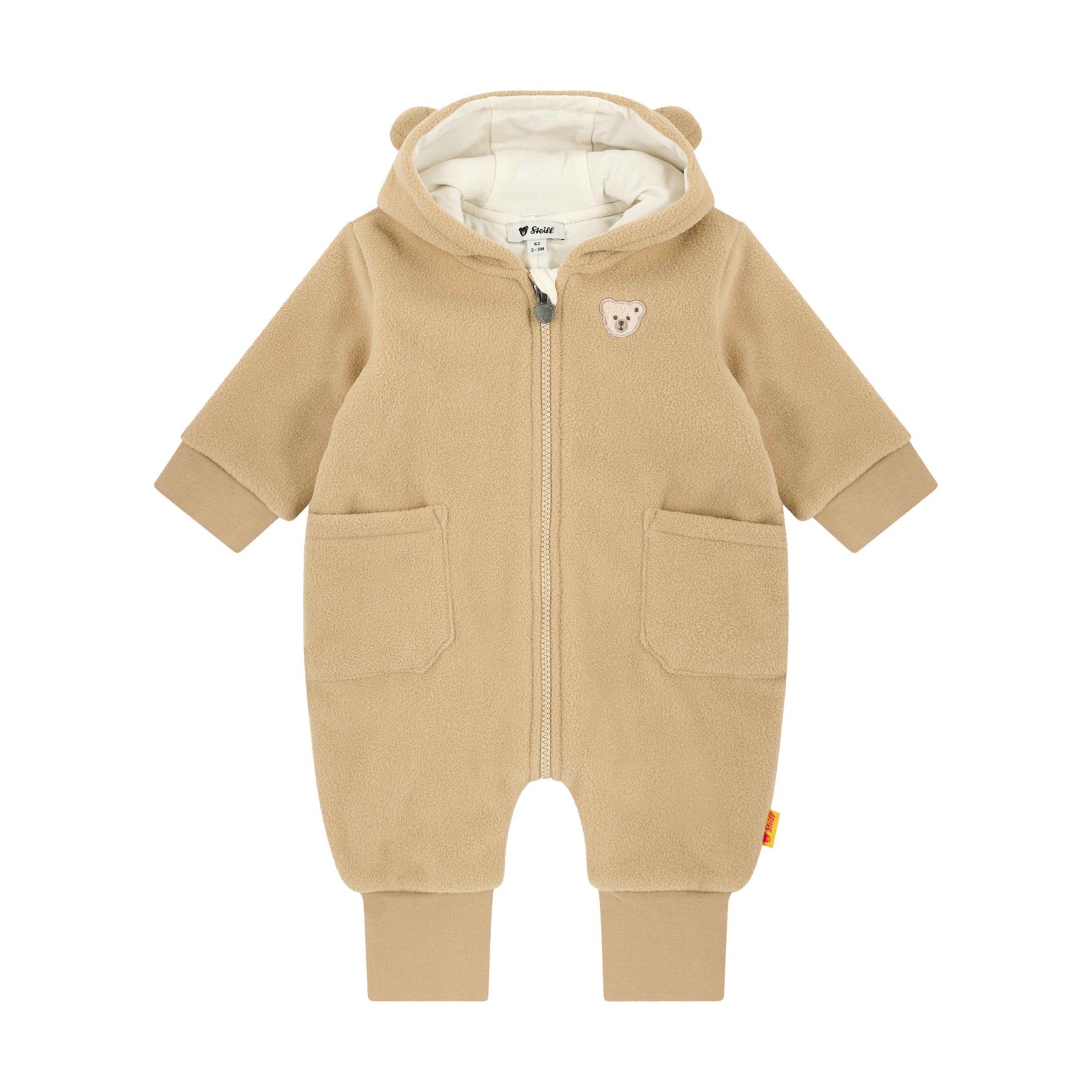 Für kuschelige Wohlfühlmomente im Alltag sorgt dieser Overall aus weichem, recyceltem Fleece. Der beige Einteiler punktet mit großzügiger Passform und gerippten Bündchen an Ärmeln und Beinen für optimalen Sitz. Zwei aufgesetzte Taschen bieten Platz für kleine Schätze. Die Kapuze mit niedlichen Bärenohren verleiht dem Look einen verspielten Akzent. Ein durchgehender Reißverschluss mit praktischem Kinnschutz erleichtert das An- und Ausziehen. Auf der Brust begleitet das klassische Steiff Teddybärmotiv alle Unternehmungen – ein treuer Freund für gemütliche Entdeckungstouren.