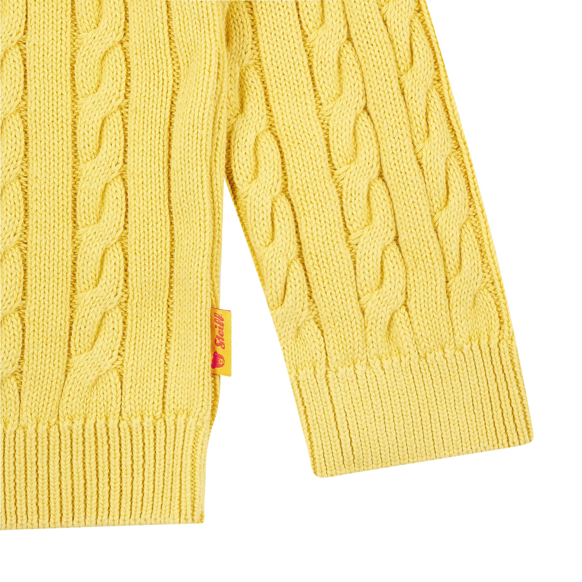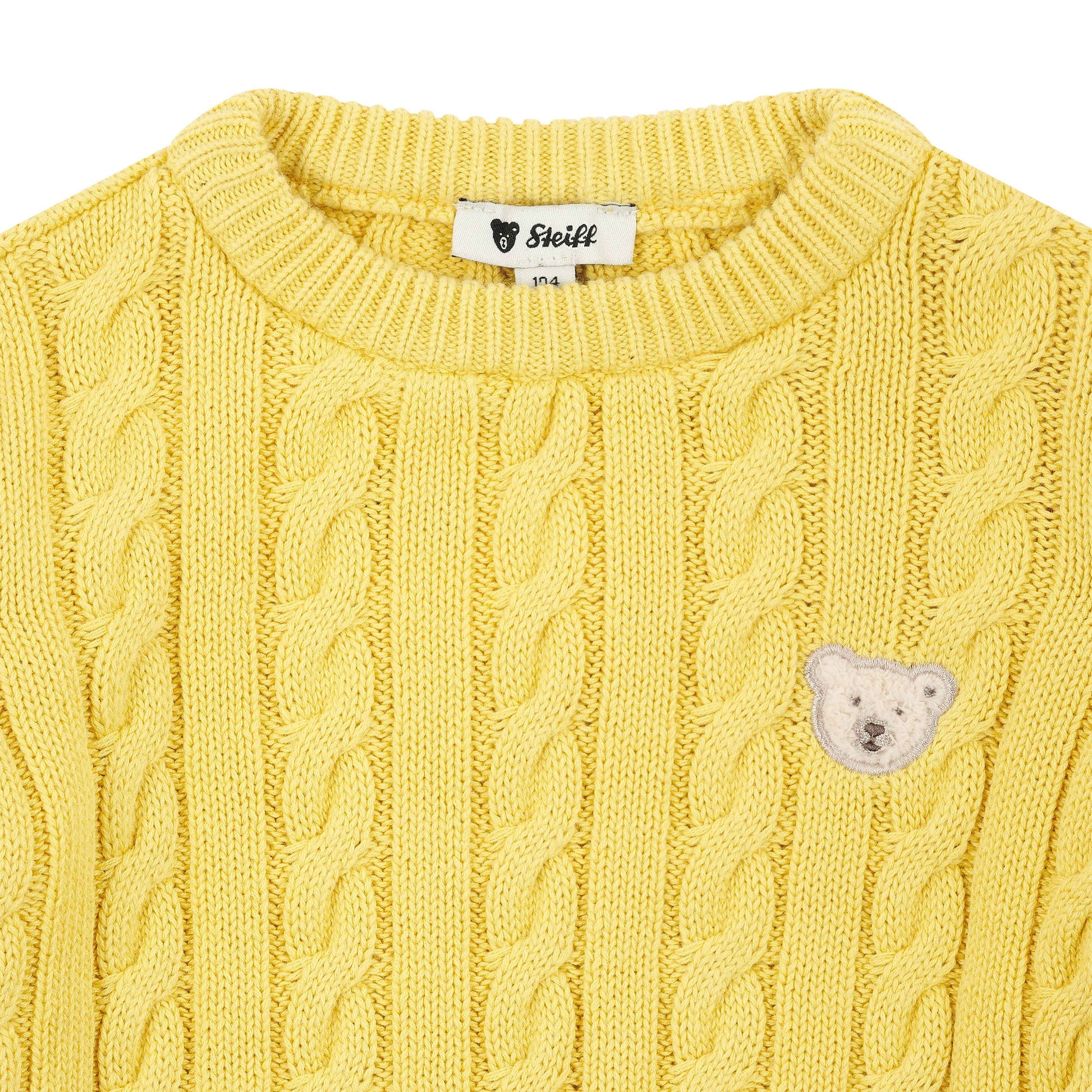 Stilbewusste Jungs sind mit diesem klassischen Rundhalspullover gemütlich und modisch unterwegs. Der weiche Baumwollstrick liegt angenehm auf der Haut, während der lockere Schnitt viel Bewegungsfreiheit beim Spielen bietet. Ein durchgehendes Zopfmuster verleiht dem Pullover eine hochwertige Struktur und sorgt für einen zeitlosen Look. Gerippte Abschlüsse an Kragen, Ärmeln und Saum schenken zusätzlichen Komfort. Auf der Brust rundet das klassische Steiff Teddybärmotiv das Design liebevoll ab – ein eleganter Alltagsbegleiter mit Wohlfühlgarantie.