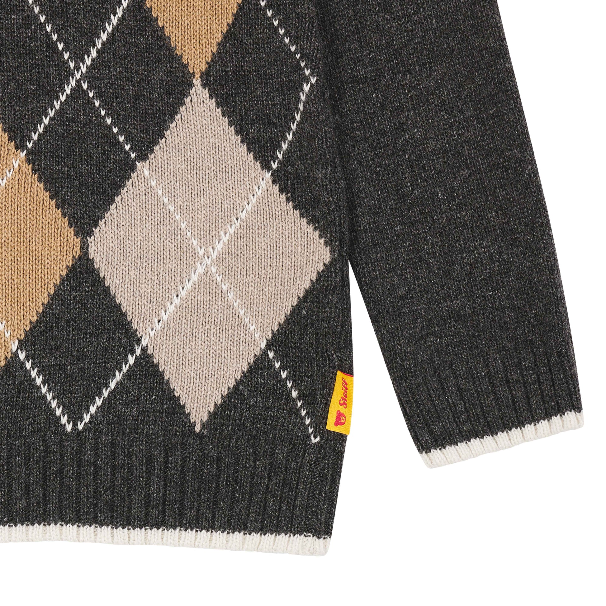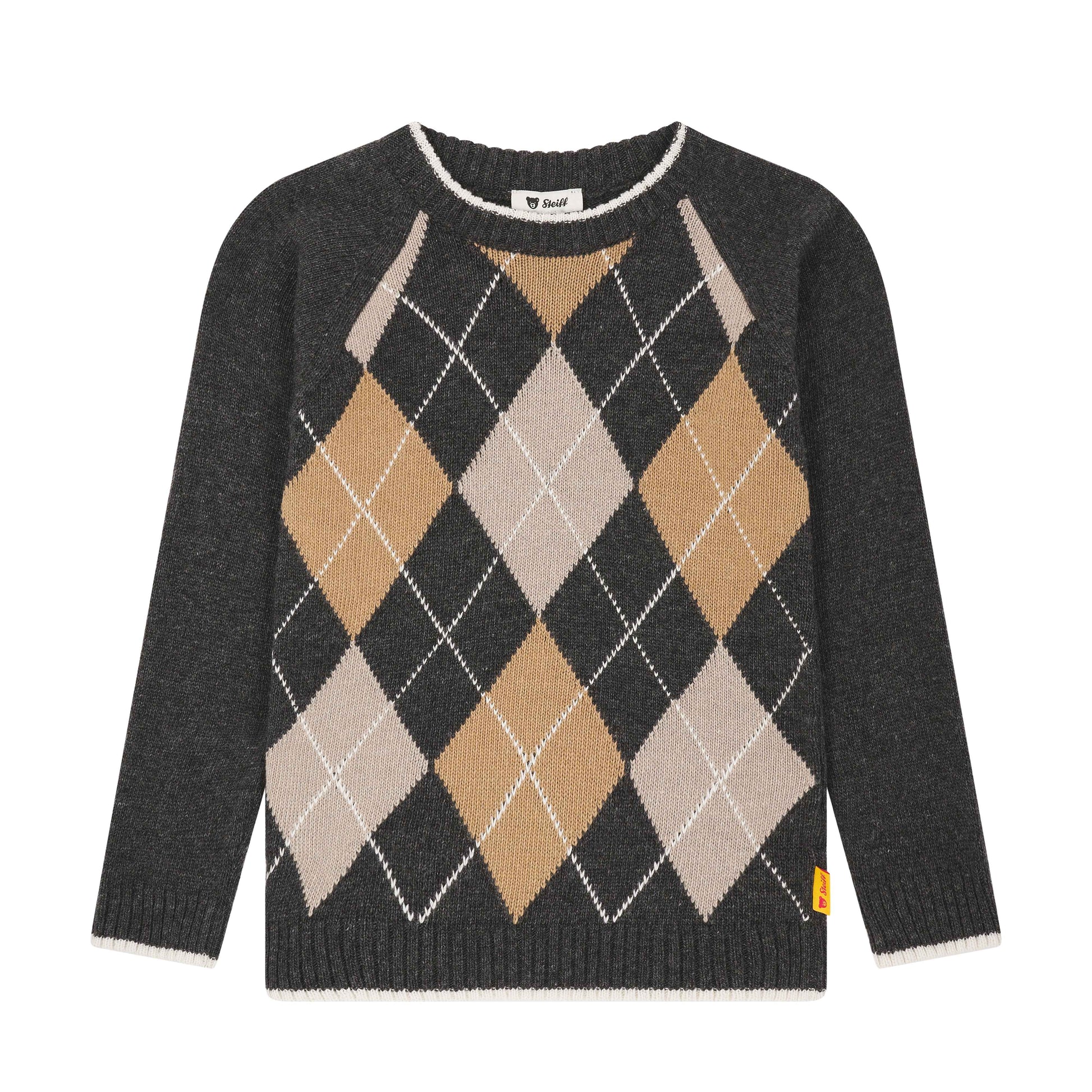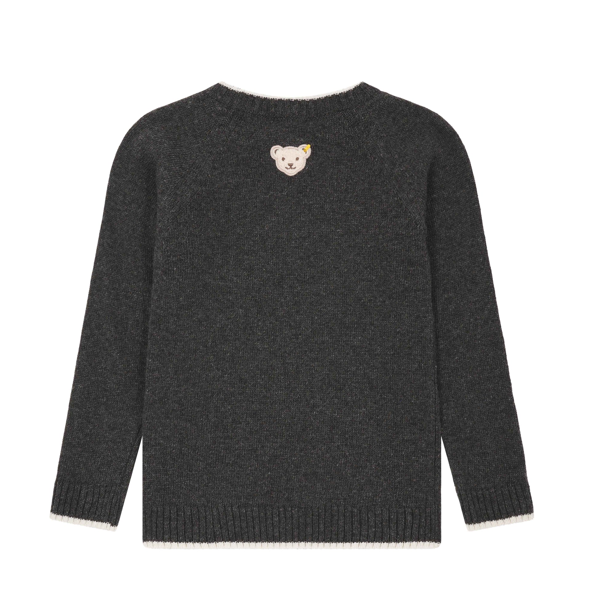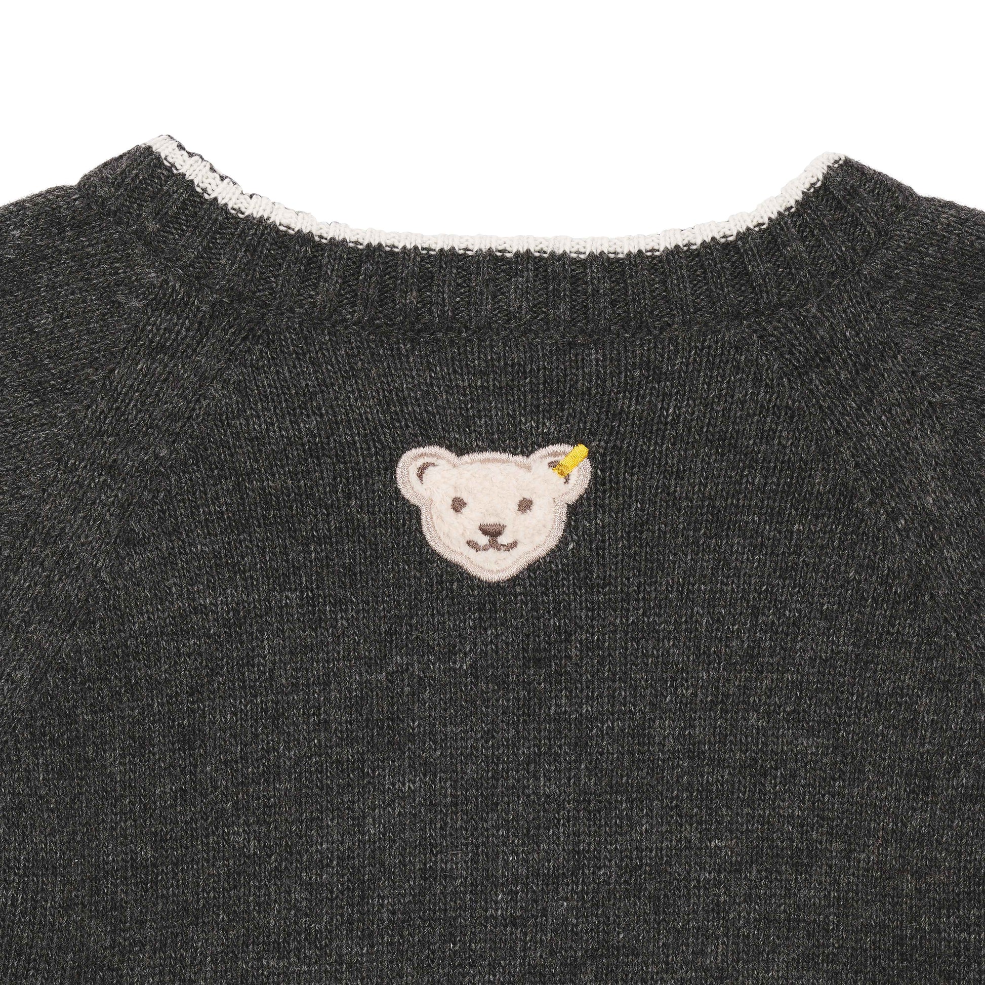 Dieser hübsche Pullover mit eingestricktem Rautenmotiv ist der perfekte Begleiter im Alltag. Die klassische Farbkombination ist vielfältig kombinierbar, weshalb das Oberteil zu allen Gelegenheiten getragen werden kann. Dank der hochwertigen Strickqualität ist ein angenehmes Tragegefühl garantiert. Die Bündchen am Saum und am Hals mit ihren Kontraststreifen sind nicht nur ein Hingucker, sie helfen auch wunderbar beim An- und Ausziehen. Das Steiff Teddybärmotiv auf dem Rücken darf natürlich nicht fehlen!