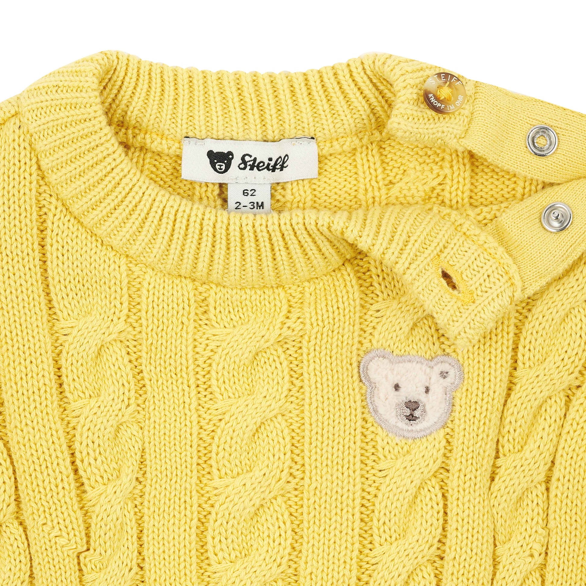 Kleine Charmeure genießen mit diesem Pullover aus weichem Baumwollstrick höchsten Tragekomfort. Das klassische Zopfmuster verleiht dem Design einen stilvollen Look, während gerippte Abschlüsse für eine gute Passform sorgen. Praktische Knöpfe an der Schulter erleichtern das An- und Ausziehen im Alltag. Das klassische Steiff Teddybärmotiv auf der linken Brust begleitet sicher durch den Tag – ein treuer Begleiter für gemütliche Momente und stilvolle Auftritte.