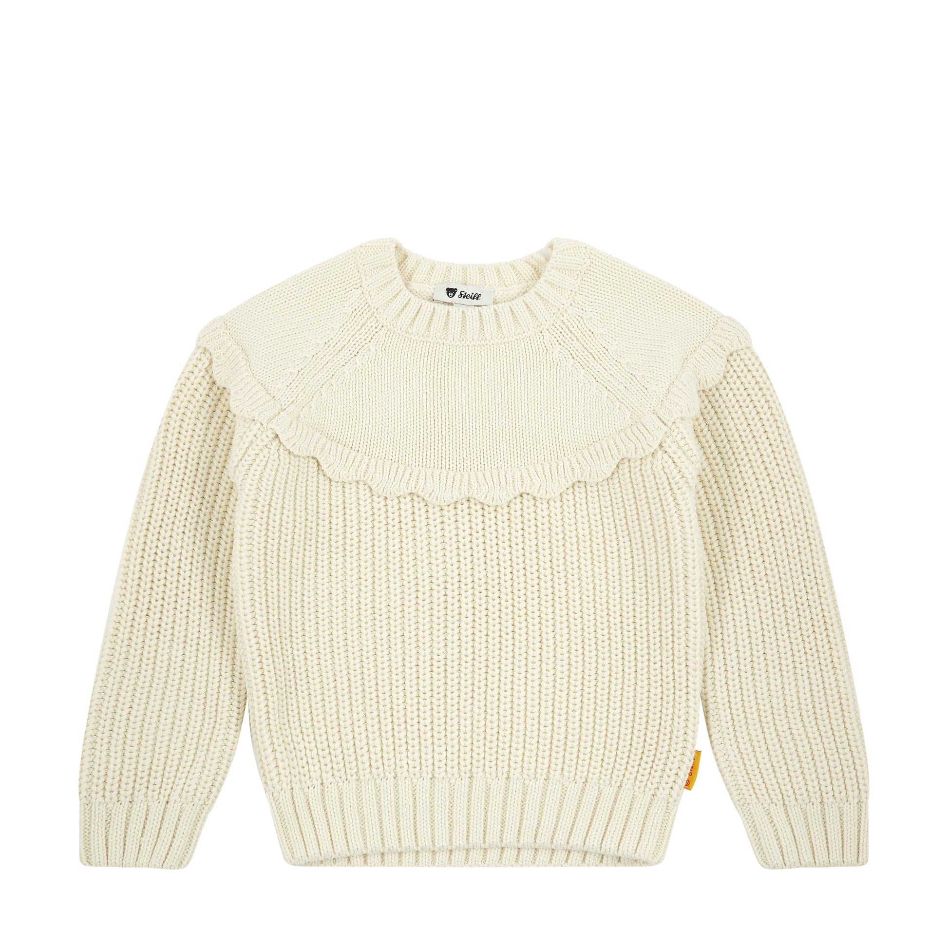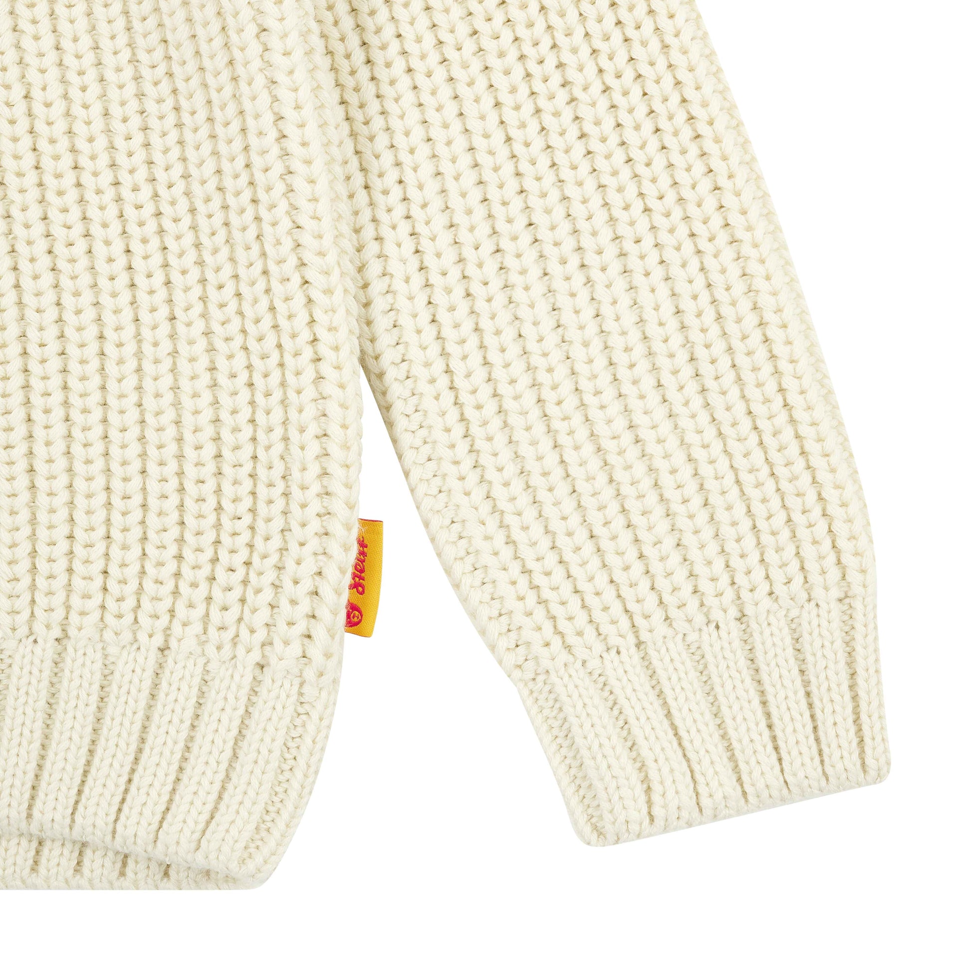 Mit seinem liebevollen Design und gemütlichem Komfort begeistert dieser Pullover kleine Romantikerinnen. Der weiche Baumwollstrick in zartem Beige sorgt für ein angenehmes Tragegefühl, während der gerade Schnitt mit Rundhalsausschnitt und gerippten Abschlüssen an Ärmeln und Saum perfekt sitzt. Das optische Highlight bildet das fein strukturierte Strickmuster im Brustbereich, das von einer dekorativen Zierborte eingefasst wird. Auf der Rückseite schenkt das klassische Steiff Teddybärmotiv ein Gefühl von Geborgenheit – ein stilvoller Lieblingsbegleiter für kühlere Tage.
