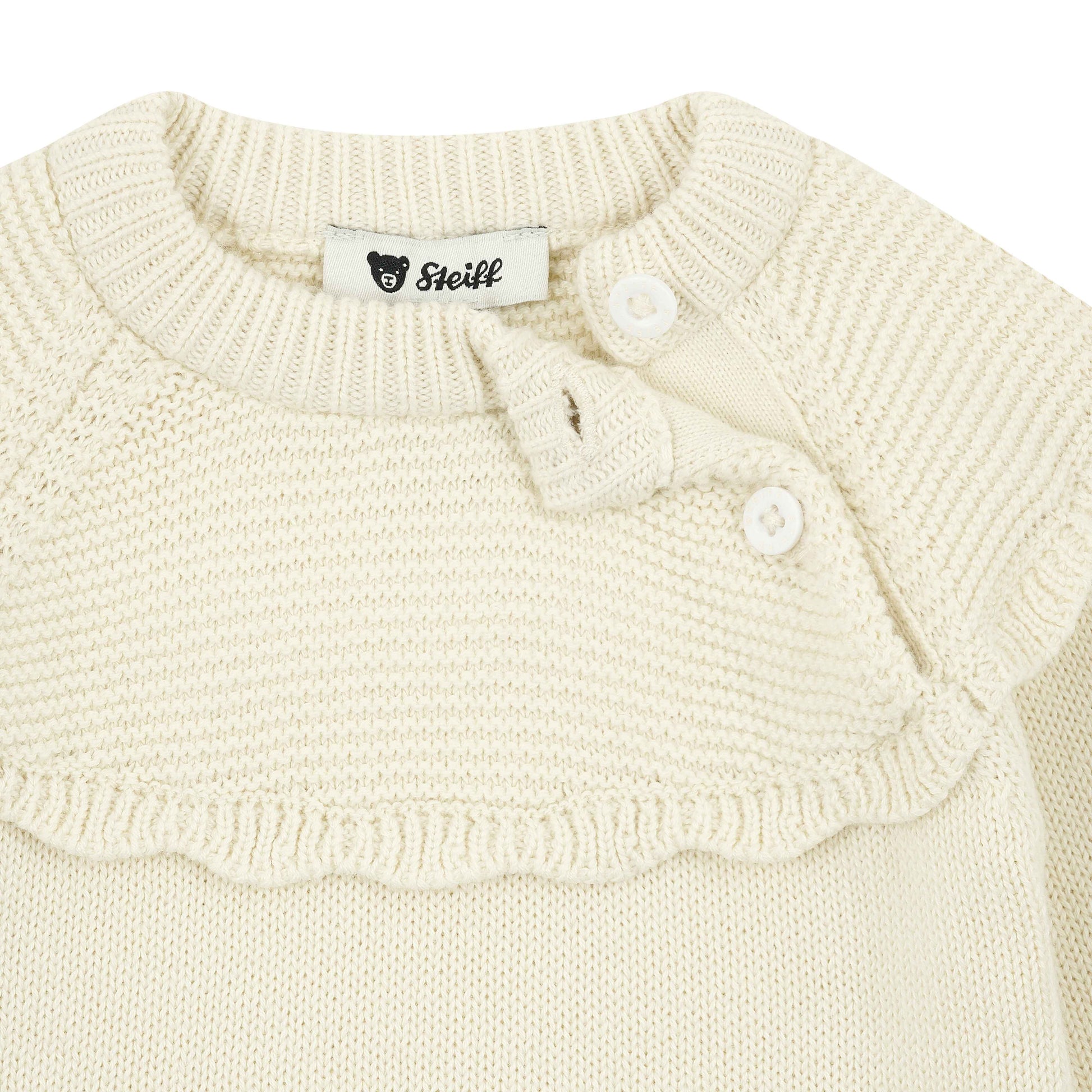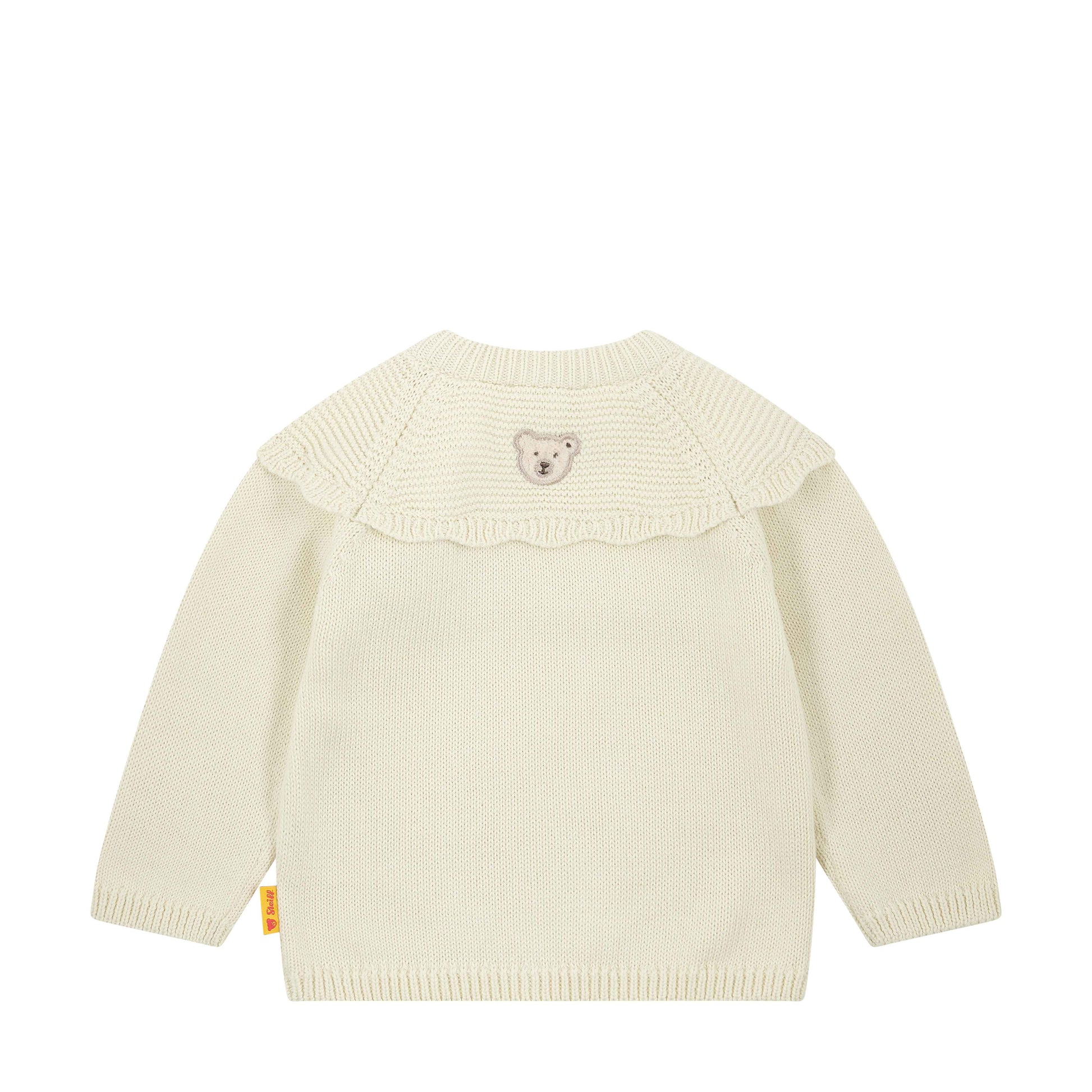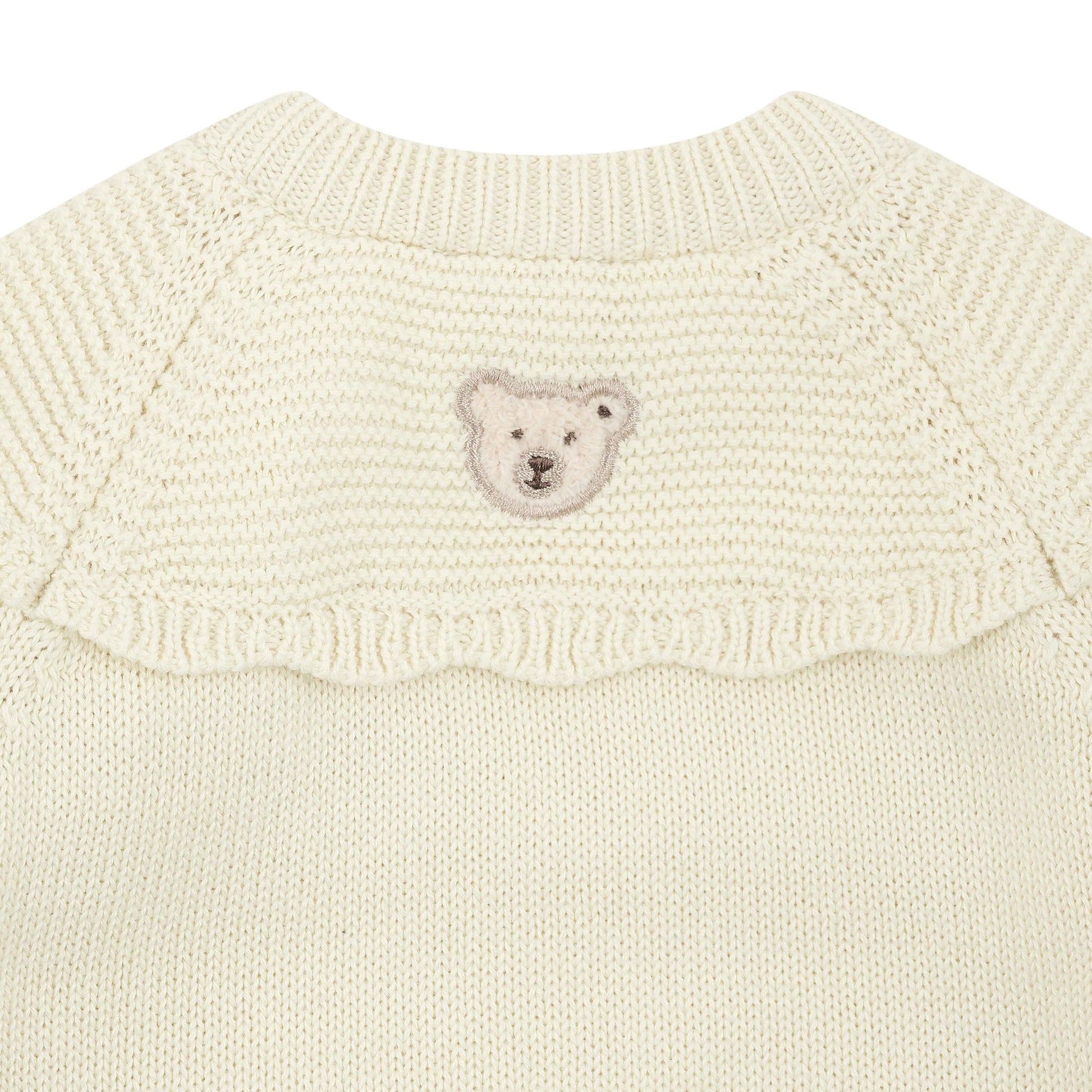 Mit seinem liebevollen Design und kuscheligem Komfort verzaubert dieser Pullover kleine Stilikonen. Der weiche Baumwollstrick in zartem Beige bietet ein angenehmes Tragegefühl, während der gerade Schnitt mit Rundhalsausschnitt und gerippten Abschlüssen für einen perfekten Sitz sorgt. Das Highlight ist das feine Strickmuster im Brust- und Schulterbereich, das mit einer zarten Wellenkante veredelt wird. Auf der Rückseite begleitet das klassische Steiff Teddybärmotiv jede Unternehmung mit einem Hauch Geborgenheit – ein charmantes Wohlfühlstück für stilvolle Alltagsmomente.
