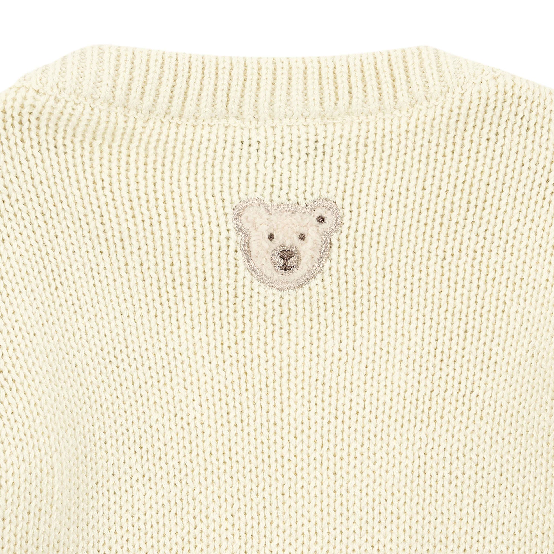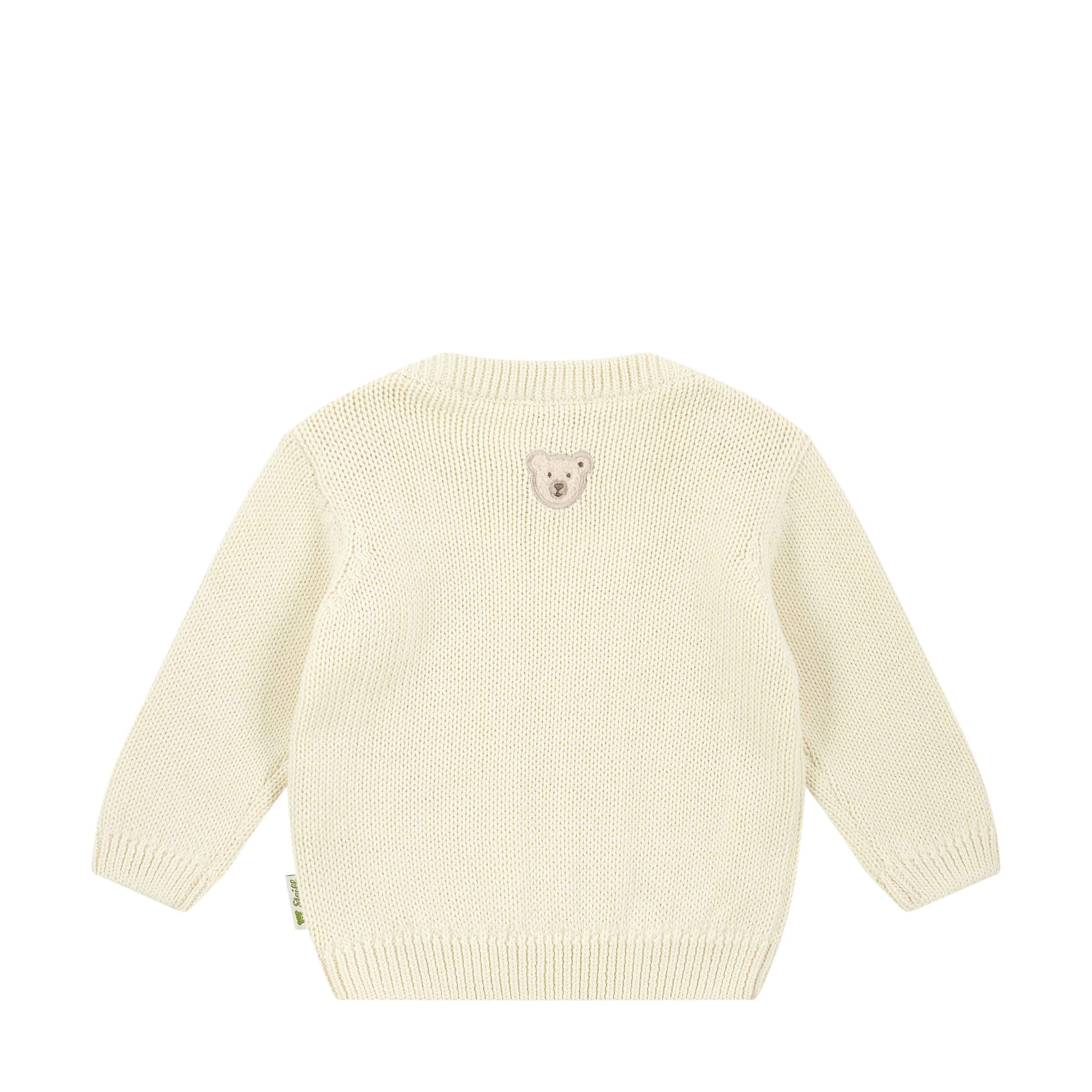Dieser gemütliche Pullover begeistert kleine Charmeure mit stilvollem Strickdesign und angenehmem Tragegefühl. Der weiche Baumwollstrick in warmem Beige zeigt sich auf der Vorderseite mit einem klassischen Zopfmuster. Der gerade Schnitt mit Rundhalsausschnitt und gerippten Abschlüssen an Ärmeln und Saum bietet dabei bequemen Sitz. Praktische Knöpfe an der Schulter erleichtern das An- und Ausziehen. Auf der Rückseite rundet das liebevolle Steiff Teddybärmotiv das Design mit einem Hauch Geborgenheit ab – ein kuscheliger Alltagsbegleiter für stilbewusste Weltentdecker.