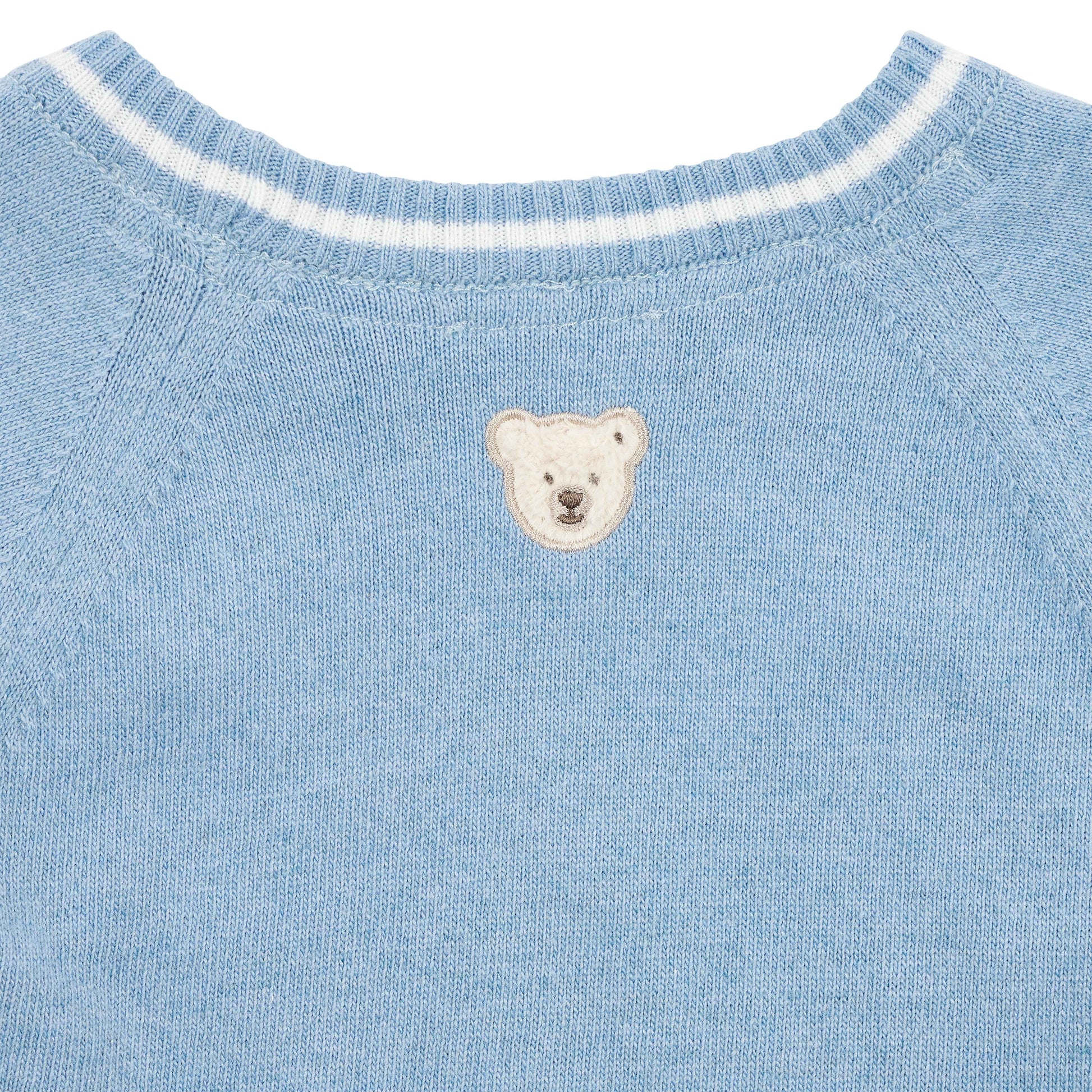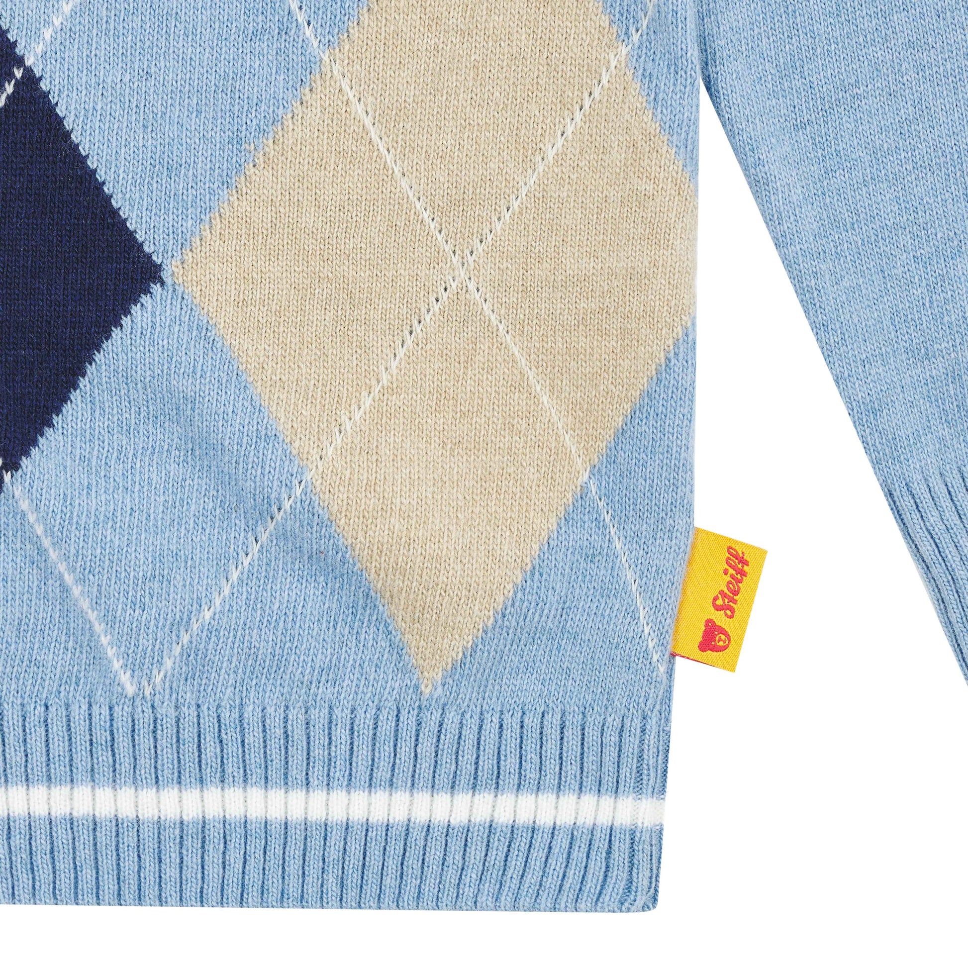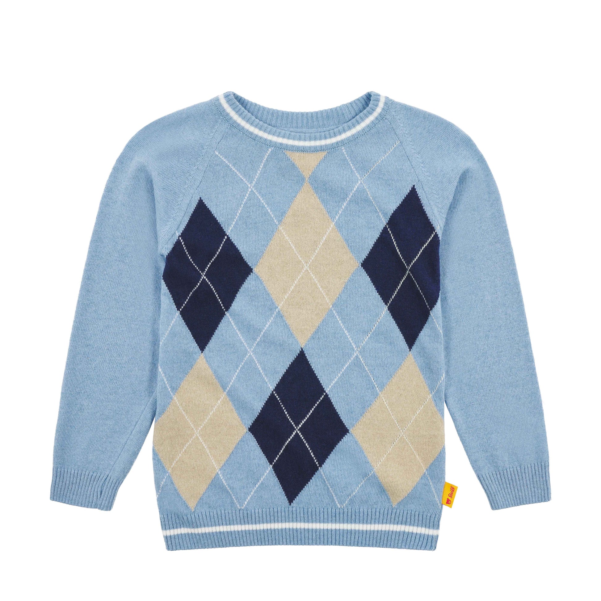 Dieser hellblaue Strickpullover ist ein gemütlicher Begleiter für kleine Weltentdecker. Der weiche Strickstoff bietet ein herrliches Tragegefühl, und das kontrastfarbige Rautenmuster auf der Vorderseite verleiht einen besonderen Stil. Rippbündchen am Halsausschnitt, Saum und den Ärmeln sorgen für bequemen Sitz und einfaches Hineinschlüpfen. Ein flauschiges Steiff Teddybärmotiv macht das Design komplett.