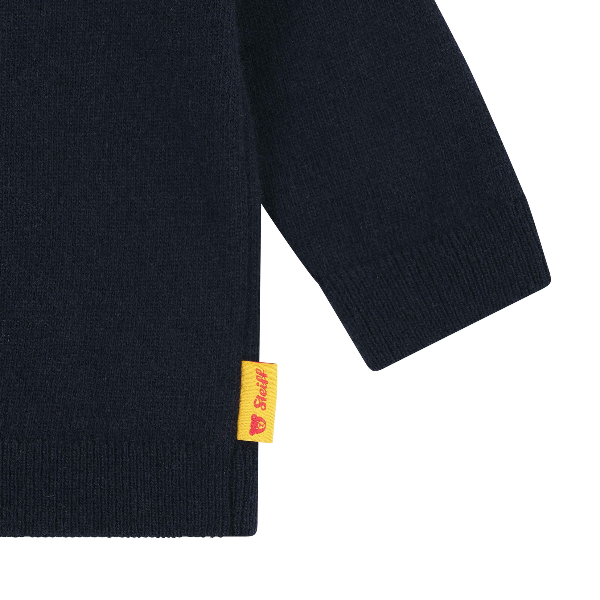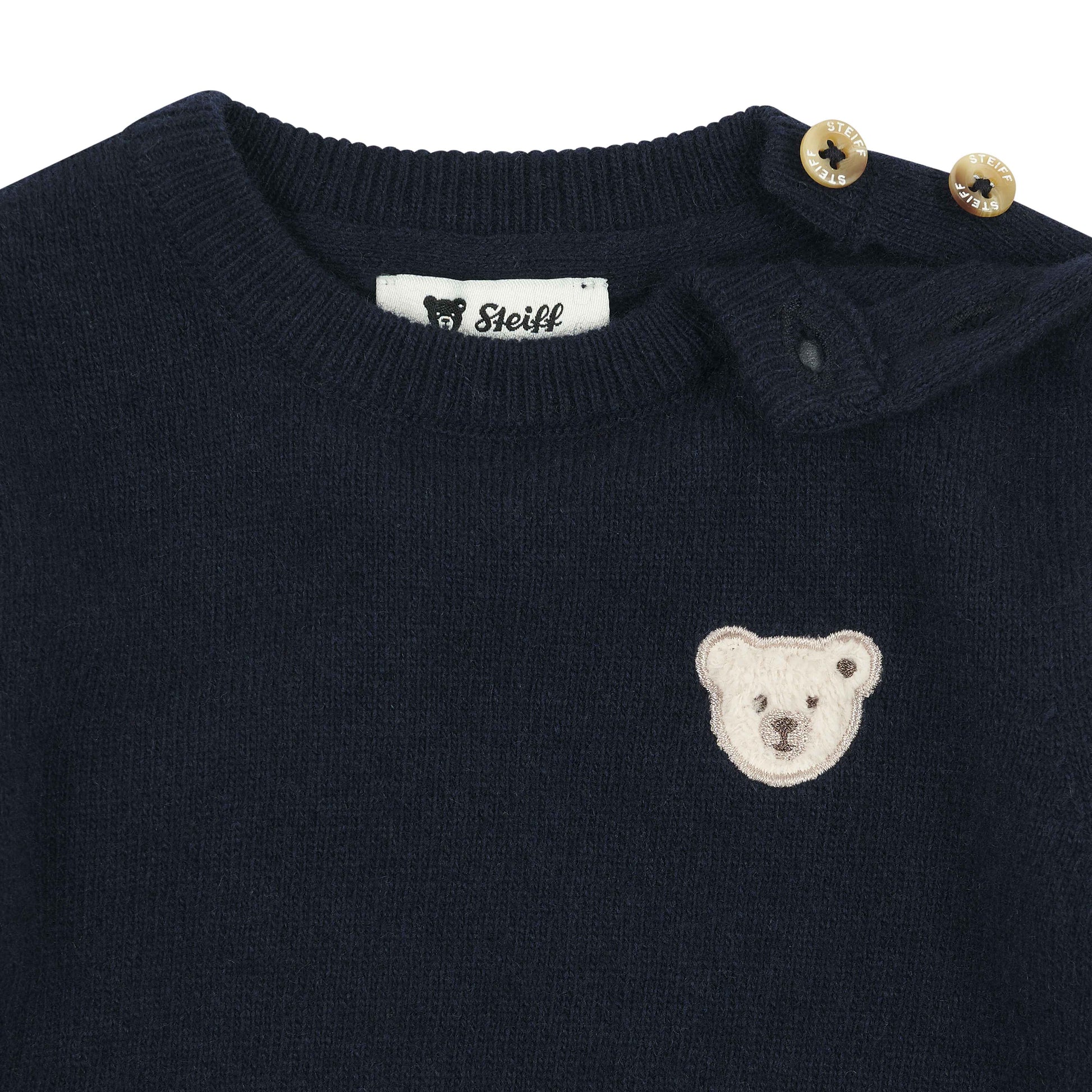 Kuschelig weich und schlicht im Design – dieser Pullover aus einem hochwertigen Baumwoll-Mix ist der perfekte Begleiter für stilvolle kleine Charmeure. In klassischem Beige gehalten, überzeugt er mit feiner Strickstruktur, gerippten Abschlüssen und einem komfortablen Rundhalsausschnitt. Praktische Druckknöpfe an der Schulter erleichtern das An- und Ausziehen. Das liebevoll auf der Brust platzierte Steiff Teddybärmotiv rundet den Look charmant ab. Ein stilvoller Klassiker für jeden Tag.