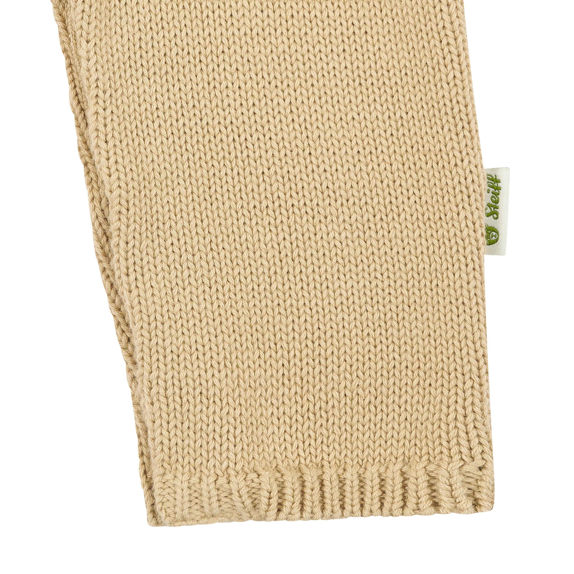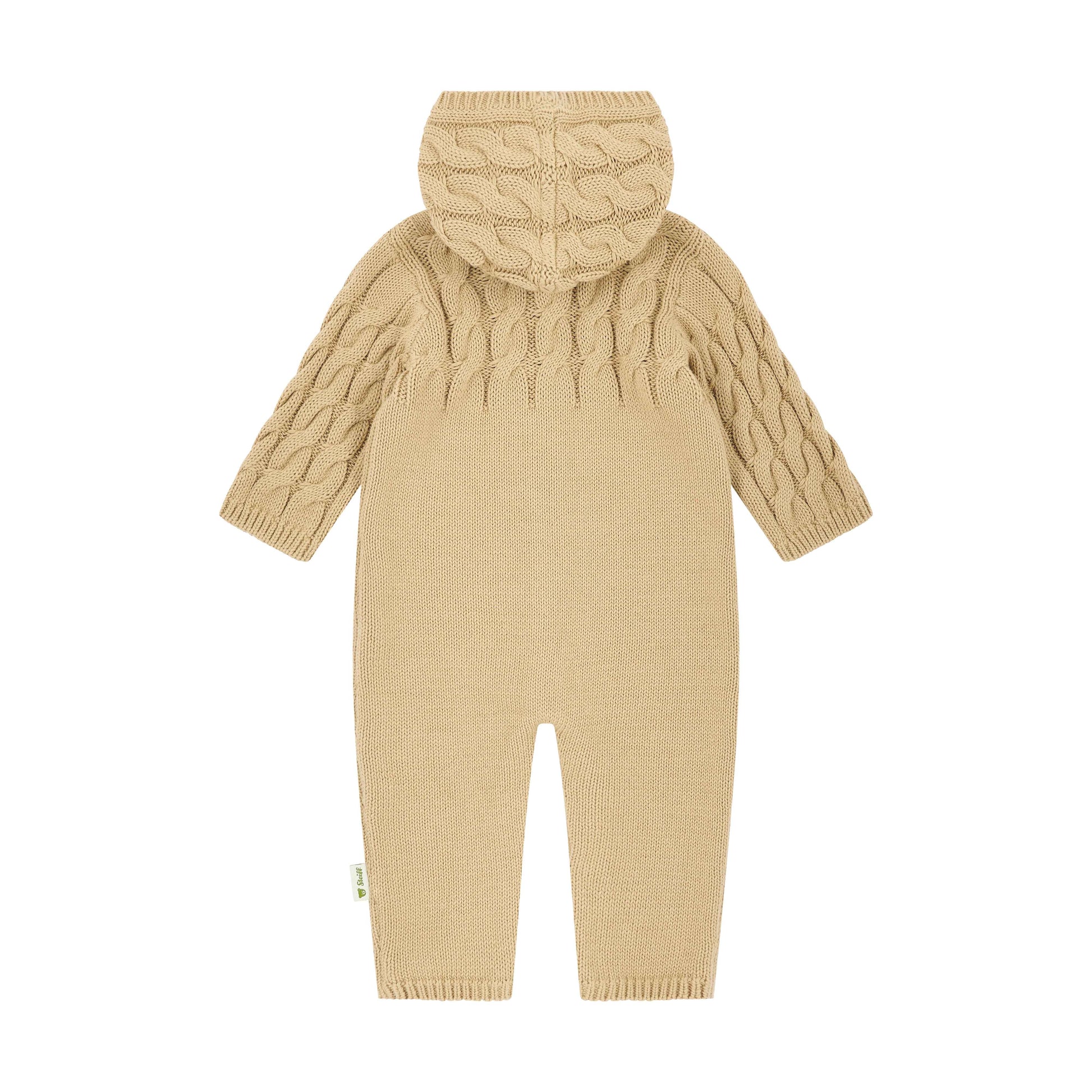 Dieser beigefarbene Strampler aus weichem Baumwollstrick bietet kleinen Abenteurerinnen und Abenteurern rundum Wohlgefühl. Mit feinem Zopfmuster und gerippten Abschlüssen gearbeitet, schenkt er angenehme Wärme und eine besonders gemütliche Passform. Die Kapuze sorgt für zusätzlichen Schutz an kühleren Tagen. Eine Knopfleiste auf der Vorderseite und praktische Druckknöpfe im Windelbereich erleichtern das An- und Ausziehen. Auf der Brust rundet das klassische Steiff Teddybärmotiv das Design liebevoll ab – ein treuer Begleiter von Anfang an.