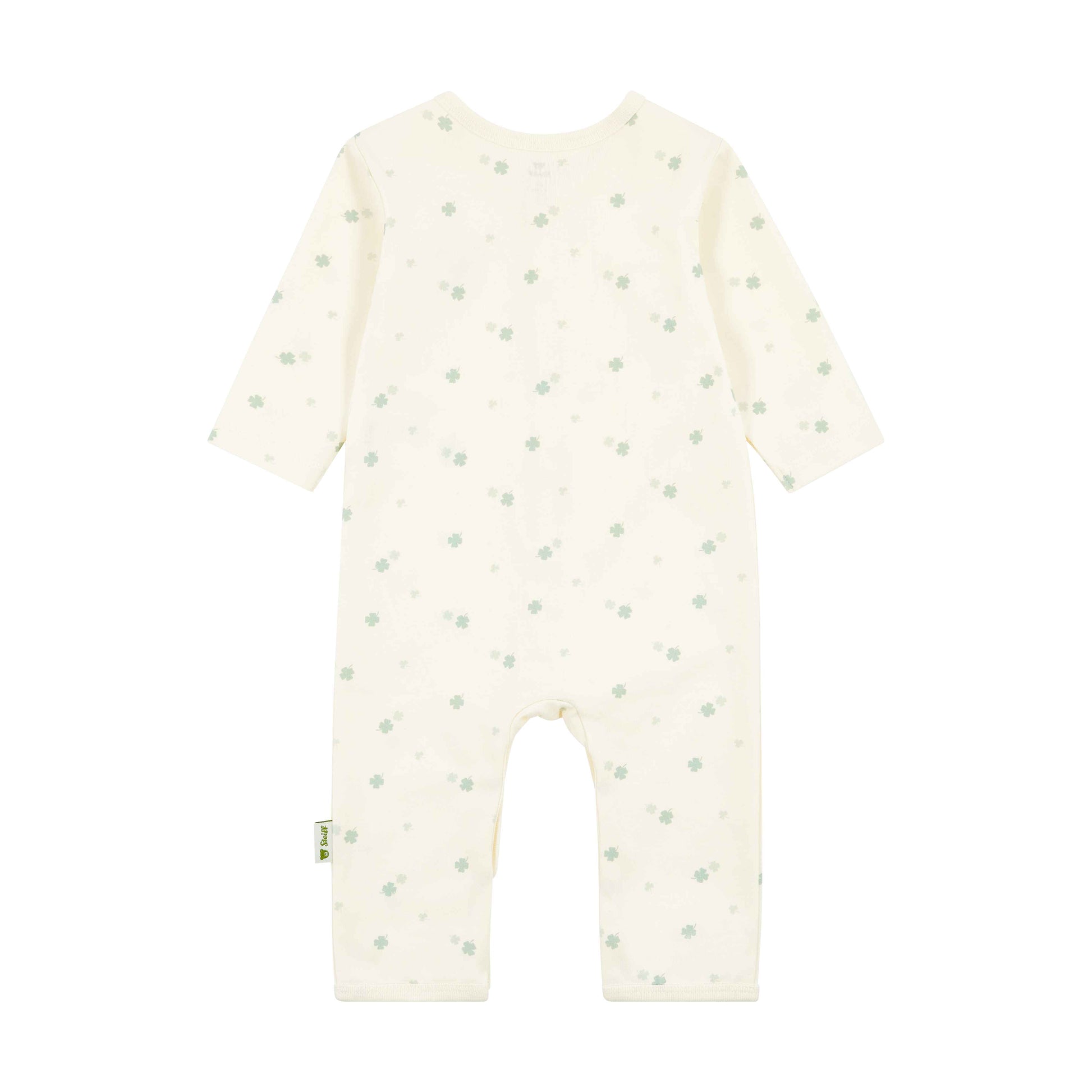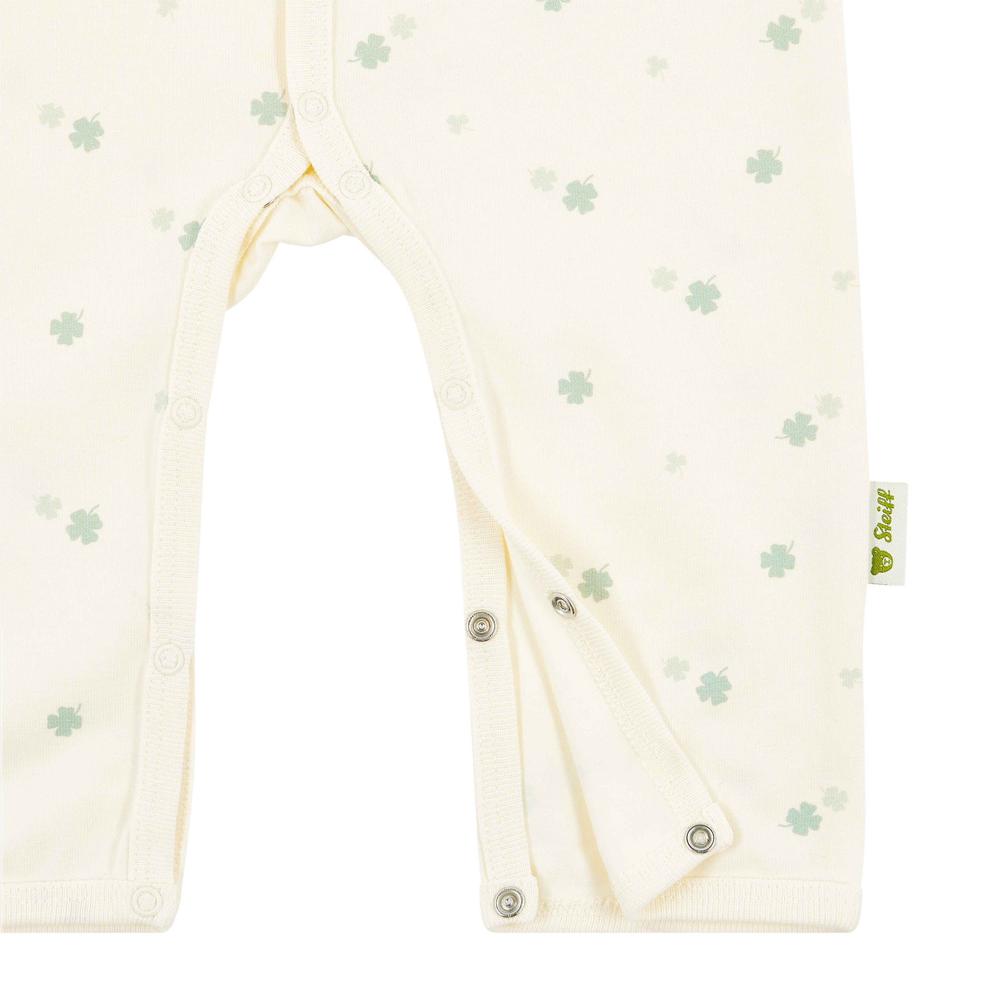 Der durchgehende Druckknopfverschluss vorne sowie im Schritt erleichtert das An- und Ausziehen und macht das Wickeln besonders unkompliziert. Ein dezenter Allover-Print mit kleinen Kleeblättern verleiht dem Design eine fröhliche, ruhige Note. Auf der Brust sorgt das klassische Steiff Teddybärmotiv für einen liebevollen Akzent mit Wiedererkennungswert 🐻🍀