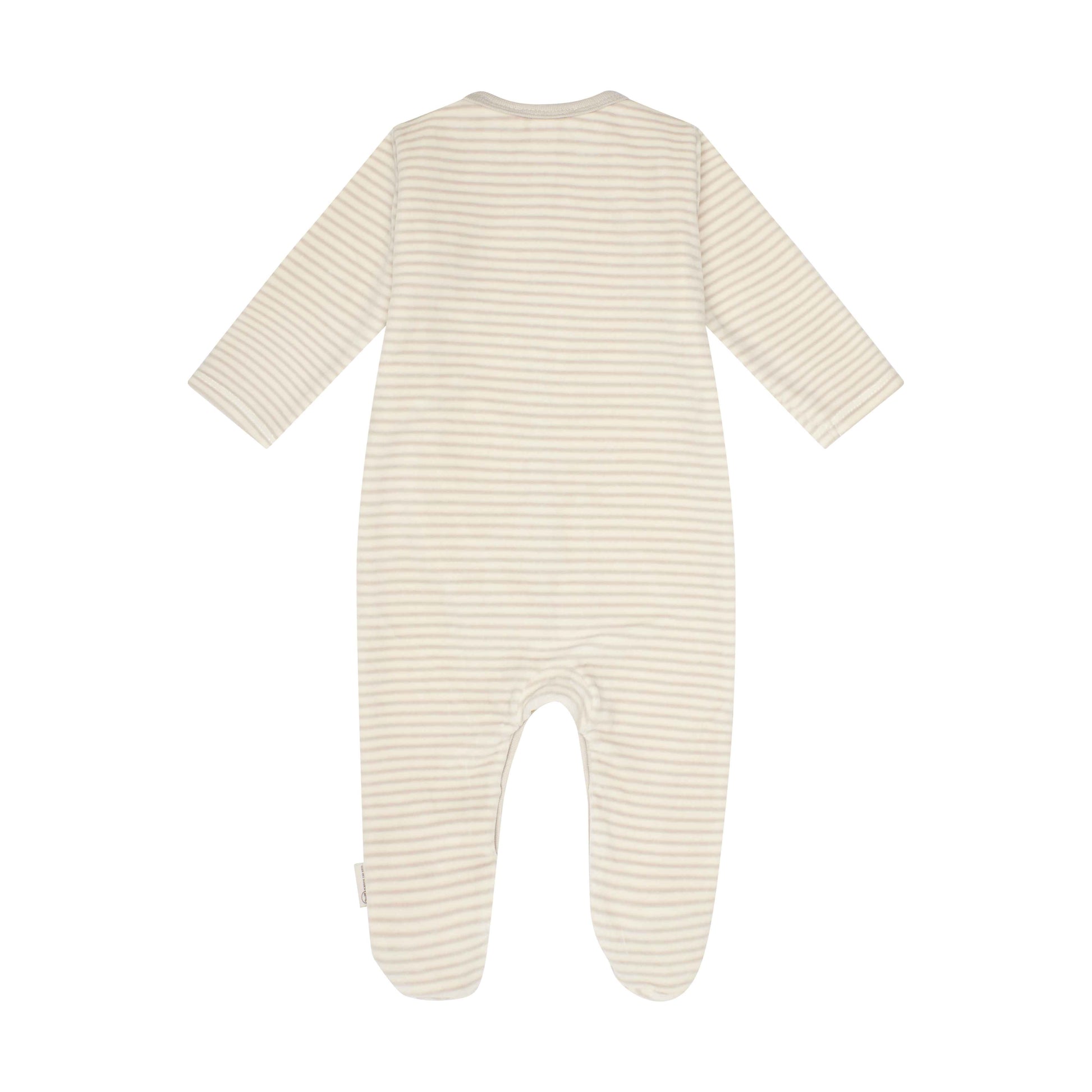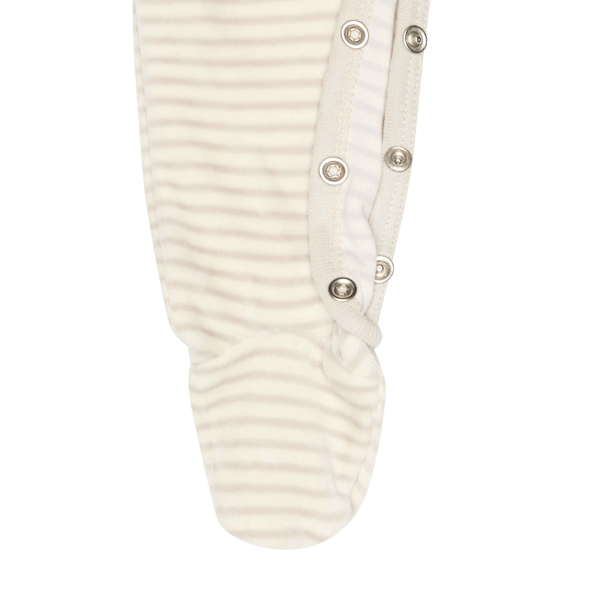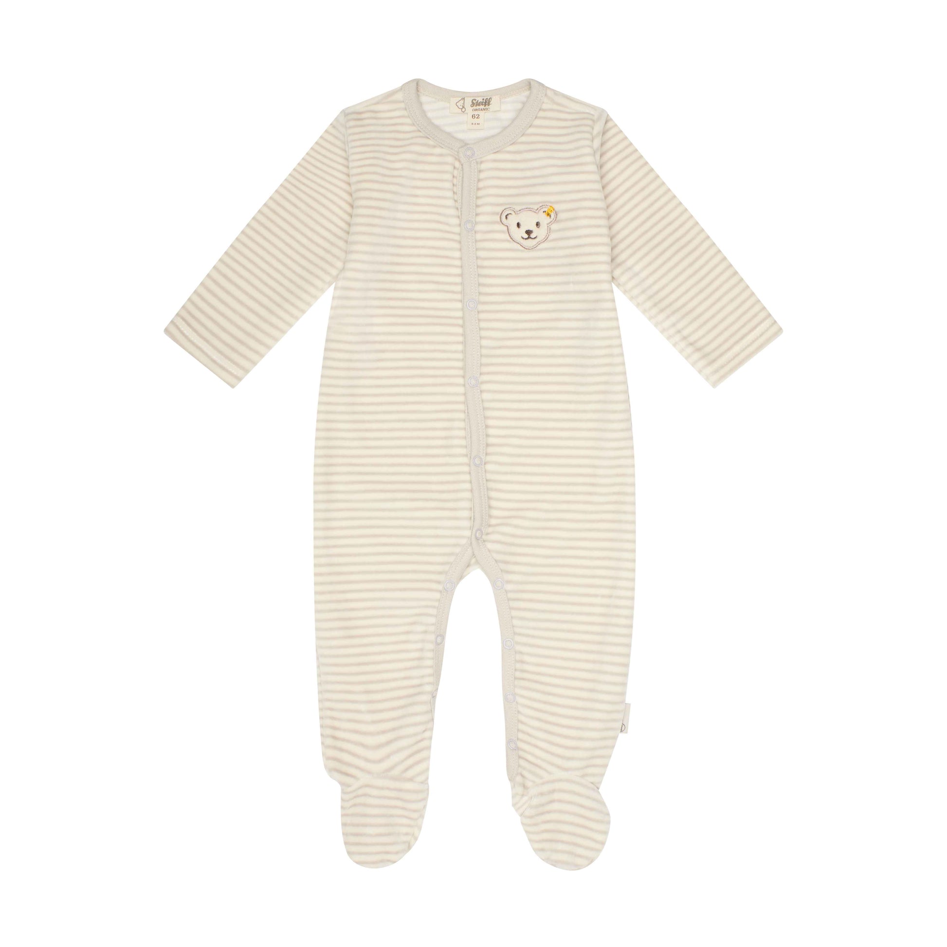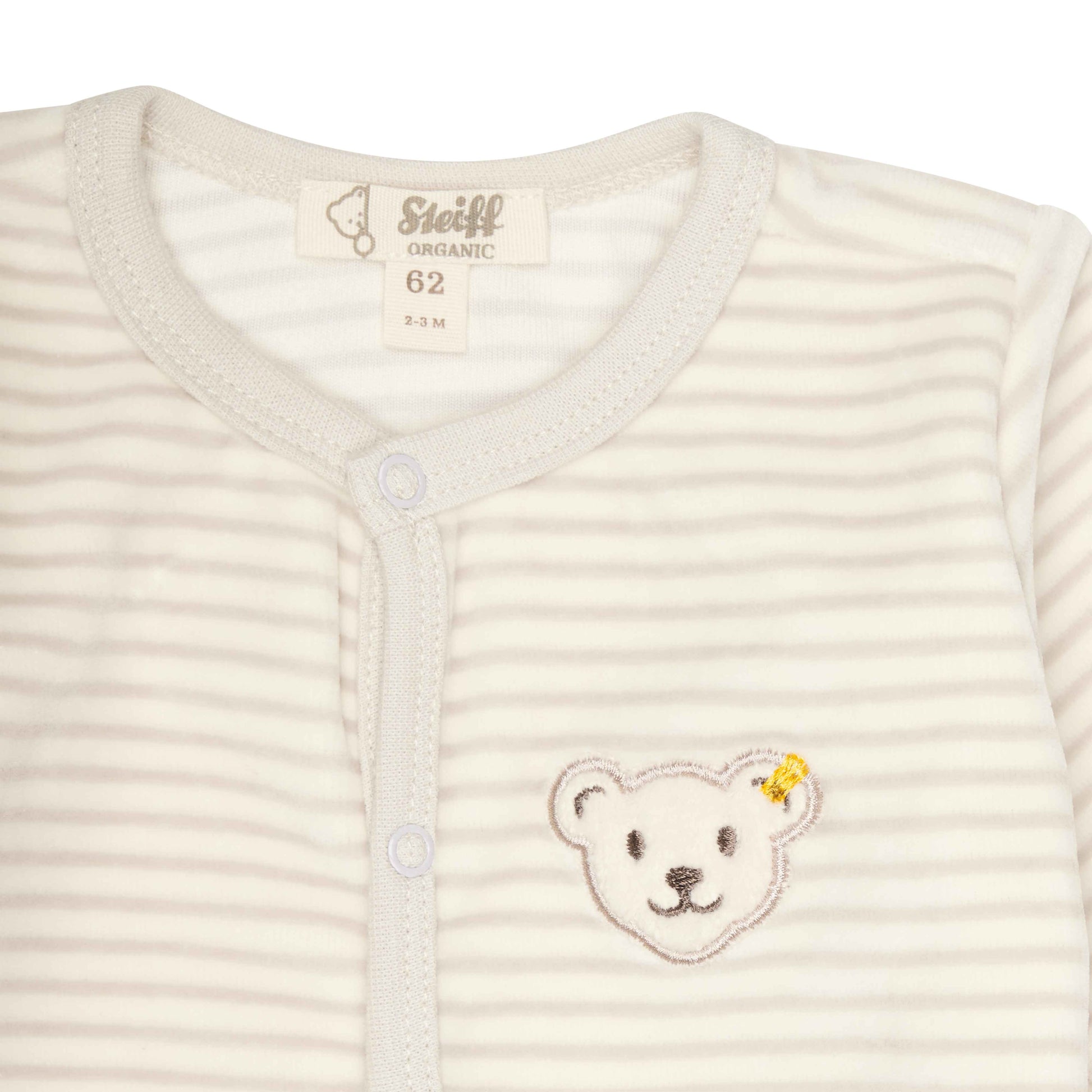 Gemütlich und aus samtigem Organic Velour gehört der Strampler zur Grundausstattung für unbeschwertes Weltentdecken. Die großzügige Passform bietet aktiven Kindern viel Bewegungsfreiheit beim Spielen und Entspannen. In dem Einteiler lässt es sich auch einfach zwischendurch einschlafen. Zarte Druckknöpfchen vorn sowie an beiden Beinen bis zu den wärmenden Füßchen machen das Anziehen und Wickeln unkompliziert. Streifen in einem warmen Ecruton sorgen für Tragespaß. Ein flauschiges Steiff Teddybärmotiv begleitet Ihr Kleines durch den Tag. Der Strampler ist aus Bio-Baumwolle gefertigt.