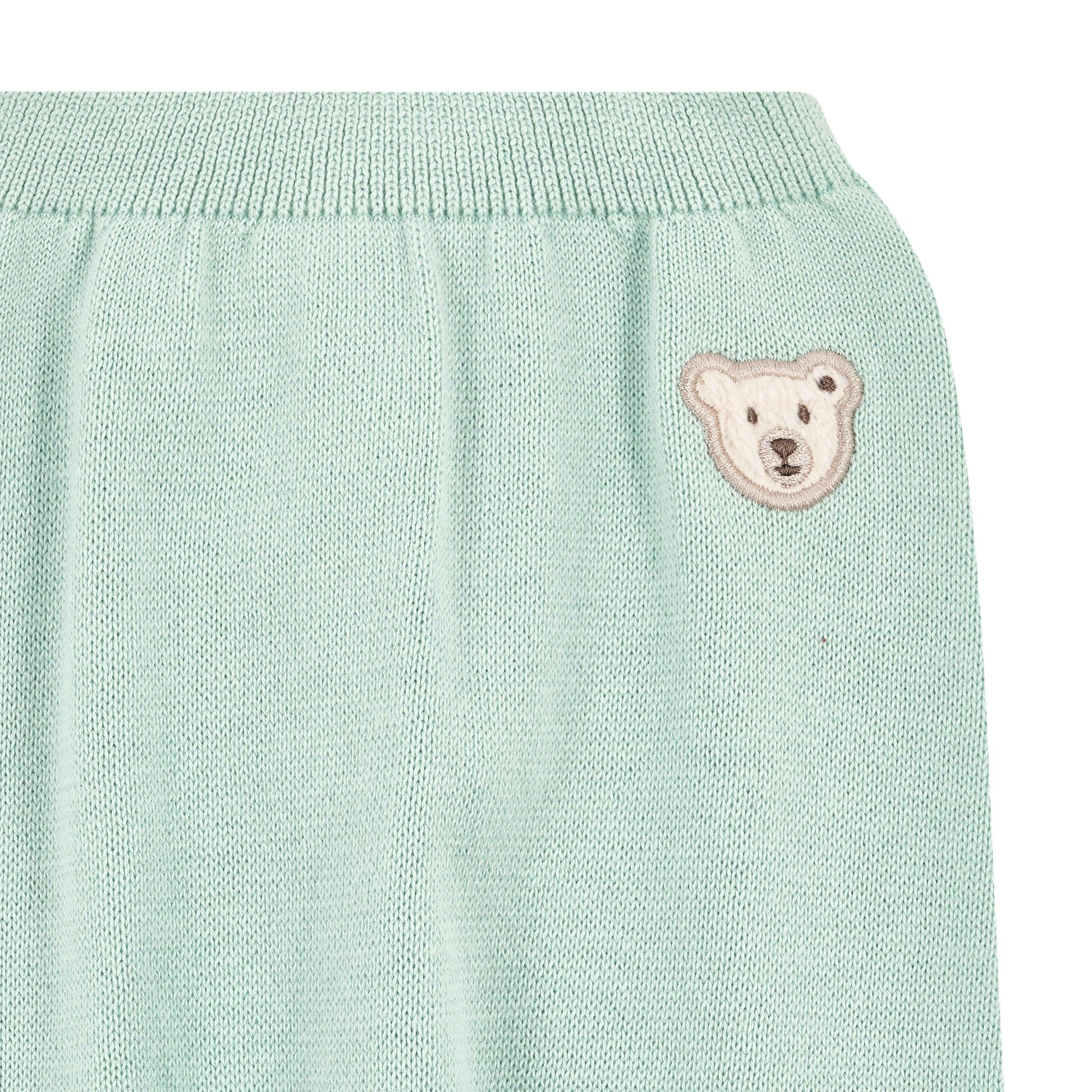 Das feine Strickmuster verleiht der Hose eine besonders charmante, zeitlose Optik. Auf Hüfthöhe setzt das klassische Teddybärmotiv von Steiff einen liebevollen Akzent und steht für die hochwertige Verarbeitung und den vertrauten Steiff-Charme 🐻✨
