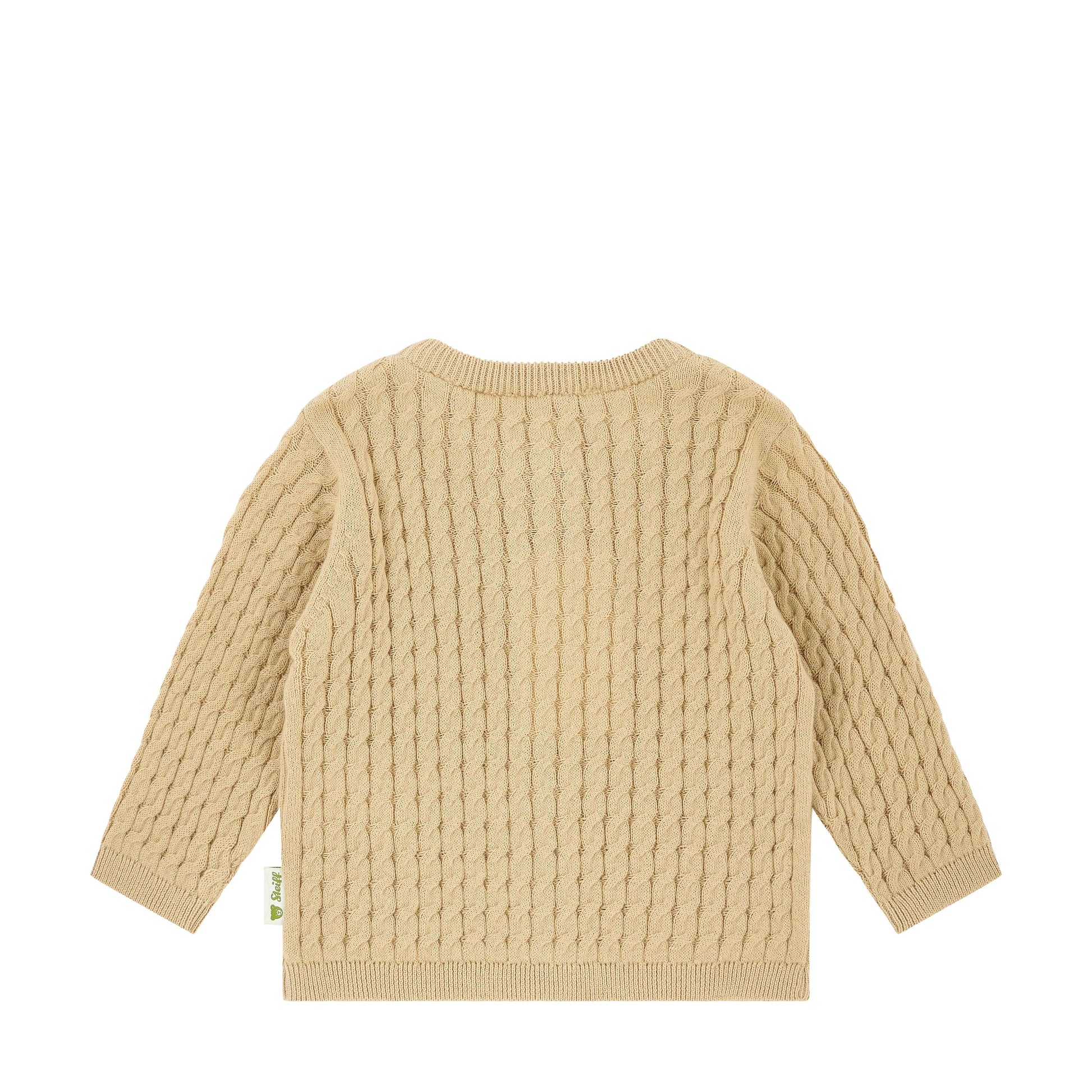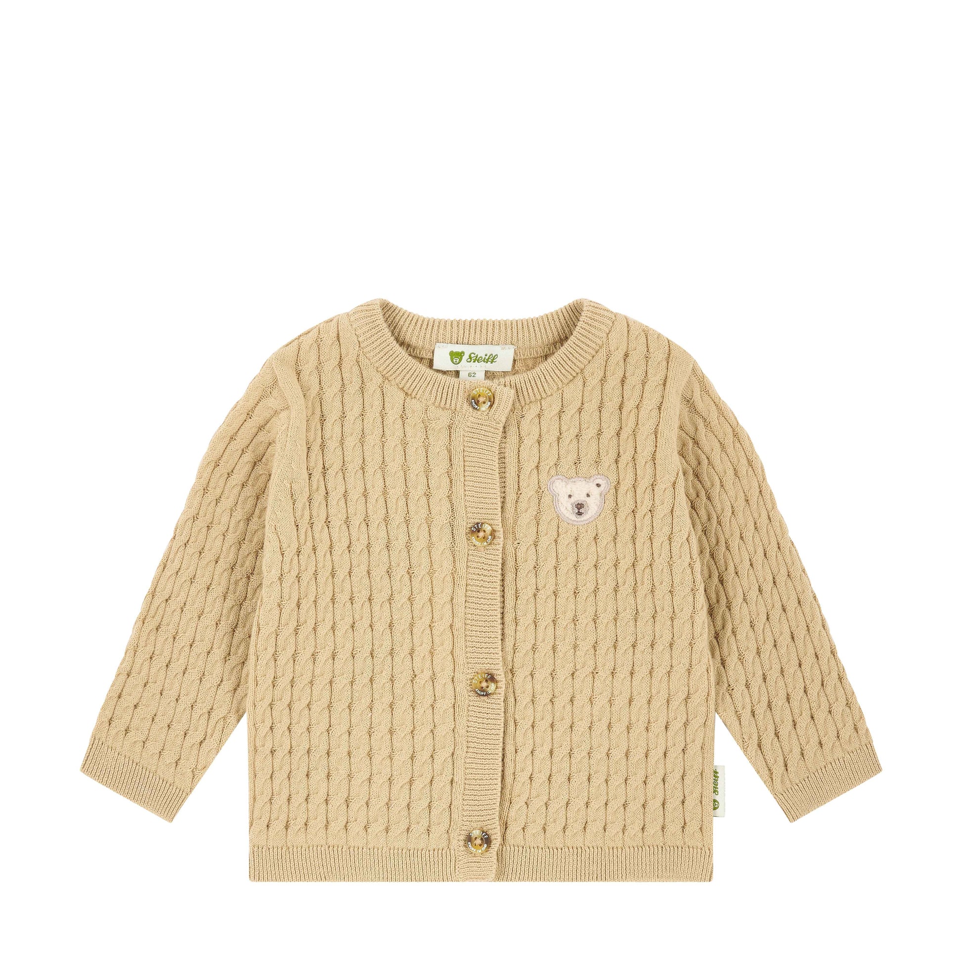 Die weiche Strickjacke aus Bio-Baumwolle ist ein zuverlässiger Begleiter für kuschelige Tage. Mit ihrer klassischen Zopfmusterstruktur bringt sie einen charmanten Look in die Garderobe kleiner Abenteurerinnen und Abenteurer. Der Rundhalsausschnitt sowie die Ärmelabschlüsse sind fein gerippt und sorgen für angenehmen Sitz. Die durchgehende Knopfleiste erleichtert das An- und Ausziehen im Alltag. Auf der Brust rundet das liebevoll platzierte Steiff Teddybärmotiv das Design stilvoll ab – ein treuer Begleiter für jeden Tag.