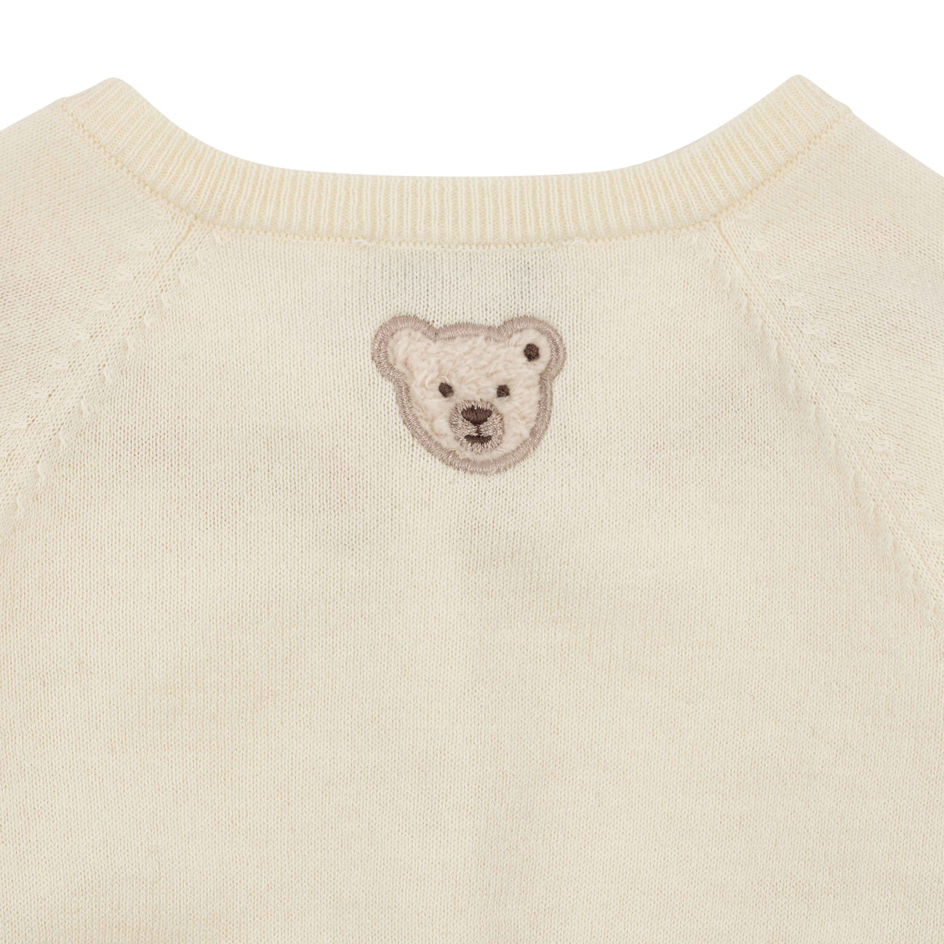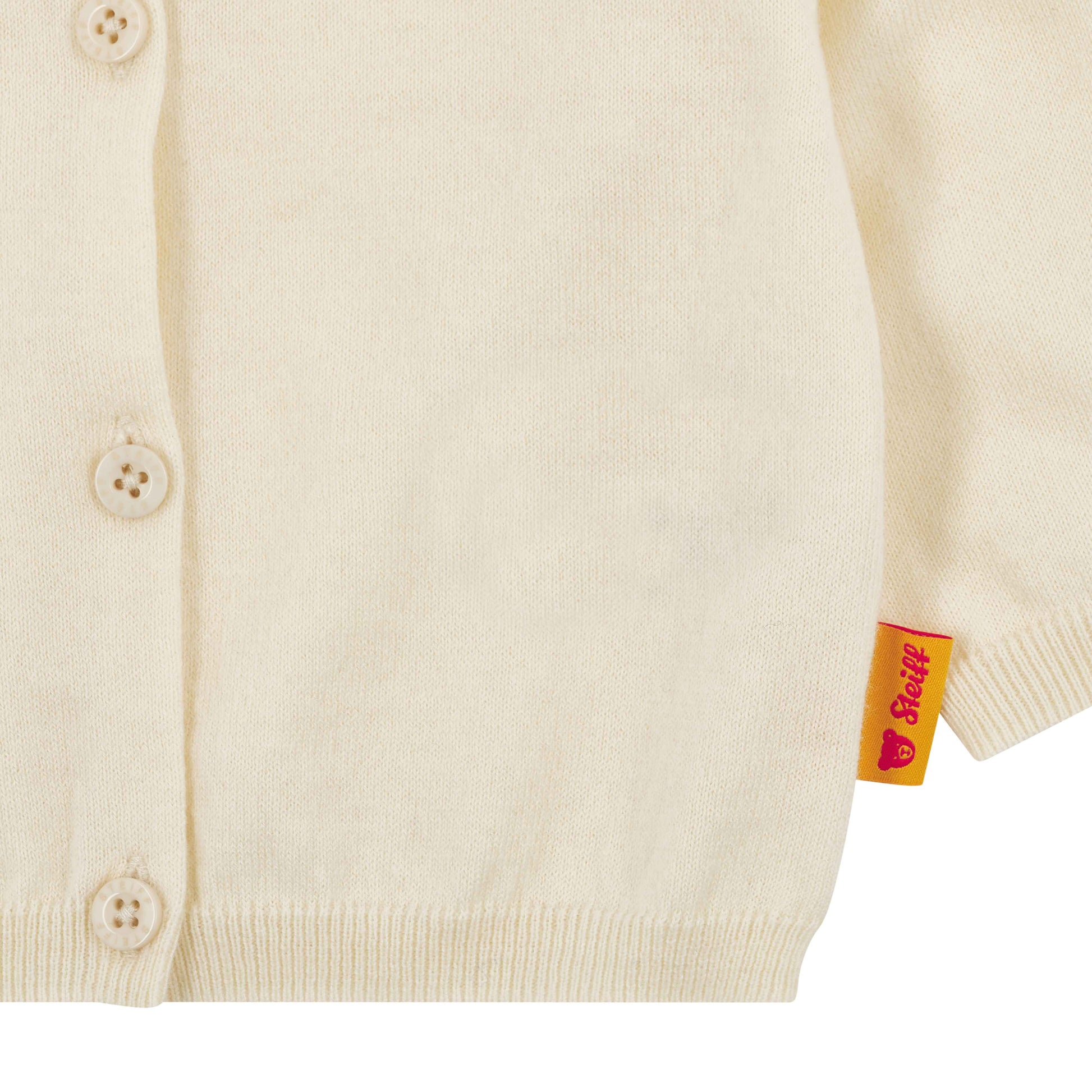 In sanftem Beige begleitet diese zauberhafte Strickjacke von Steiff kleine Weltentdeckerinnen stilvoll durch besondere Momente. Das hochwertige Baumwoll-Kaschmir-Garn fühlt sich wunderbar weich an und schmiegt sich angenehm an empfindliche Babyhaut an.