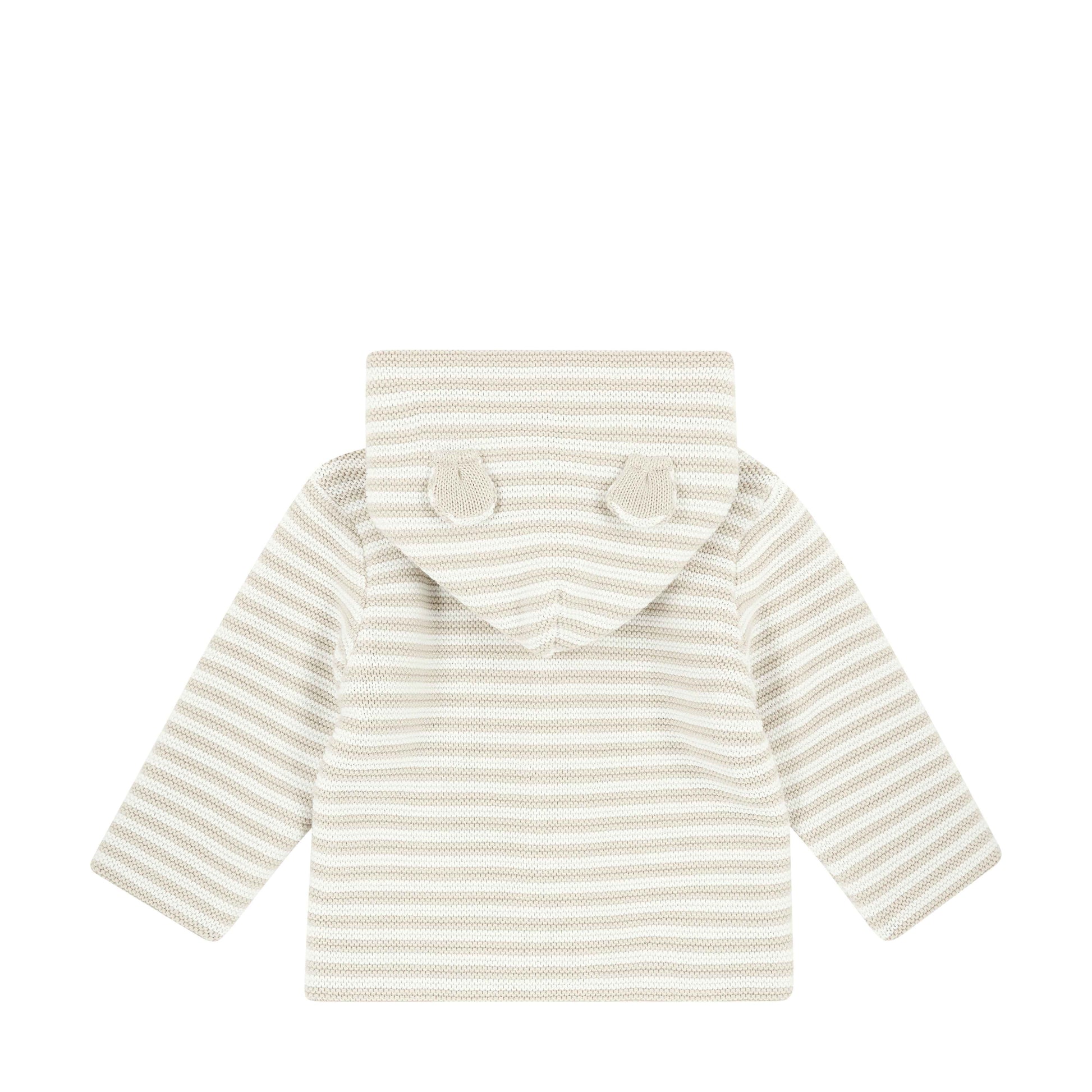 Die große Kapuze mit süßen Öhrchen und weichem Jerseyfutter sorgt für extra Geborgenheit und passt auch bequem über eine Mütze. Die klassischen Streifen machen die Jacke zu einem zeitlosen Hingucker – perfekt für Alltag und besondere Anlässe.
