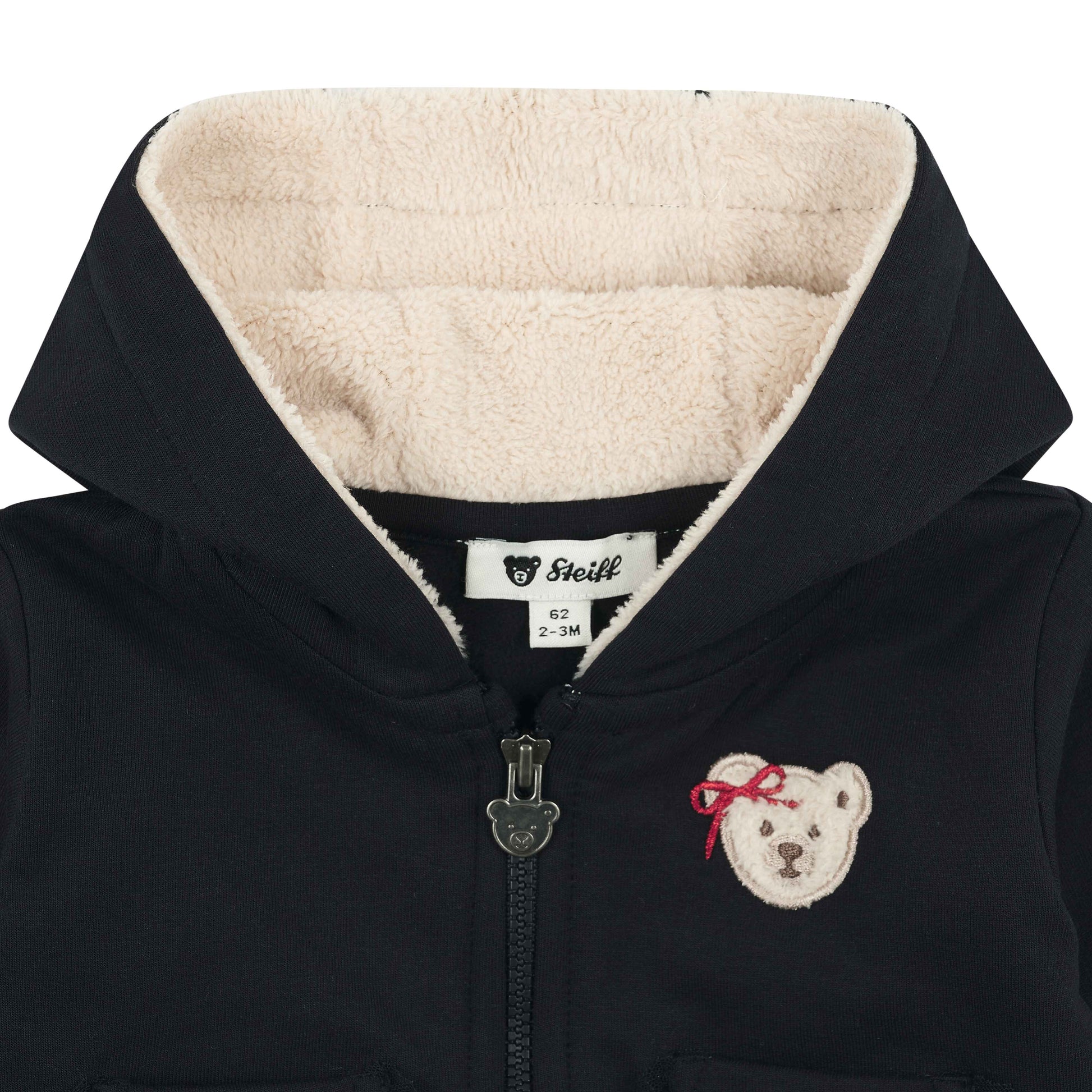 Diese kuschelige Sweatjacke aus weichem Single Jersey ist wie gemacht für aktive Entdeckerinnen, die es gerne bequem und stylisch mögen. Die gefütterte Kapuze spendet angenehme Wärme an kühleren Tagen, während der durchgehende Reißverschluss das An- und Ausziehen erleichtert. Liebevolle Kontrastdetails am Saum und den Ärmeln setzen feine Akzente. Als charmantes Highlight ziert das klassische Steiff Teddybärmotiv mit einer kleinen Krone die Brust – ein royaler Begleiter mit Wohlfühlgarantie für jeden Tag