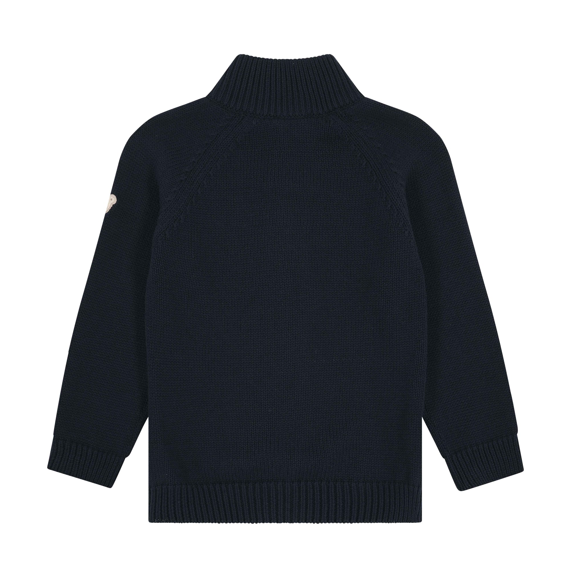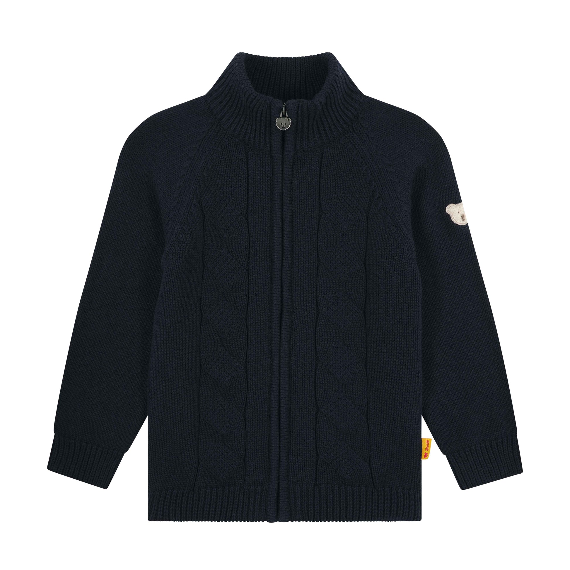 Kleine Abenteurer sind in dieser dunkelblauen Sweatjacke stilvoll und bequem unterwegs. Der weiche Baumwollstrick mit klassischem Zopfmuster auf der Vorderseite sorgt für eine edle Optik und angenehme Wärme. Ein gerippter Stehkragen sowie breite Bündchen schenken zusätzlich Geborgenheit. Der durchgehende Reißverschluss ist mit einem niedlichen Teddybär-Detail versehen und verfügt über einen praktischen Kinnschutz. Auf dem Ärmel begleitet das klassische Steiff Teddybärmotiv kleine Entdecker durch den Tag – mit Wohlfühlgarantie.