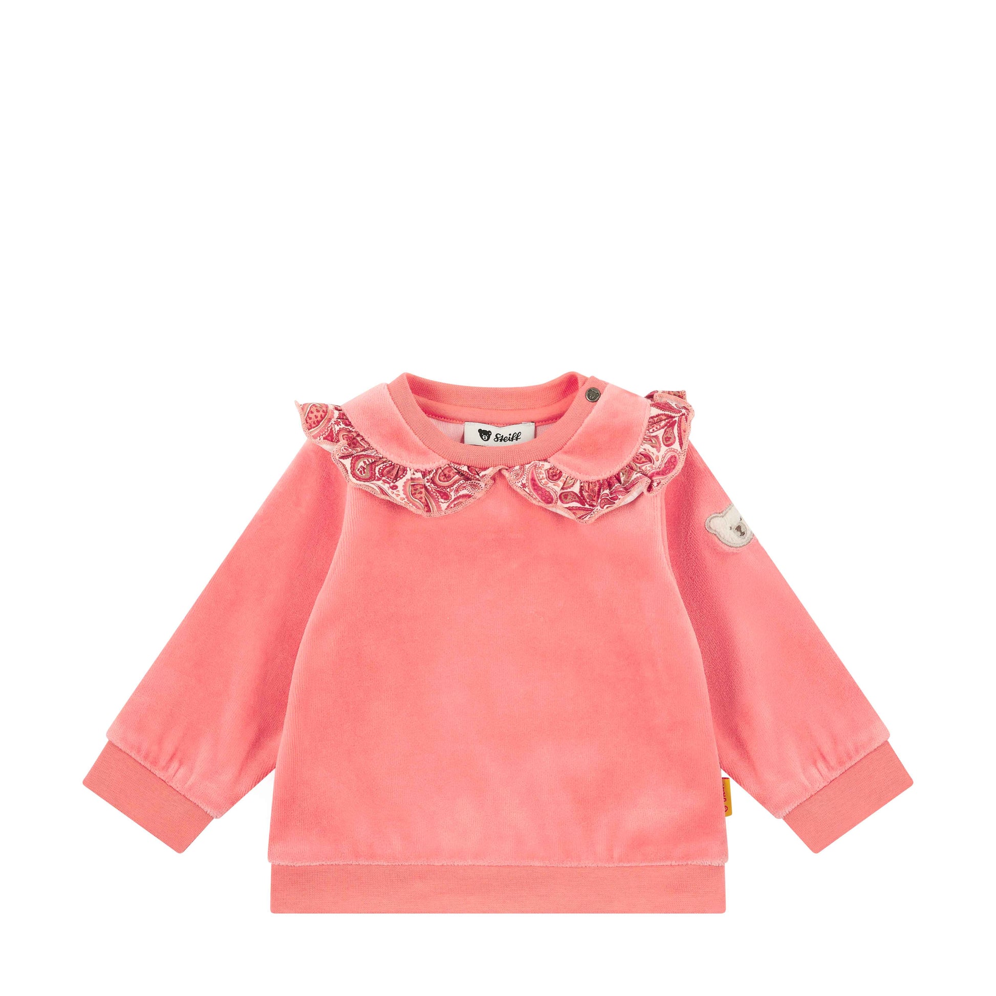 Ein Lieblingsstück für kleine Modefreundinnen: Dieses Sweatshirt aus kuscheligem Nicki Velours verbindet angenehmen Tragekomfort mit liebevollen Details. Ein Bubikragen mit zartem Rüscheneinsatz aus gemustertem Stoff setzt einen verspielten Akzent und sorgt für einen besonderen Look. Gerippte Abschlüsse schenken eine schöne Passform, während praktische Druckknöpfe an der Schulter das An- und Ausziehen erleichtern. Auf dem Ärmel begleitet das klassische Steiff Teddybärmotiv durch den Tag und vermittelt ein Gefühl von Geborgenheit.