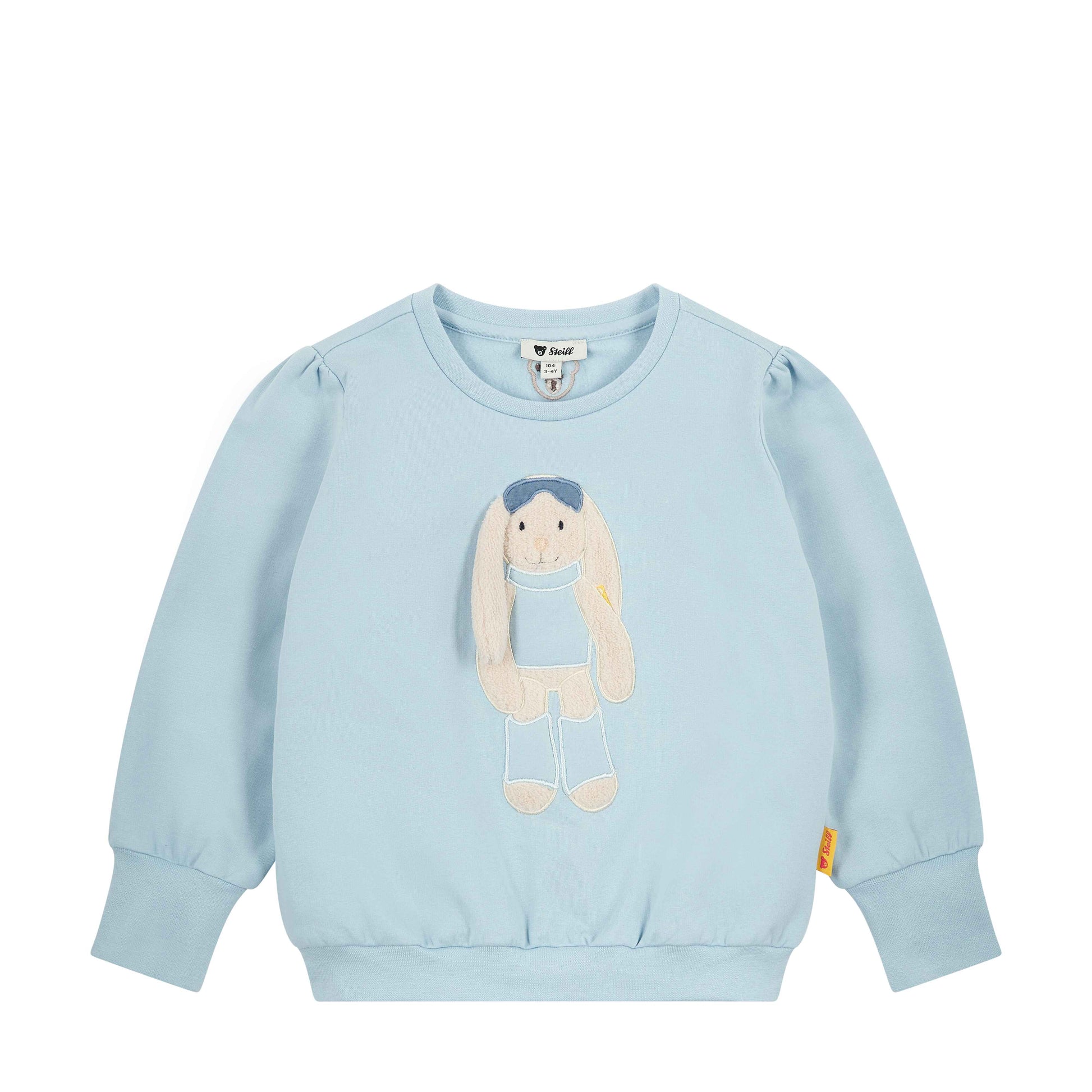 Mit seinem liebevoll gestalteten Print von Skifahrer Hoppie Hase (Artikelnummer: 080692) bringt dieses Sweatshirt winterliche Abenteuerlust in die Garderobe stilbewusster Mädchen. Das besondere Highlight: ein 3D-Hängeohr, das dem Motiv eine charmant verspielte Note verleiht. Der weiche Sweat Stoff in zartem Hellblau sorgt für ein angenehmes Tragegefühl, während die locker geschnittene Passform und leicht gepuffte Ärmel für jede Menge Bewegungsfreiheit sorgen. Rippbündchen an Ausschnitt, Ärmeln und Saum runden das Design komfortabel ab. Auf der Rückseite begleitet das klassische Steiff Teddybärmotiv kleine Schneehasen durch den Tag – mit Wohlfühlgarantie.