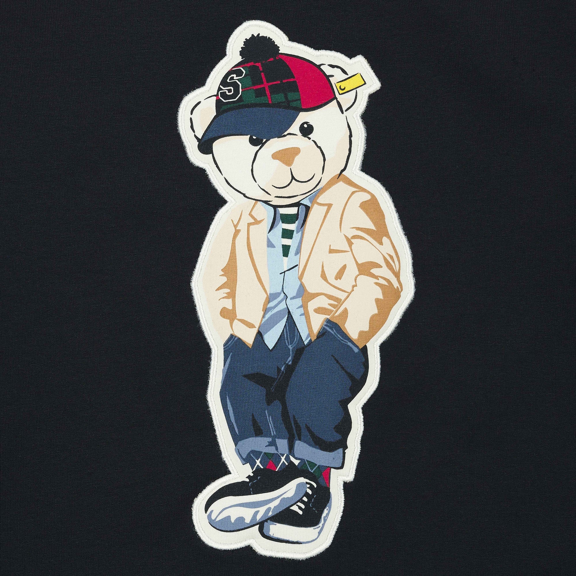 Dieses coole Sweatshirt begeistert stilbewusste Weltentdecker mit einem markanten Look und hohem Kuschelfaktor. Aus weichem Sweat gefertigt und in dunklem Blau gehalten, bietet es angenehmen Tragekomfort für jeden Tag. Die gerade Passform mit geripptem Rundhalsausschnitt und Bündchen an Ärmeln und Saum sorgt für bequemen Sitz und maximale Bewegungsfreiheit. Auf der Vorderseite setzt eine große 3D-Applikation in Form eines lässigen Teddybären mit roter Kappe einen verspielten Blickfang. Auf der Rückseite begleitet das klassische Teddybärmotiv mit einem Hauch Geborgenheit – ein Lieblingsstück für kleine Entdecker mit Stil.